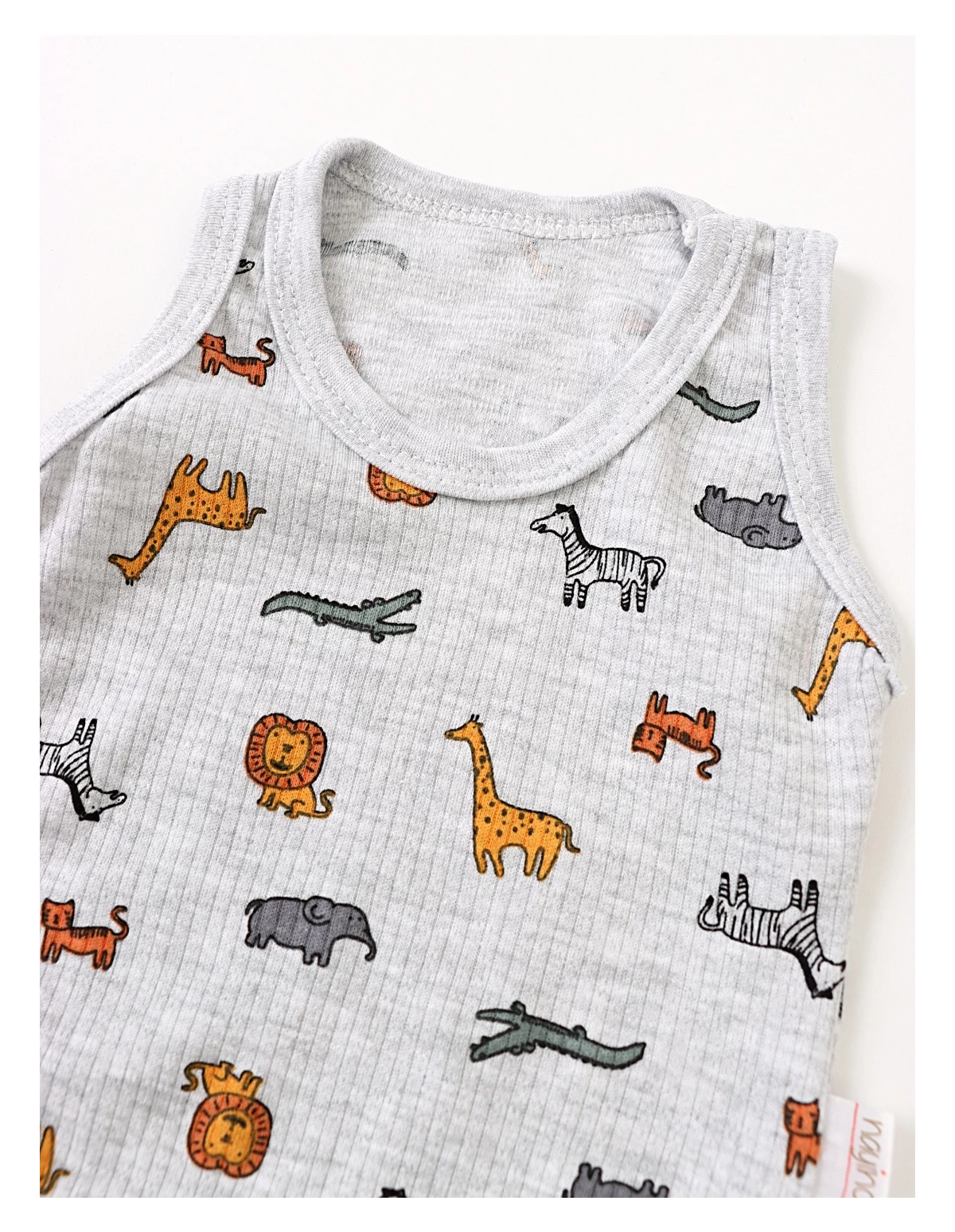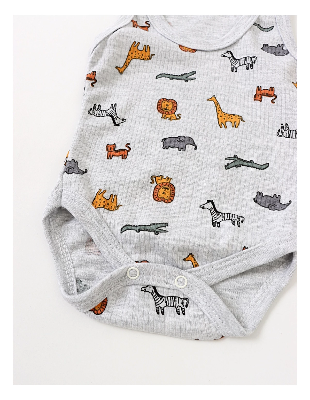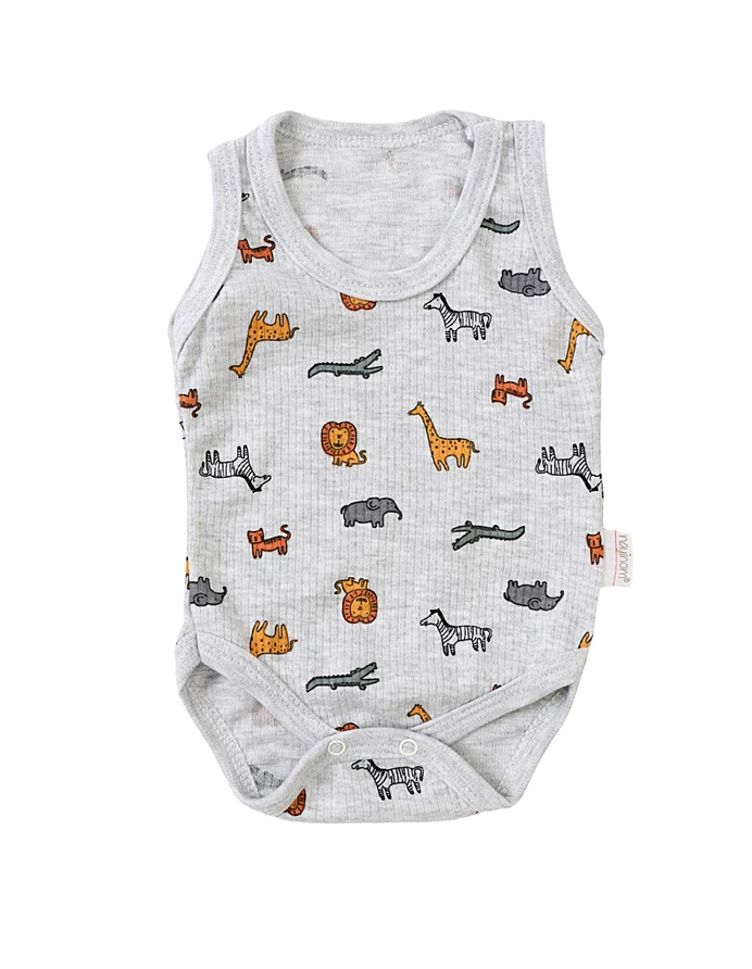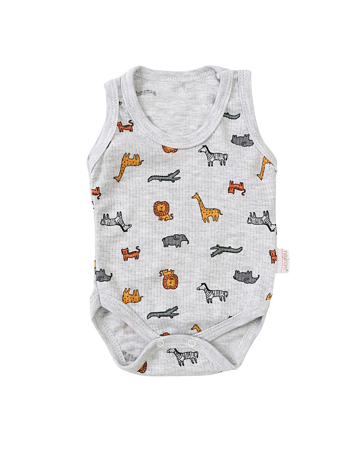 Body pentru bebeluși, stil maiou, ideal pentru zilele călduroase! Acest body cu deschidere în capse este decorat cu un imprimeu adorabil cu animaluțe, aducând un strop de veselie garderobei micuțului tău. Realizat din 100% bumbac de calitate superioară, acest body asigură confort maxim și respirabilitate pentru pielea delicată a bebelușului. Perfect pentru a fi purtat singur sau ca strat de bază sub alte articole vestimentare.