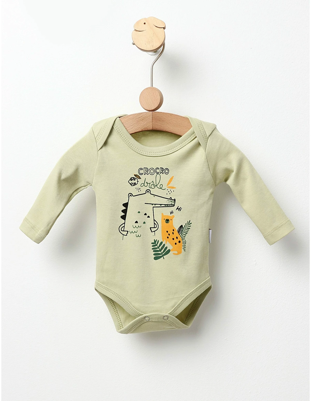 Body pentru bebeluși cu deschidere în capse, ideal pentru o îmbrăcare rapidă și practică. Acest body cu mânecă lungă, adornat cu un imprimeu jucăuș reprezentând 'Crocodilul și prietenul său', este realizat din 100% bumbac, asigurând confort și blândețe pentru pielea delicată a celor mici. Perfect pentru orice zi, body-ul combină stilul cu utilitatea, fiind un element esențial în garderoba bebelușului tău.