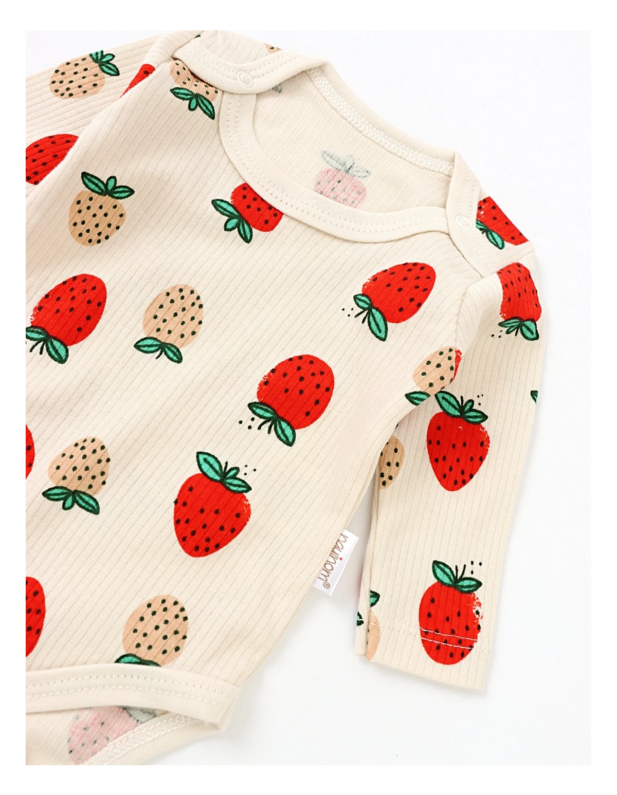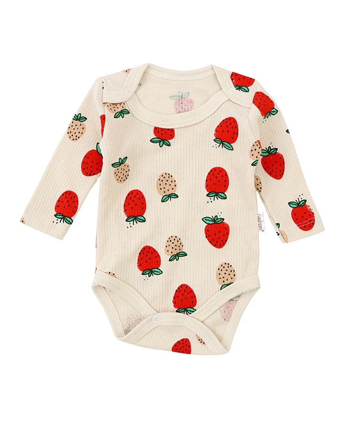 Body pentru bebeluși, ideal pentru confortul zilnic! Acest body cu deschidere în capse este decorat cu un imprimeu vesel de fructe, inclusiv capsunele, oferind un aspect jucăuș și atractiv. Cu mânecă lungă și fabricat din 100% bumbac de calitate, acest body asigură o senzație plăcută pe pielea delicată a micuțului tău. Perfect pentru utilizarea zi de zi, acest body este esențial în garderoba oricărui bebeluș.