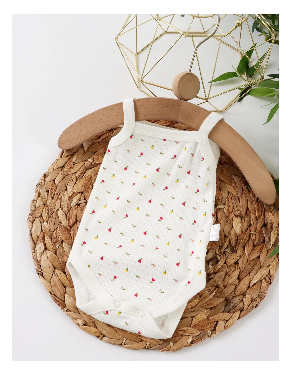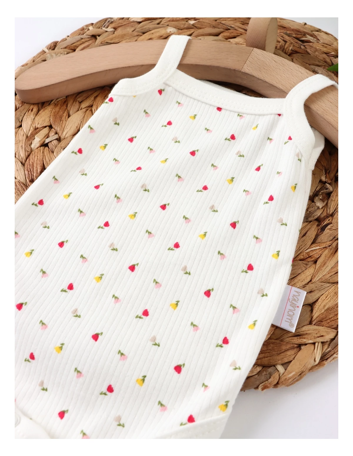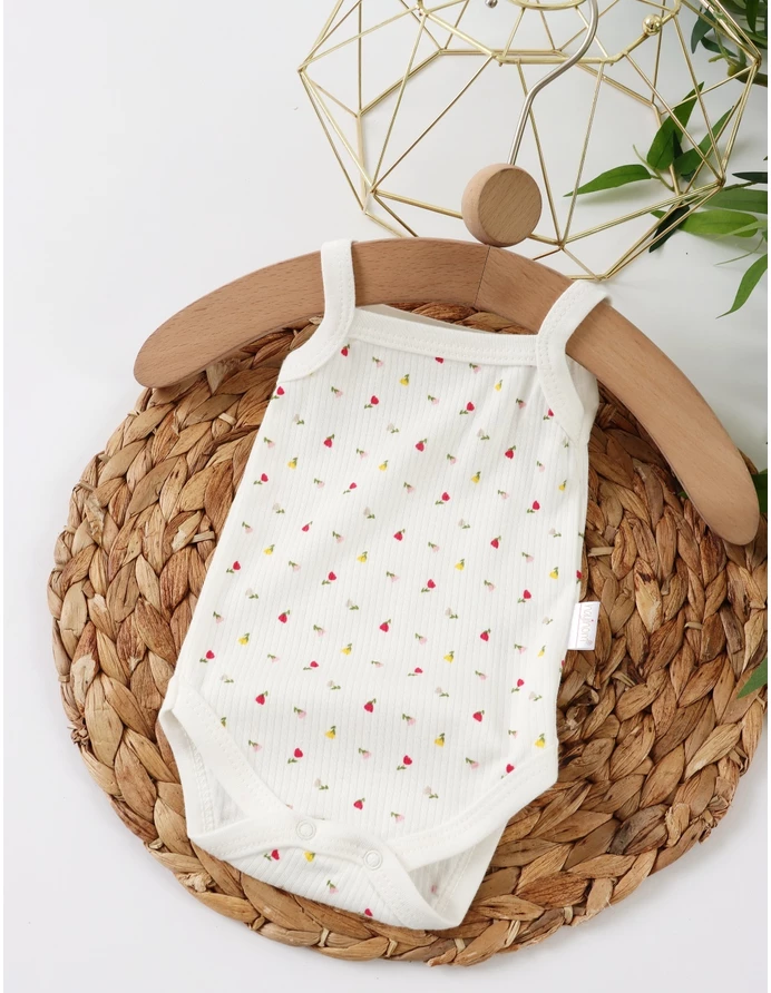 Body-ul pentru bebeluși este de tip maiou, având deschidere în capse pentru îmbrăcare ușoară. Decorat cu un imprimeu adorabil de floricele, este fabricat din 100% bumbac, asigurând confort și blândețe pentru pielea delicată a micuților. Ideal pentru zilele călduroase!