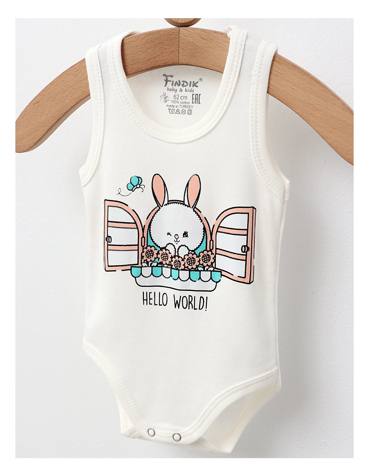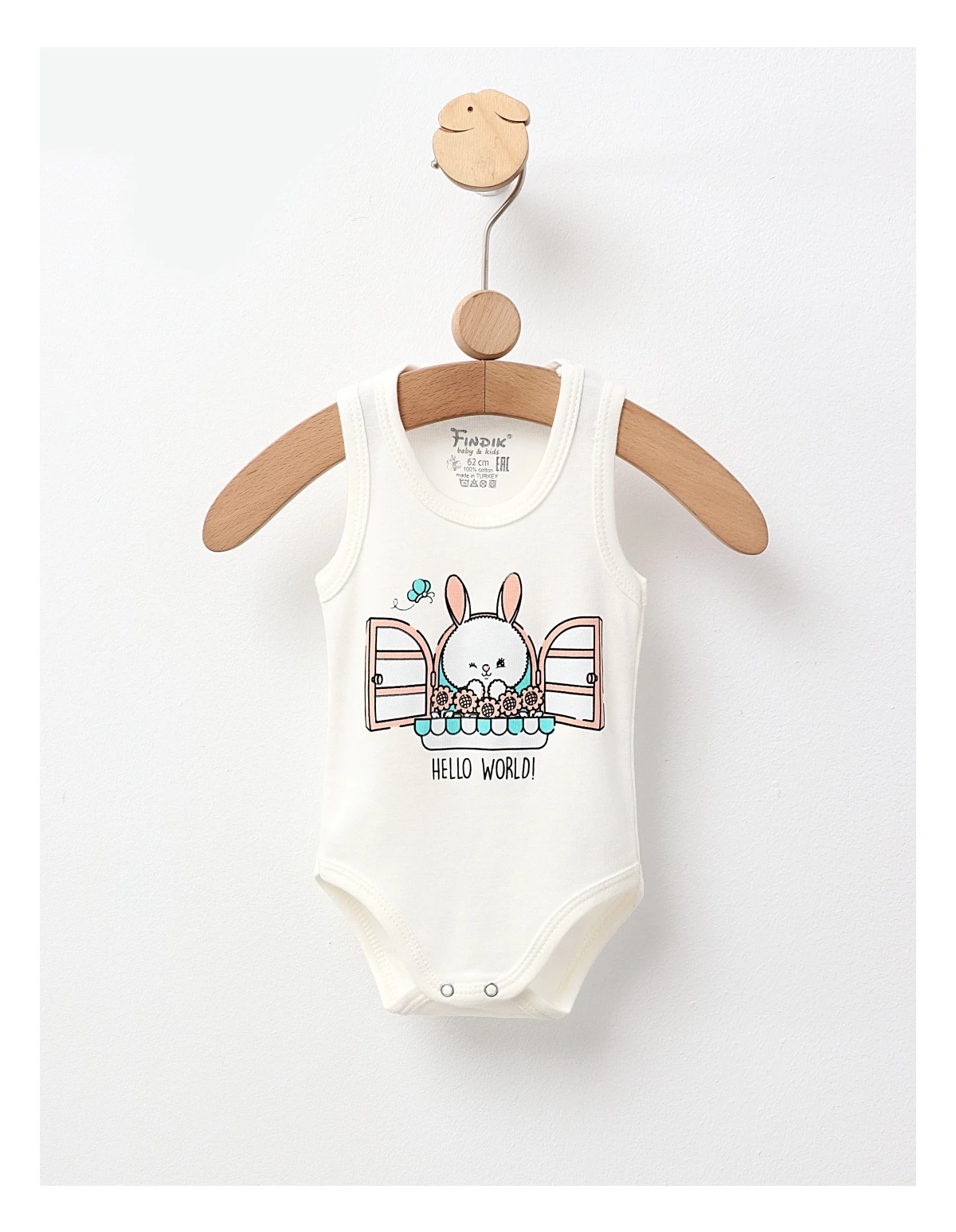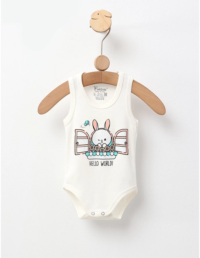 Body-ul pentru bebeluși, tip maiou, este decorat cu un imprimeu drăguț cu iepuraș și are deschidere în capse pentru o îmbrăcare ușoară. Fabricat din 100% bumbac, acest body asigură confort și blândețe pentru pielea delicată a micuților, fiind ideal pentru zilele calde!