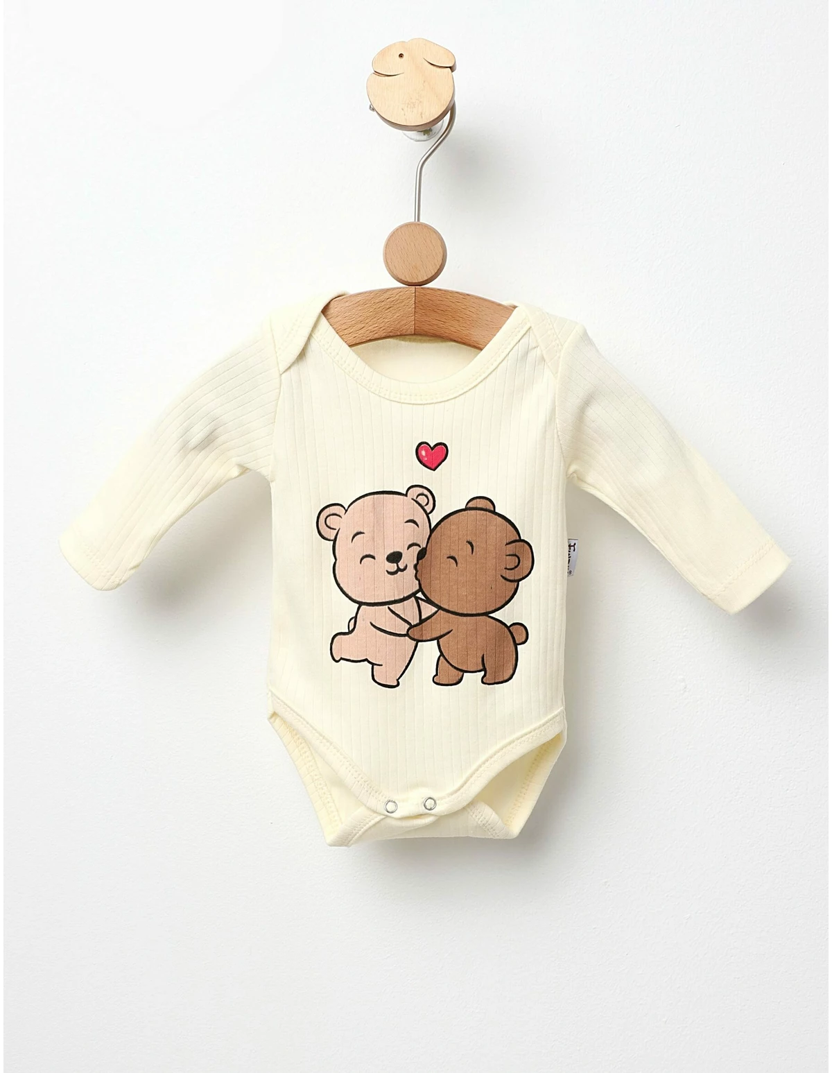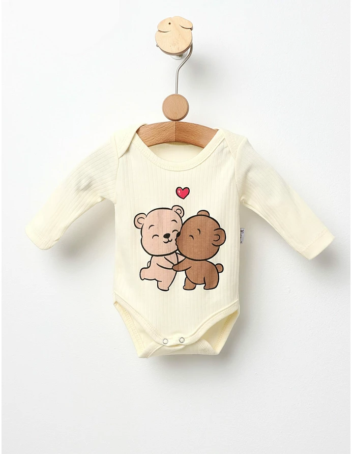 Body pentru bebeluși cu deschidere în capse, perfect pentru o îmbrăcare rapidă și comodă. Acest body cu mânecă lungă, decorat cu un imprimeu adorabil cu "doi ursuleți iubăreți", este confecționat din 100% bumbac, oferind confort și delicatețe pentru pielea sensibilă a celor mici. Ideal pentru activitățile zilnice, body-ul îmbină stilul cu functionalitatea, devenind un element esențial în garderoba bebelușului tău.