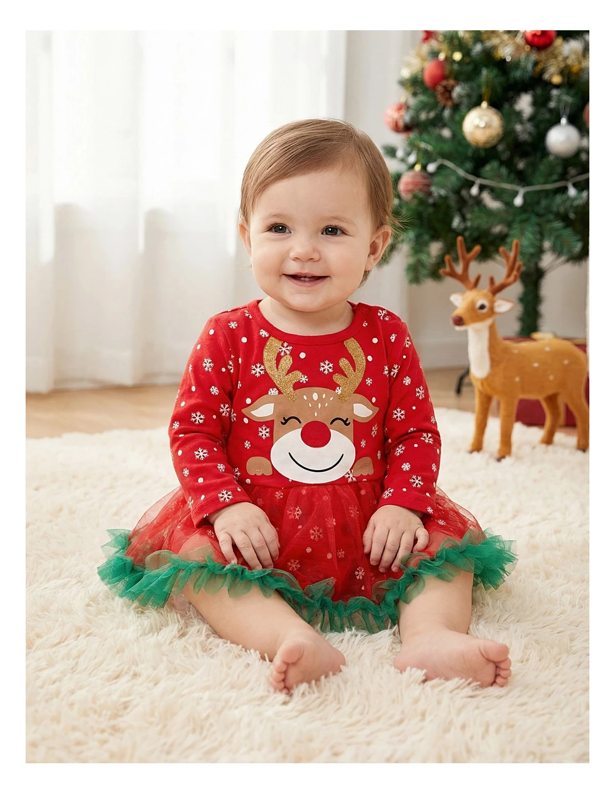 Încântă-ți micuța cu acest body stil rochiță de Crăciun, creat special pentru a aduce magia sărbătorilor în garderoba ei! Realizat din 100% bumbac, acest body oferă confort și blândețe pe pielea delicată, fiind perfect pentru activitățile de zi cu zi. Imprimeul vesel cu o căprioară strălucitoare, împreună cu fulgi de nea, transformă această piesă într-o alegere fermecătoare pentru sezonul festiv. Detaliile cu tulle și volănașe adaugă un plus de eleganță și fantezie, iar deschiderea cu capse facilitează îmbrăcarea rapidă și practică. Ideal pentru petreceri, serbări sau momente speciale alături de familie, acest body va face fiecare zi de iarnă să fie plină de bucurie și stil!