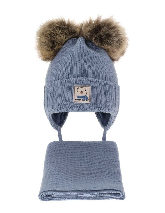 Setul de iarnă pentru băieți de la marca AGBO, realizat din 100% acrilic, include o căciulă cu două pompoane din blană ecologică și un fular circular. Căciula are un design neted, tricotat cu nervuri, și este decorată cu un patch modern. Căptușită cu fleece (100% poliester), aceasta oferă o protecție excelentă împotriva vântului, fiind ideală pentru temperaturi între -6°C și 3°C. Setul este certificat OEKO-TEX® Standard 100, asigurând confort și siguranță pentru pielea sensibilă a copilului pe tot parcursul sezonului rece.