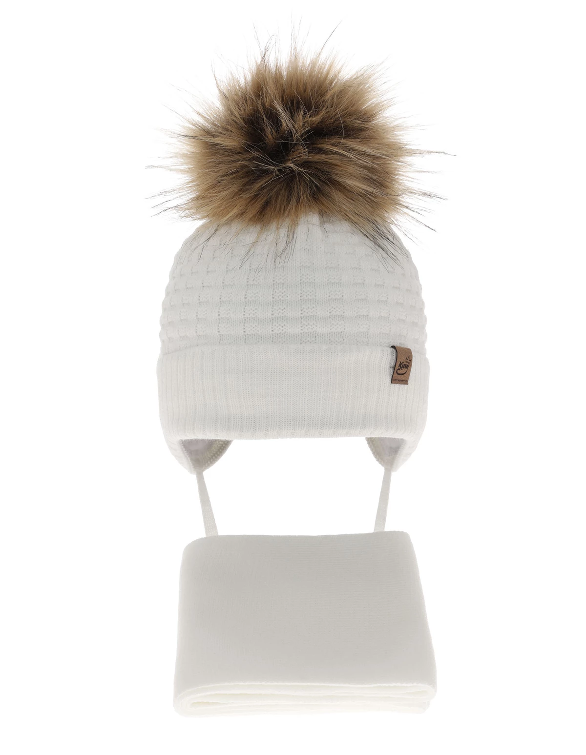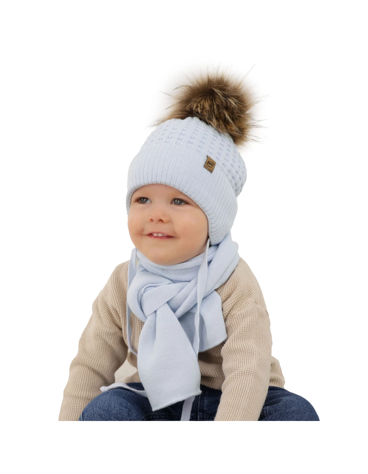 Set iarnă băieți Salem – căciulă cu șnururi și fular Setul Salem este alegerea ideală pentru băieții activi, oferind căldură și protecție în zilele geroase. Căciula cu șnururi practice este căptușită cu un strat moale din bumbac (80%) și poliester (20%), care protejează împotriva frigului și vântului, fiind delicată cu pielea copilului. Exteriorul din tricot elastic (100% acrilic, certificat OEKO-TEX® Standard 100) asigură confort și adaptare perfectă. Pomponul din blană ecologică și modelul în dungi dau un plus de stil, iar fularul asortat protejează gâtul de frig. Potrivit pentru temperaturi între -6°C și +3°C, setul Salem este practic, rezistent și elegant – ideal pentru școală, joacă sau plimbări de iarnă.