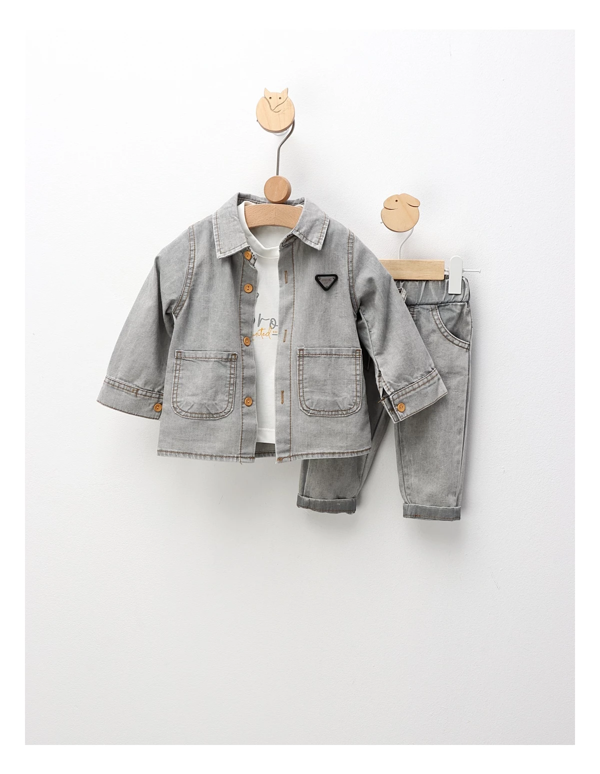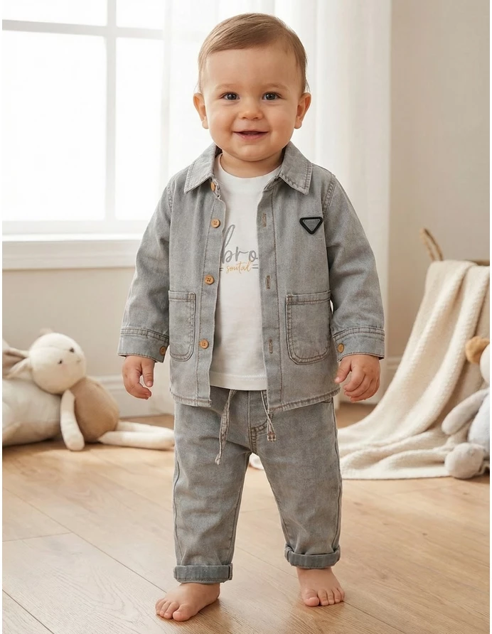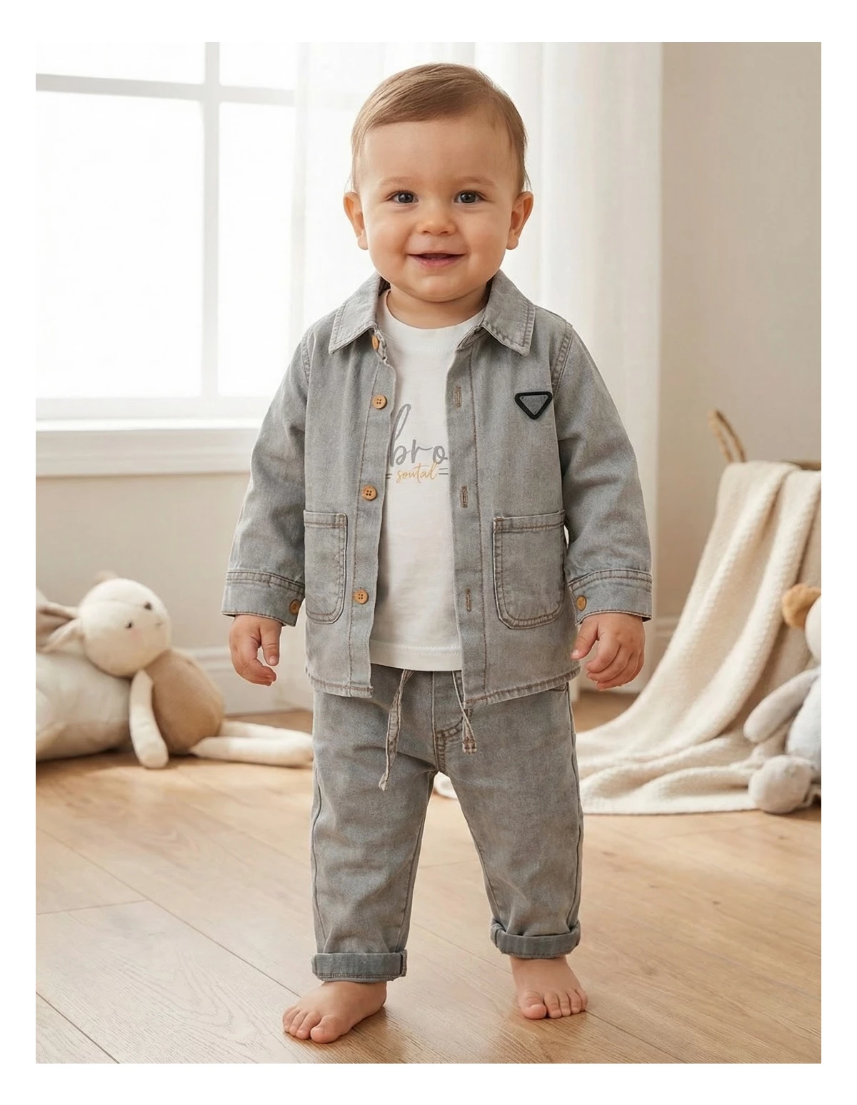 Îmbracă-ți băiețelul în acest compleu modern, perfect pentru aventurile sale zilnice! Setul include o jachetă de blug confortabilă, dotată cu buzunare practice și deschidere în nasturi, oferind un stil chic și funcțional. Tricoul asortat completează look-ul, iar pantalonii de blug cu elastic în talie asigură o potrivire lejeră și confortabilă, ideală pentru joacă. Fabricat din 100% bumbac de calitate superioară, acest compleu este moale, respirabil și prietenos cu pielea delicată a băiețelului tău. Disponibil în mărimile de la 9 la 24 luni, acest set este alegerea ideală pentru a menține micuțul tău în stil și confort pe tot parcursul zilei!