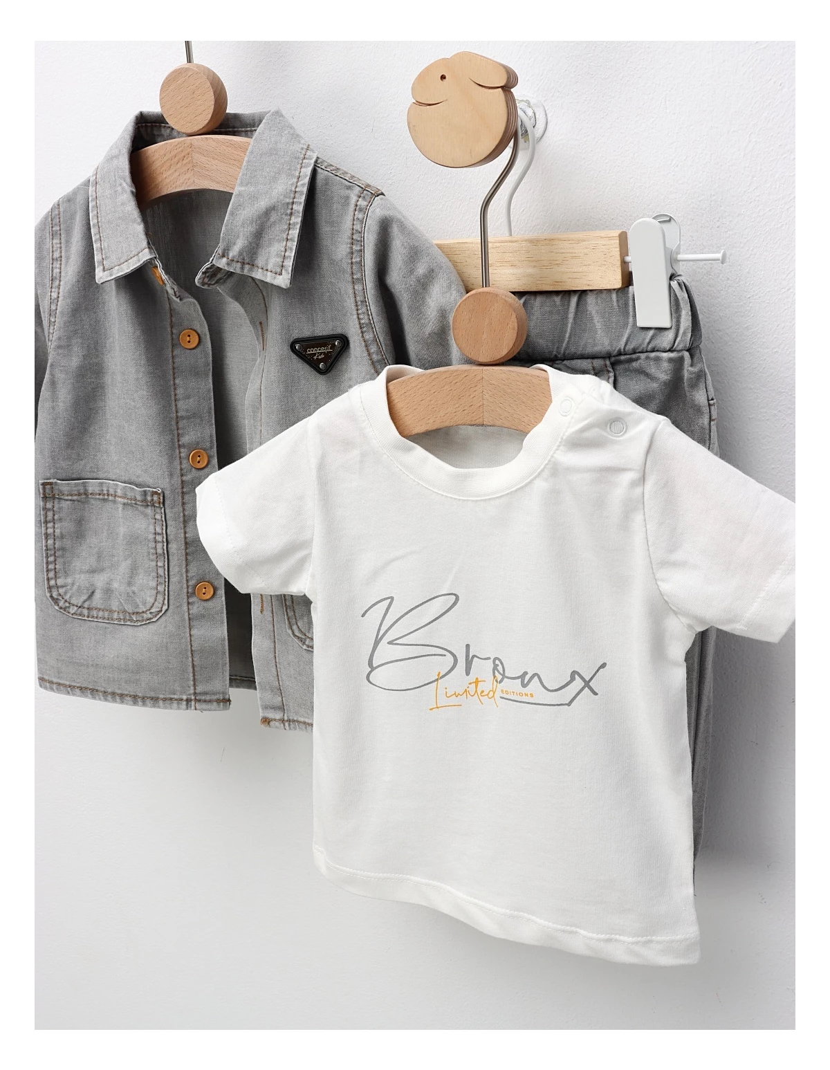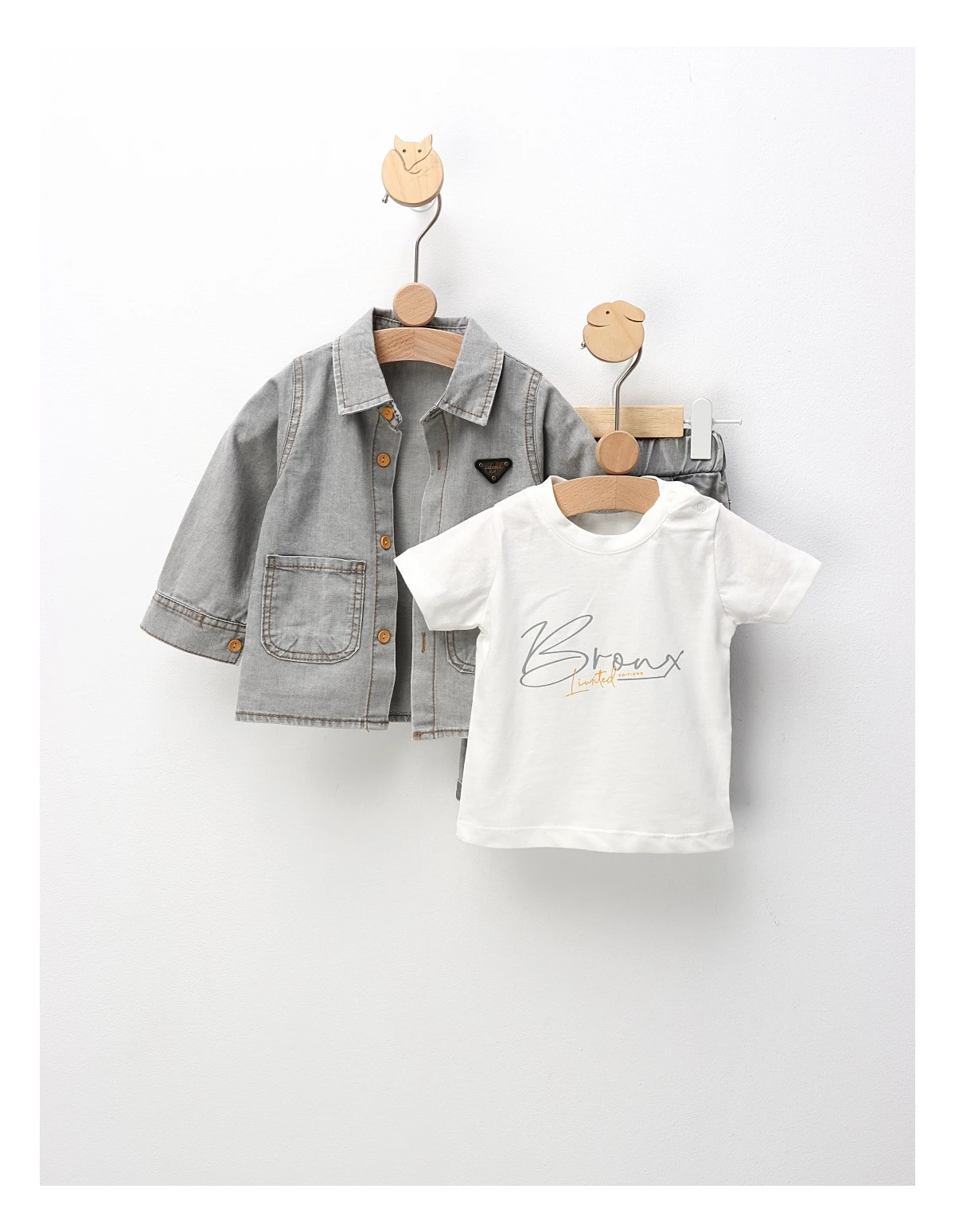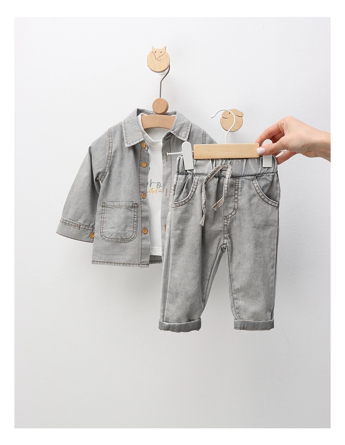 Îmbracă-ți băiețelul în acest compleu modern, perfect pentru aventurile sale zilnice! Setul include o jachetă de blug confortabilă, dotată cu buzunare practice și deschidere în nasturi, oferind un stil chic și funcțional. Tricoul asortat completează look-ul, iar pantalonii de blug cu elastic în talie asigură o potrivire lejeră și confortabilă, ideală pentru joacă. Fabricat din 100% bumbac de calitate superioară, acest compleu este moale, respirabil și prietenos cu pielea delicată a băiețelului tău. Disponibil în mărimile de la 9 la 24 luni, acest set este alegerea ideală pentru a menține micuțul tău în stil și confort pe tot parcursul zilei!