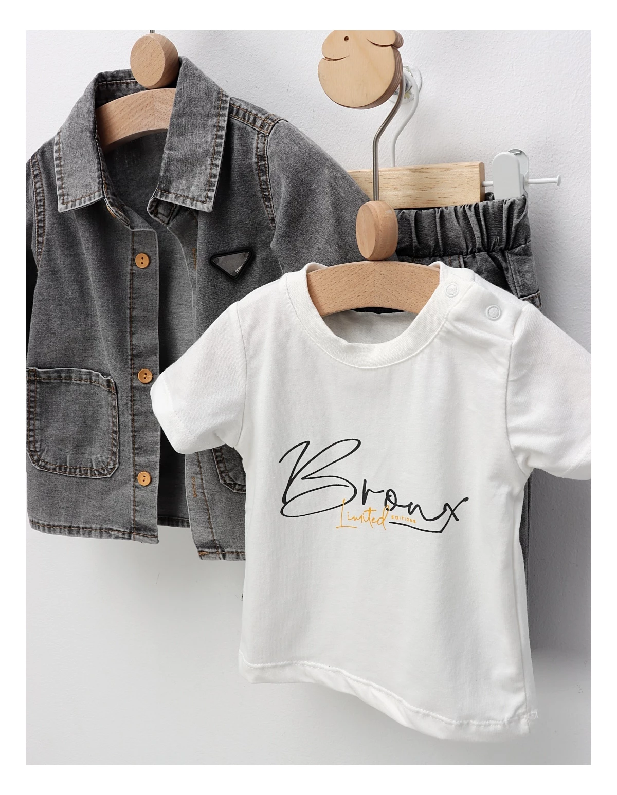 Îmbracă-ți băiețelul în acest compleu modern, perfect pentru aventurile sale zilnice! Setul include o jachetă de blug confortabilă, dotată cu buzunare practice și deschidere în nasturi, oferind un stil chic și funcțional. Tricoul asortat completează look-ul, iar pantalonii de blug cu elastic în talie asigură o potrivire lejeră și confortabilă, ideală pentru joacă. Fabricat din 100% bumbac de calitate superioară, acest compleu este moale, respirabil și prietenos cu pielea delicată a băiețelului tău. Disponibil în mărimile de la 9 la 24 luni, acest set este alegerea ideală pentru a menține micuțul tău în stil și confort pe tot parcursul zilei!
