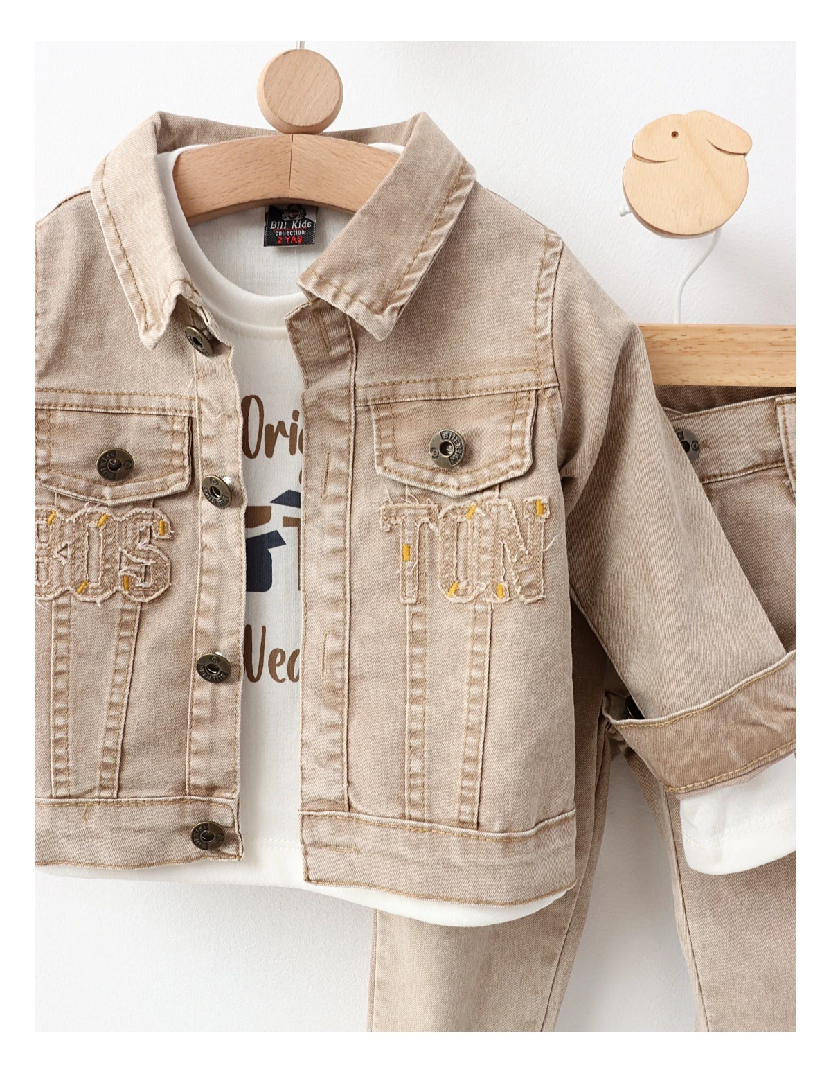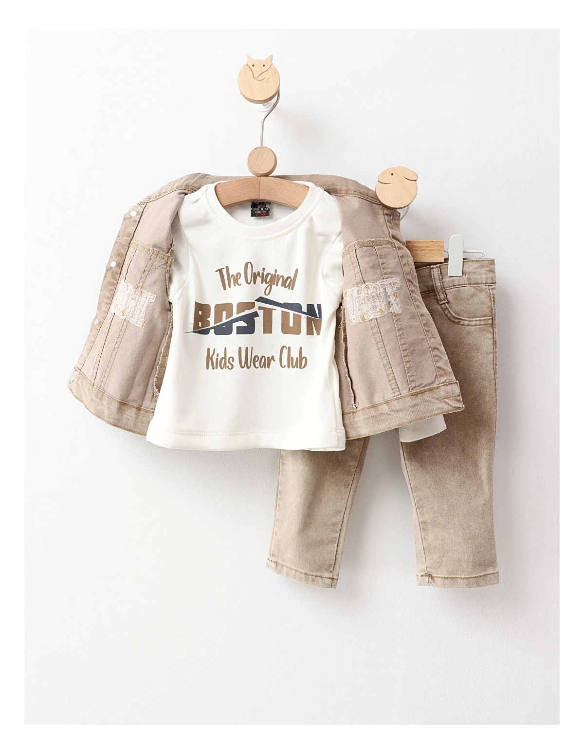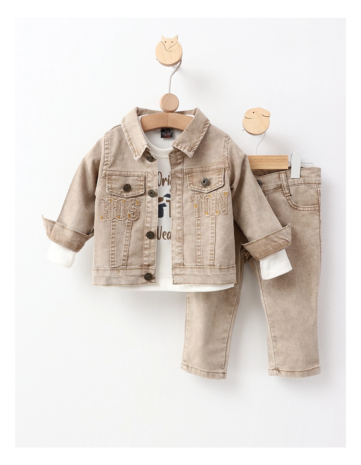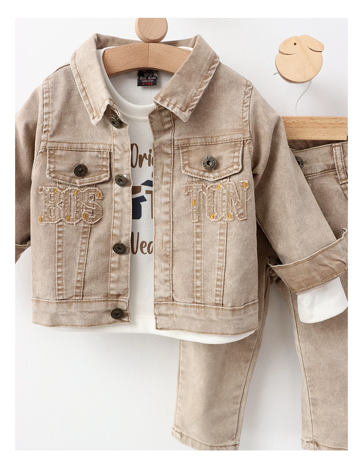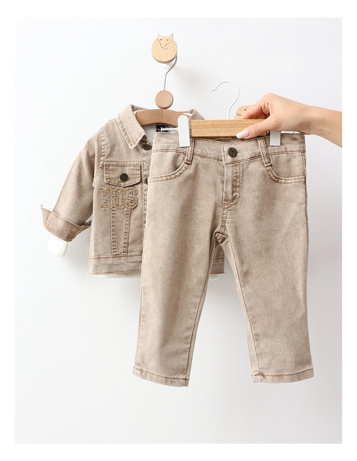 Compleu de blug pentru băieței, perfect pentru a adăuga un strop de stil în garderoba celor mici! Acest set elegant include o geacă cu deschidere în nasturi metalici, oferind un design chic și modern. La interior, se găsește o bluză cu mânecă lungă, asigurând căldură și confort. Pantalonașii sunt prevăzuți cu deschidere în nasture și fermoar, combinând utilitatea cu stilul. Fabricat din 100% bumbac de calitate superioară, acest compleu garantează confortul și durabilitatea necesară pentru joaca zilnică a micuțului tău.