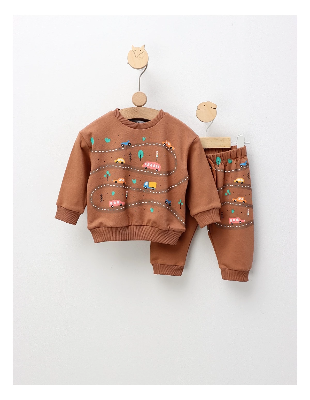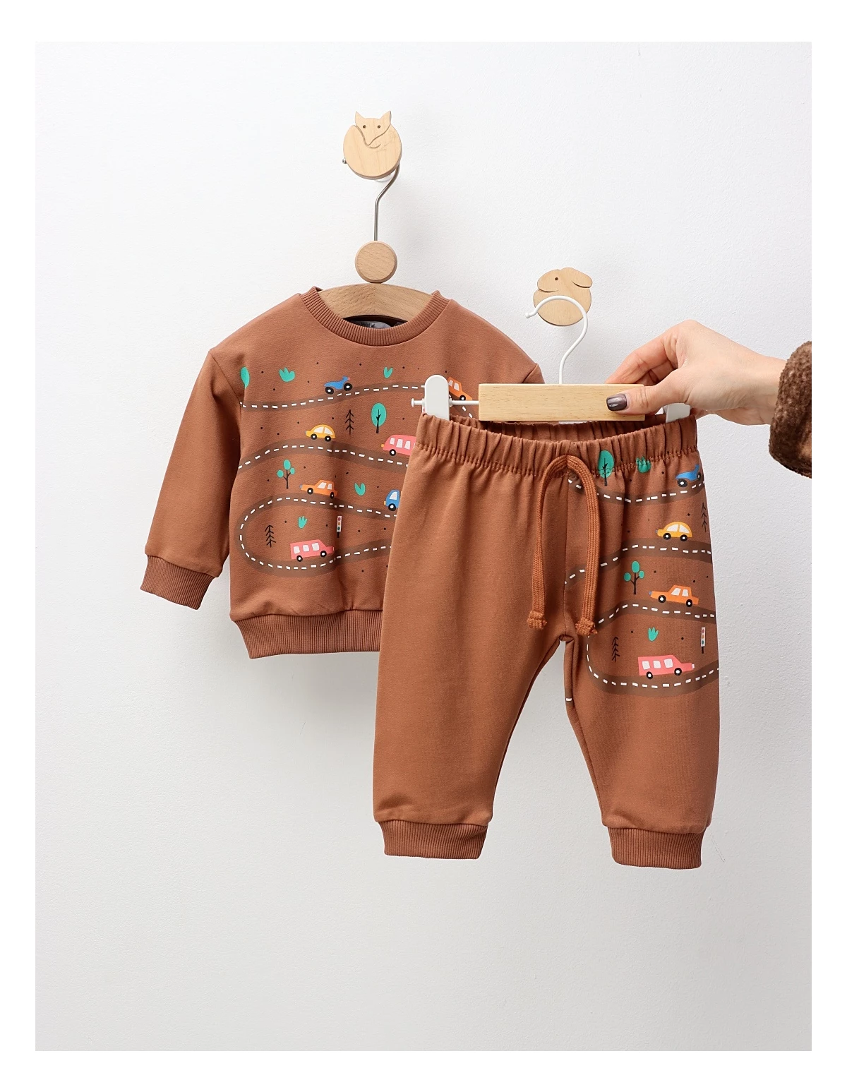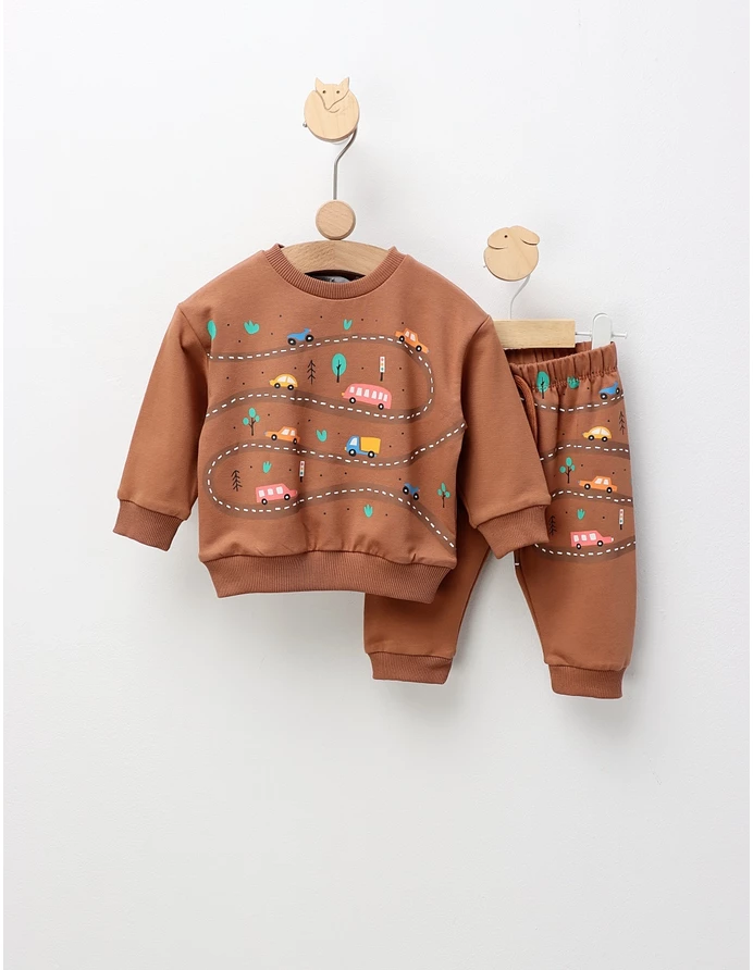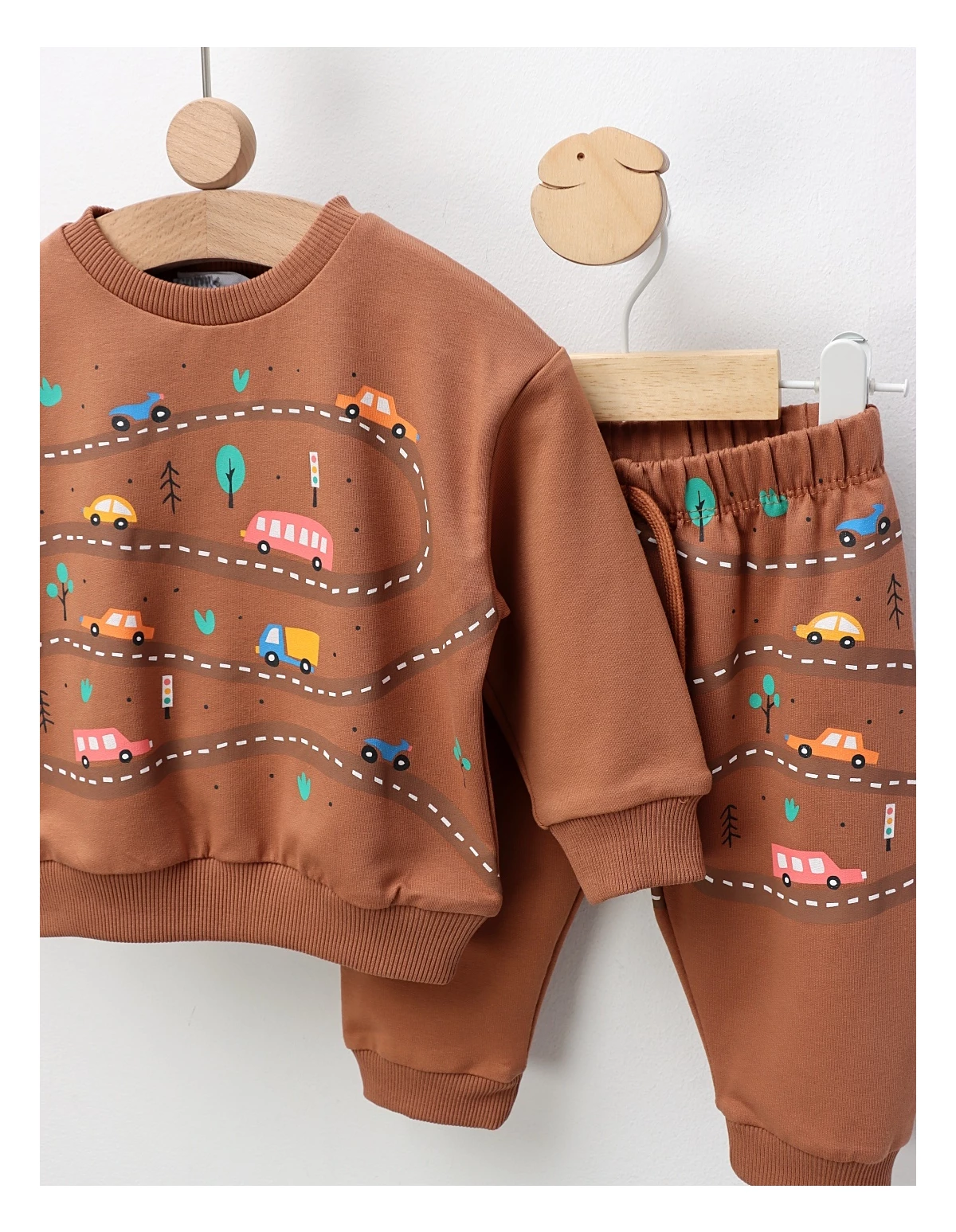 Îmbracă-ți băiețelul în acest compleu adorabil, perfect pentru micii aventurieri! Setul include o bluză confortabilă, decorată cu un imprimeu vesel ce înfățișează mașini, motociclete și autobuze în trafic, aducând un strop de distracție în ținuta lui de zi cu zi. Pantalonașii sunt prevăzuți cu elastic în talie, asigurând o potrivire ușoară și confortabilă, ideală pentru joacă. Fabricat dintr-un amestec de 95% bumbac și 5% licra, acest compleu oferă o senzație plăcută pe piele și libertate de mișcare. Fie că se joacă în parc sau se bucură de o zi de aventuri, acest compleu va deveni rapid favoritul din garderoba băiețelului tău! Marimi 9-24 luni.