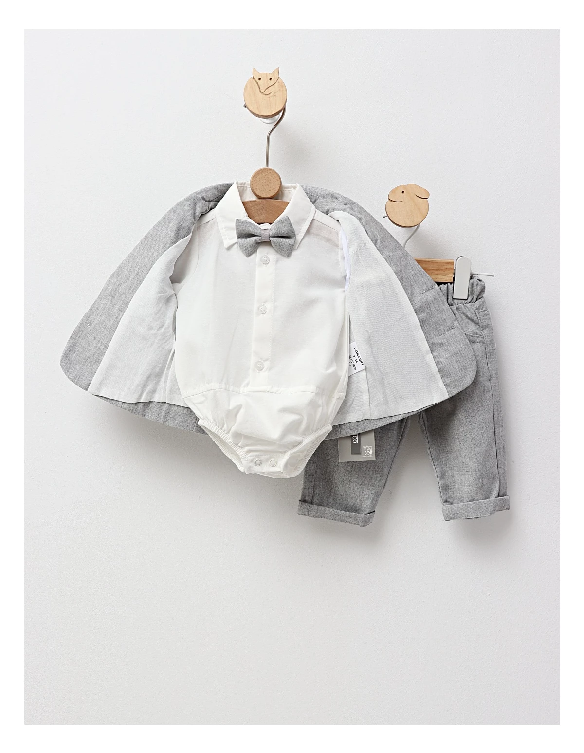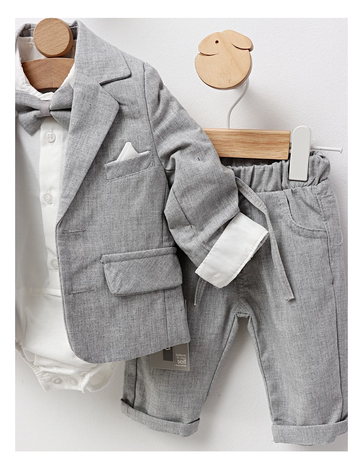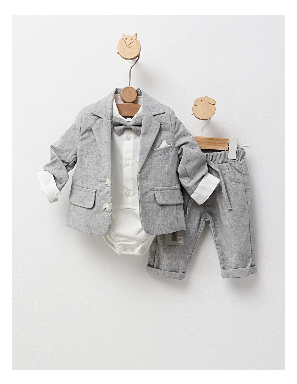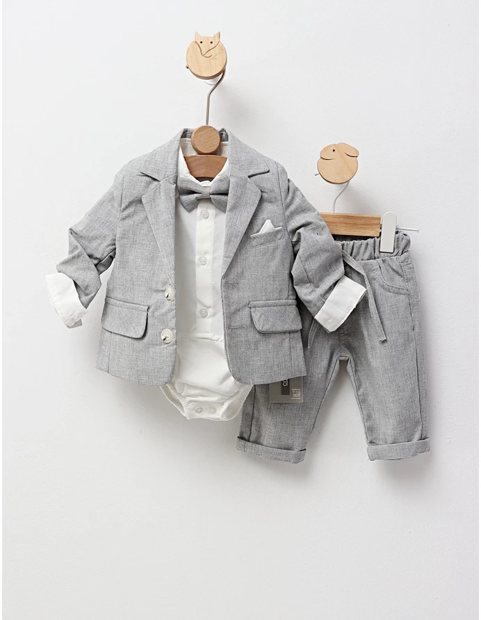 Transformă un moment special într-o amintire de neuitat cu acest set elegant pentru băieței, creat cu grijă pentru cele mai emoționante evenimente – botez, aniversări sau petreceri de familie. Setul conține un sacou cu nasturi, căptușit pe interior cu bumbac moale pentru un plus de confort, un body tip cămașă ușor de îmbrăcat, cu capse între piciorușe, un papion reglabil cu elastic și pantaloni comozi cu talie elastică și buzunare. Îmbină rafinamentul cu practicitatea, fiind realizat din materiale plăcute la atingere: 55% bumbac și 45% poliester. Un outfit adorabil, care îl va face pe micuțul tău să strălucească la fiecare pas. ?