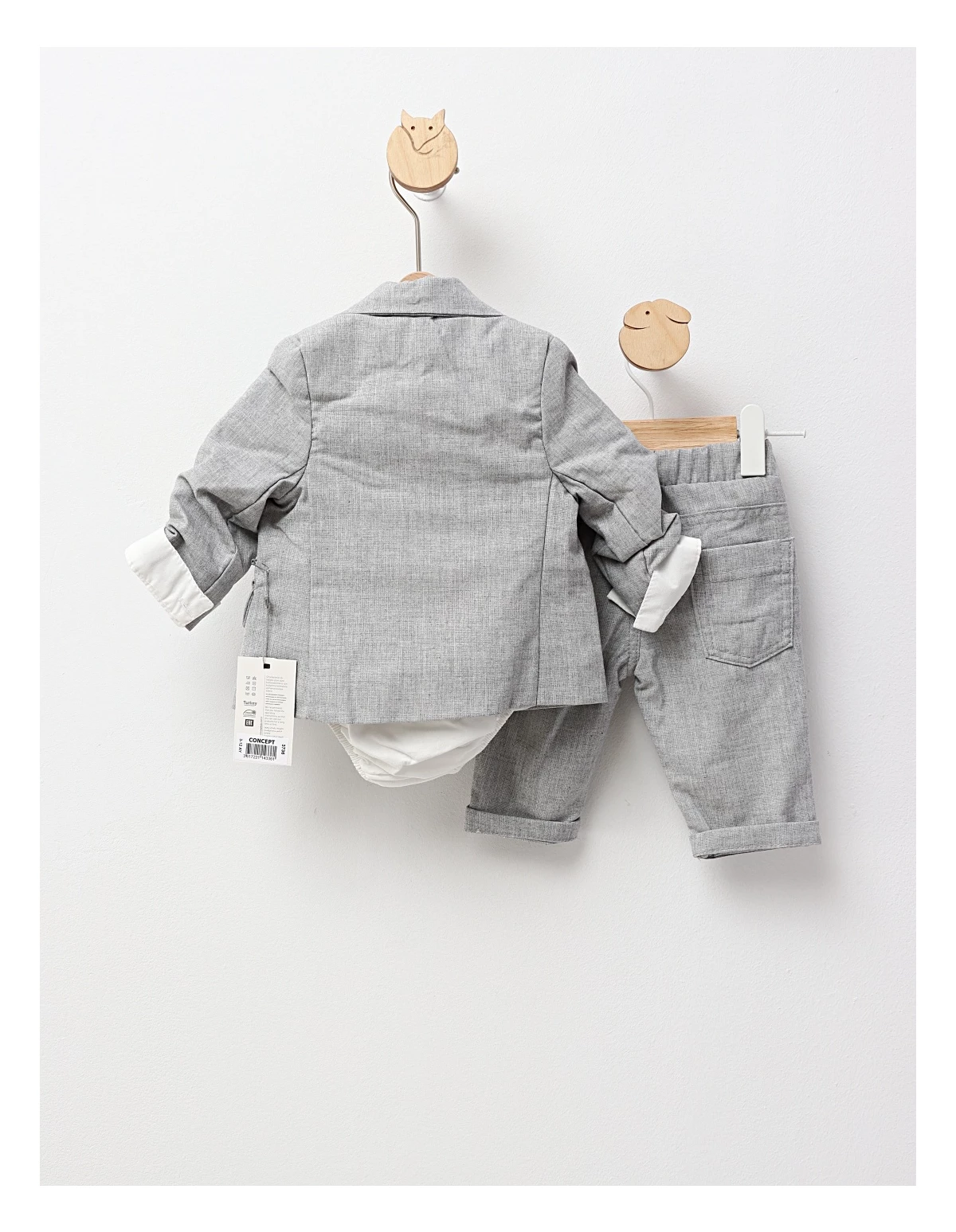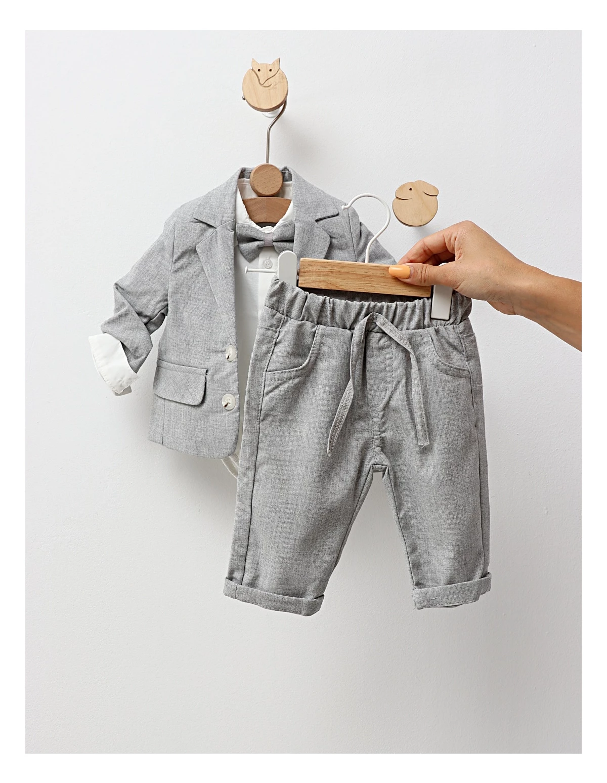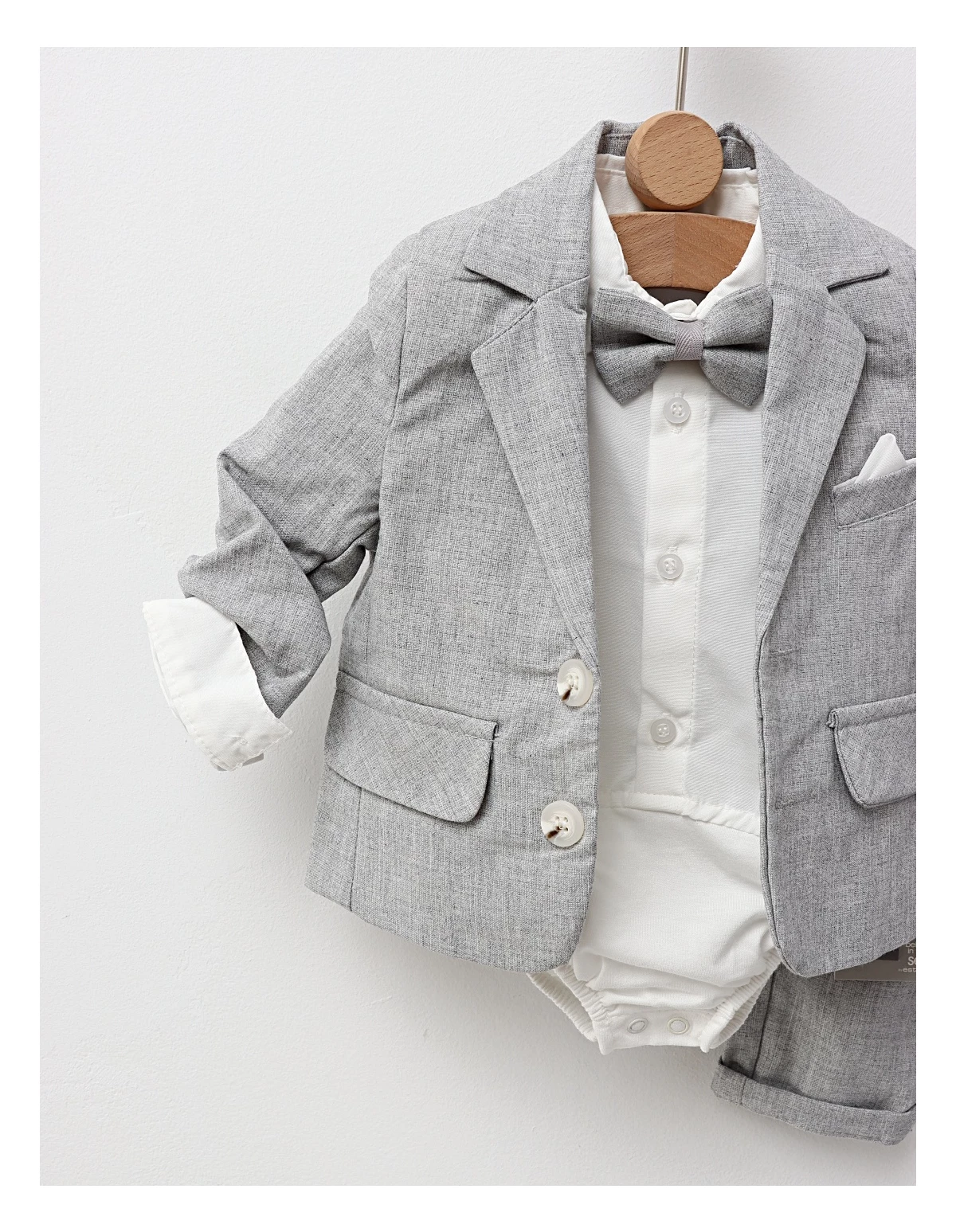 Transformă un moment special într-o amintire de neuitat cu acest set elegant pentru băieței, creat cu grijă pentru cele mai emoționante evenimente – botez, aniversări sau petreceri de familie. Setul conține un sacou cu nasturi, căptușit pe interior cu bumbac moale pentru un plus de confort, un body tip cămașă ușor de îmbrăcat, cu capse între piciorușe, un papion reglabil cu elastic și pantaloni comozi cu talie elastică și buzunare. Îmbină rafinamentul cu practicitatea, fiind realizat din materiale plăcute la atingere: 55% bumbac și 45% poliester. Un outfit adorabil, care îl va face pe micuțul tău să strălucească la fiecare pas. ?