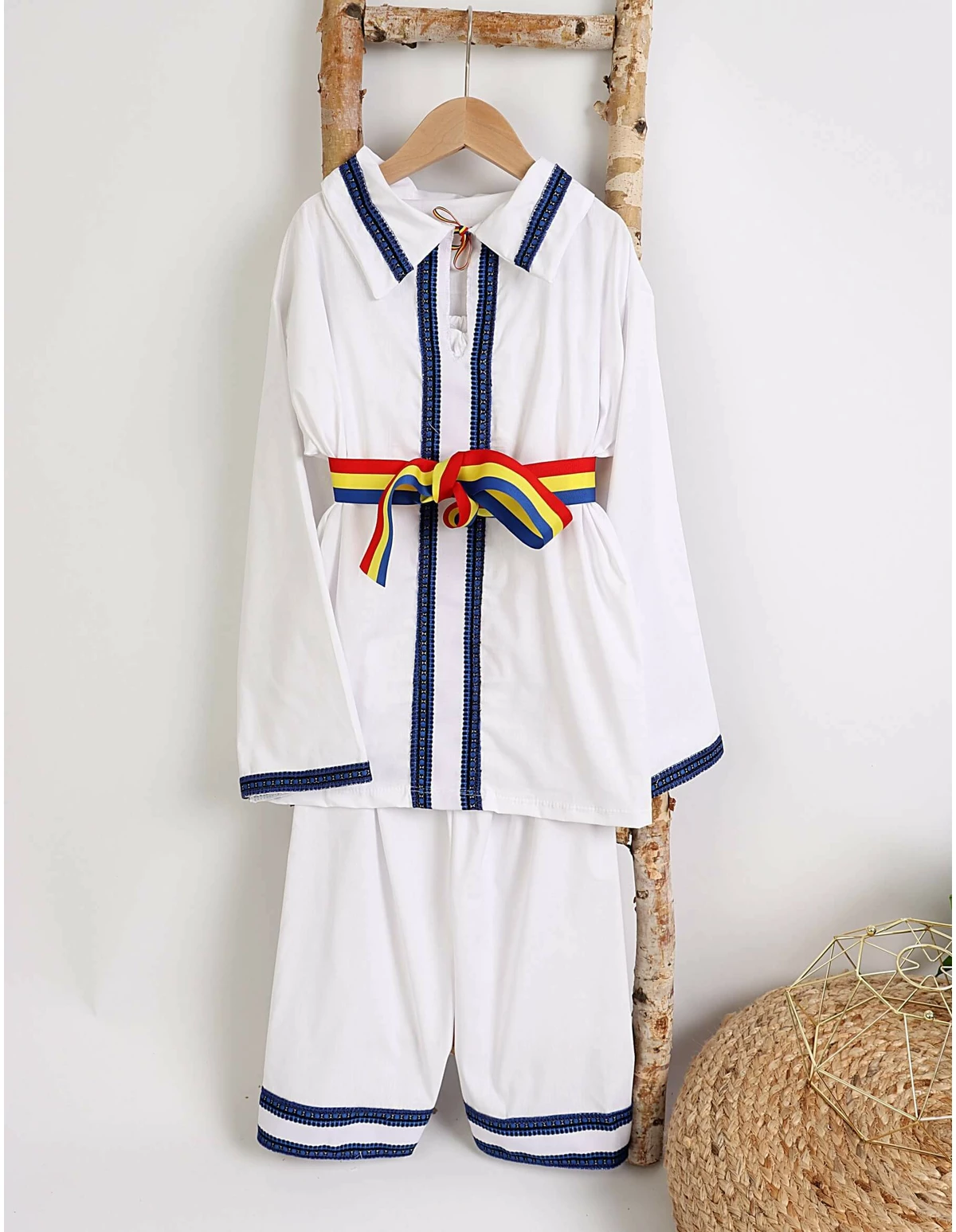 Îmbracă-ți băiețelul într-un costumas tradițional românesc, perfect pentru evenimente speciale și sărbători! Acest set este format din 3 piese: o ie cu guler decorată cu motive tradiționale, un șnur la gât cu tricolor, și pantalonași cu elastic în talie și motive specifice. Snurul de legat în talie, cu tricolor, adaugă un detaliu rafinat și autentic. Fabricat din 100% bumbac de calitate, acest costumas asigură confort și respirabilitate pentru pielea delicată a celor mici. Ideal pentru petreceri, festivaluri sau pentru a sărbători tradițiile românești, acest costumas va aduce un zâmbet pe chipul micuțului tău!
