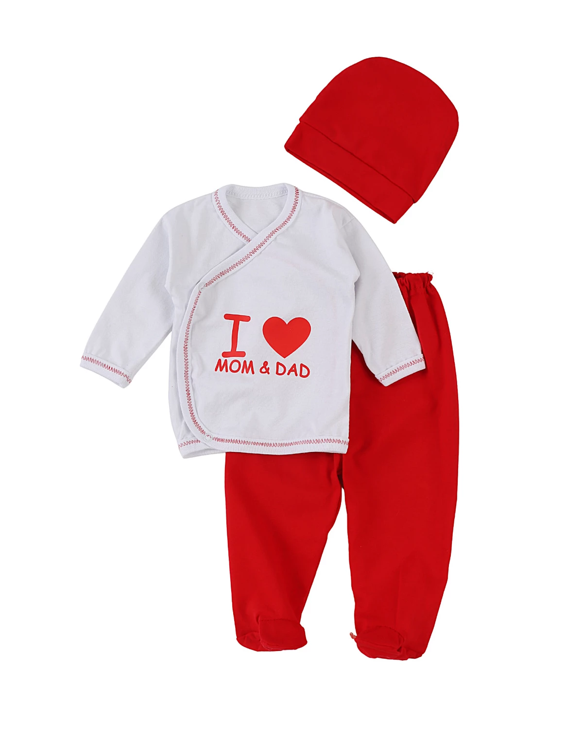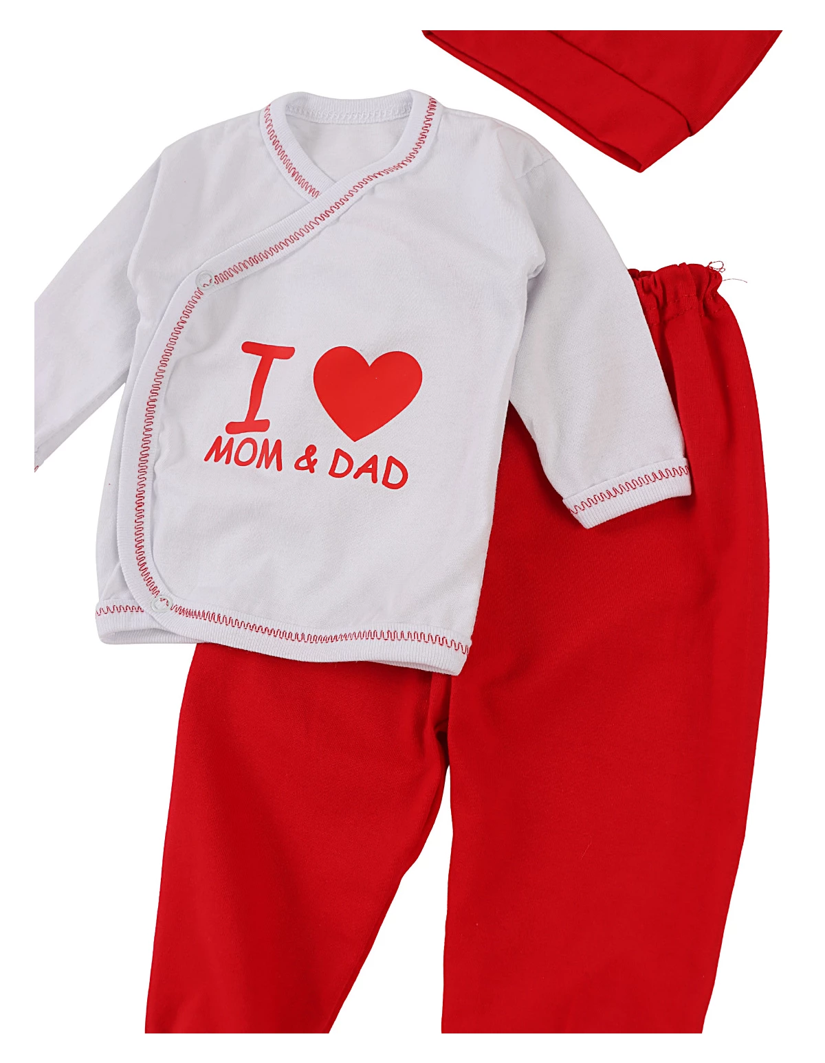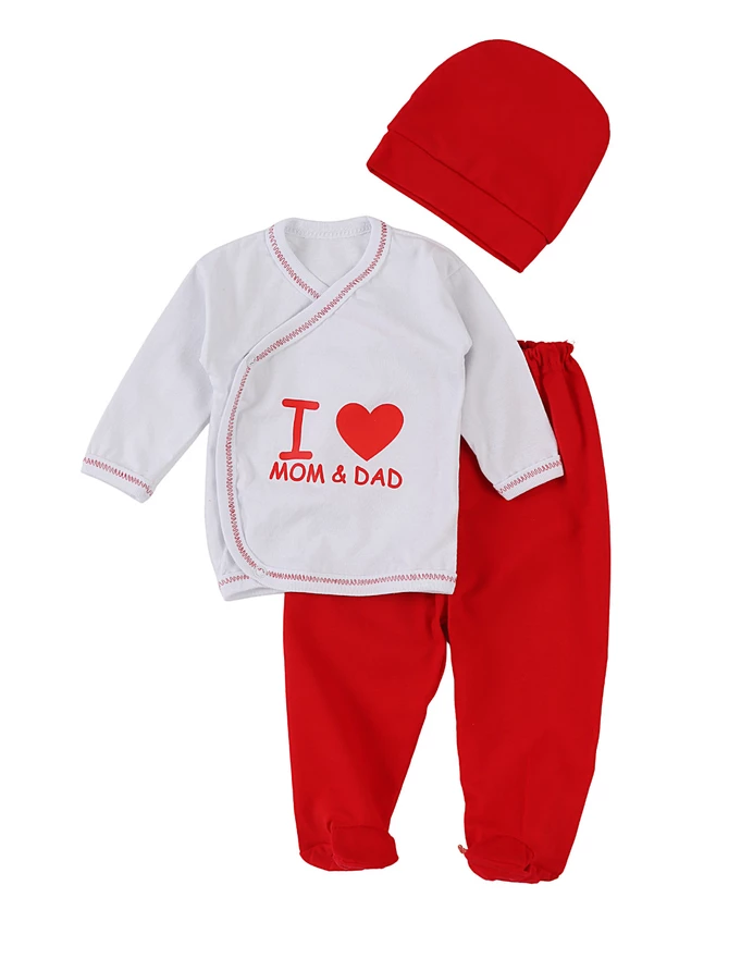 Set de 3 piese pentru nou-născuți, special creat pentru cele mai memorabile prime zile. Include o bluză cu închidere parte peste parte în capse, decorată cu mesajul „I love mom and dad”, pantaloni cu elastic în talie și botosei integrați, plus o căciuliță. Confecționat din 100% bumbac, acest set oferă confort, siguranță și un look adorabil, perfect pentru a transforma primele momente ale micuțului tău în amintiri de neuitat.