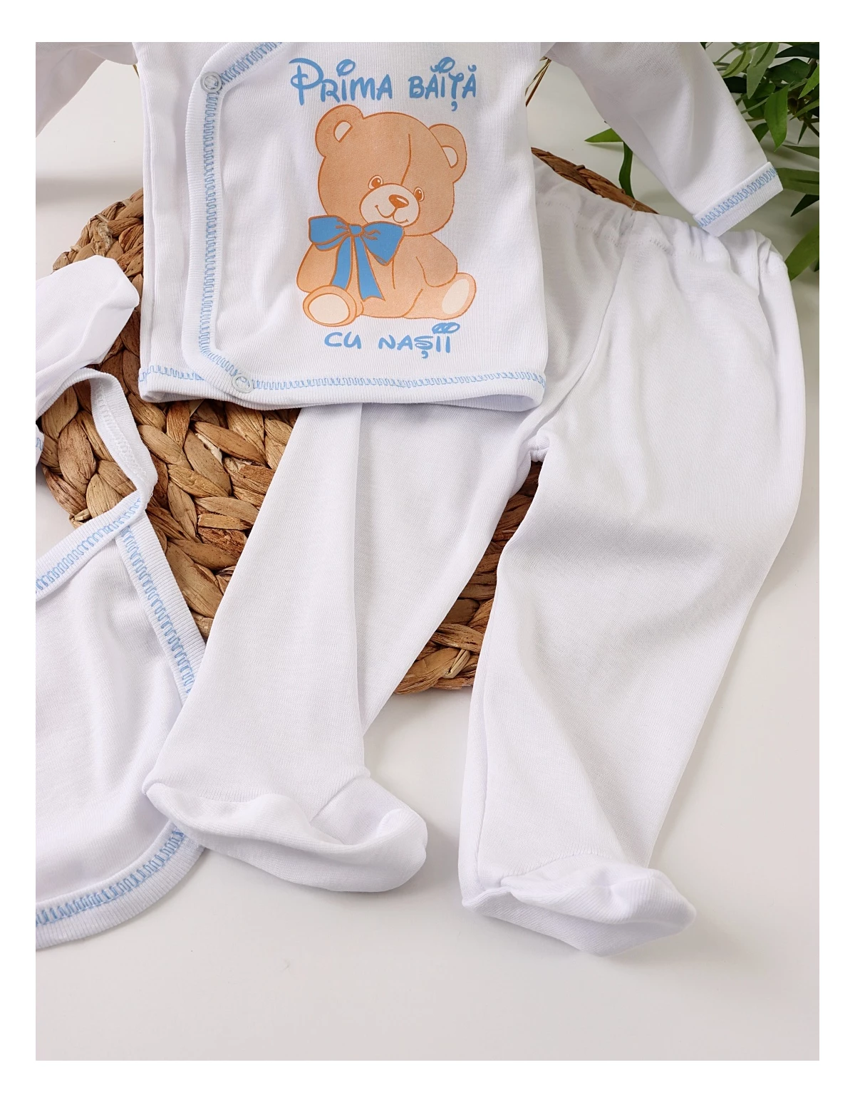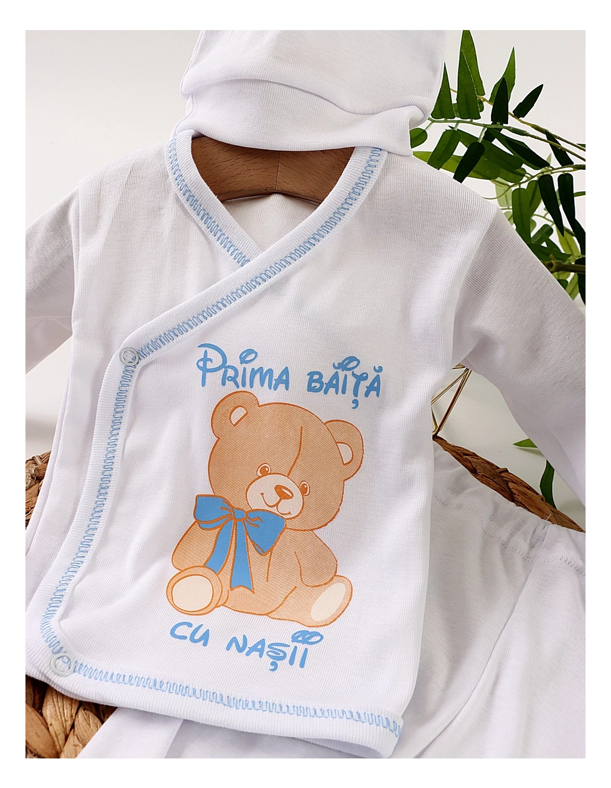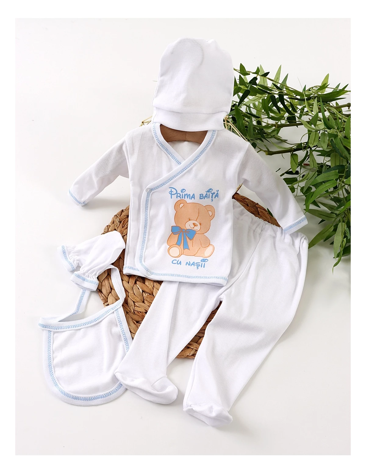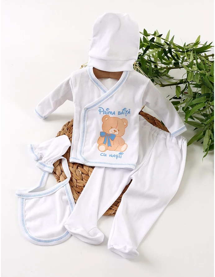Acest set delicat și confortabil este alegerea perfectă pentru primele luni de viață ale bebelușului. Fabricat în România din 100% bumbac moale, este ideal pentru pielea sensibilă a celor mici, oferind căldură și confort în fiecare moment. **Caracteristici:** - Set complet format din 5 piese: bluză cu mânecă lungă, pantaloni cu botoșei integrați, bavetă, căciuliță și mănuși - Bluza are un design practic, cu închidere laterală parte peste parte, pentru o îmbrăcare ușoară - Imprimeu frontal cu urs și mesajul „Prima băiță cu nașii” - Culoare albă, cu ursuleț maro - Material 100% bumbac, moale și plăcut la atingere Un costumaș ideal pentru un cadou special sau pentru a marca un moment de neuitat.