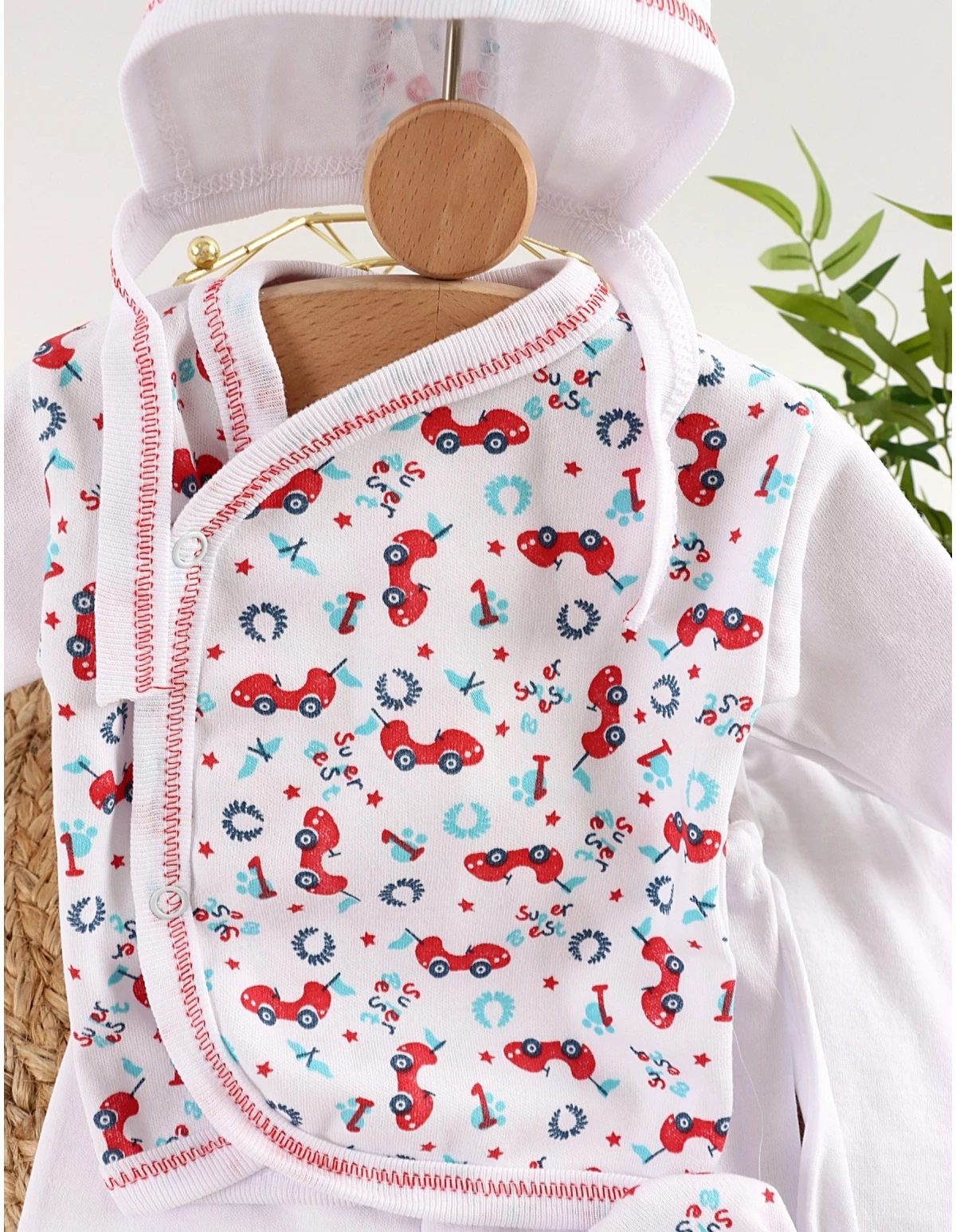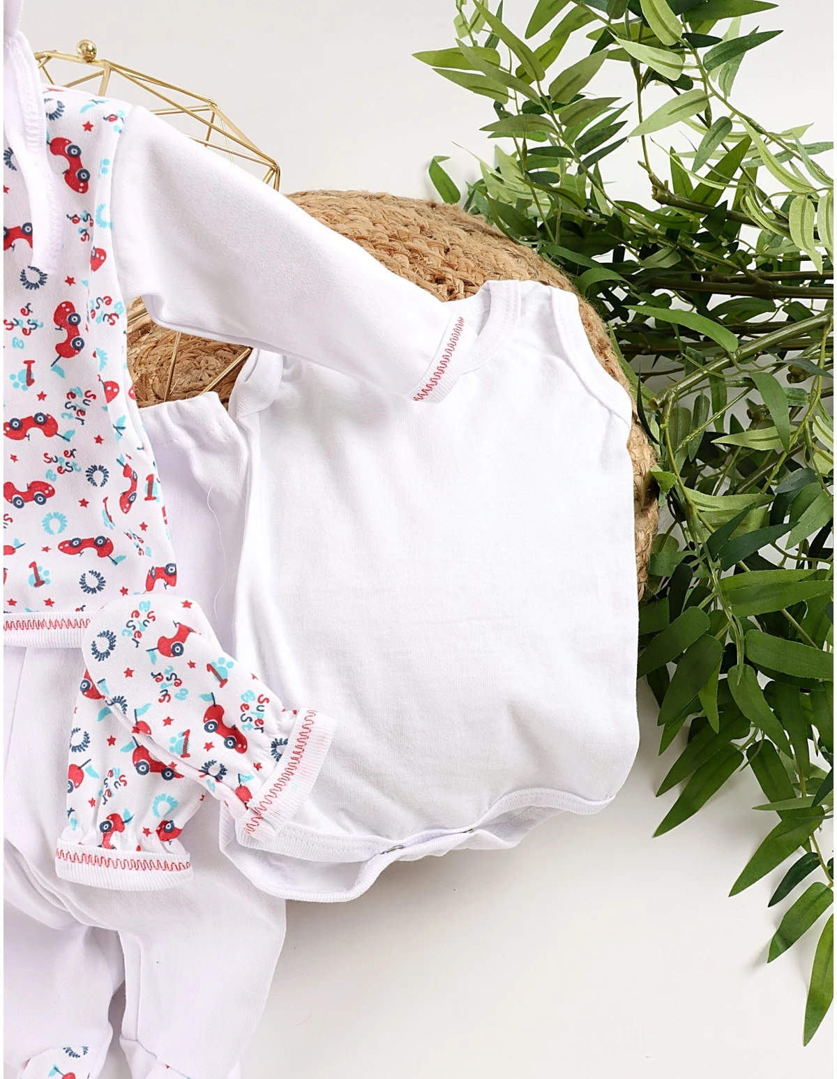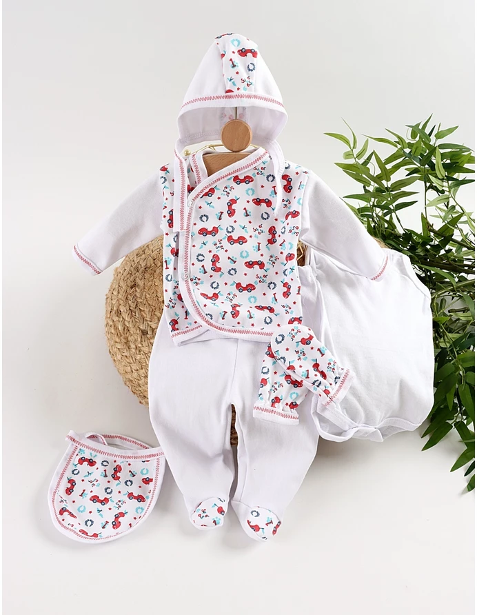 Costumas format din bluzita cu deschidere in capse, pantalonasi cu botosei, body maiou, bavetica, caciulita si manusi. Material 100% bumbac. Fabricat in Romania.