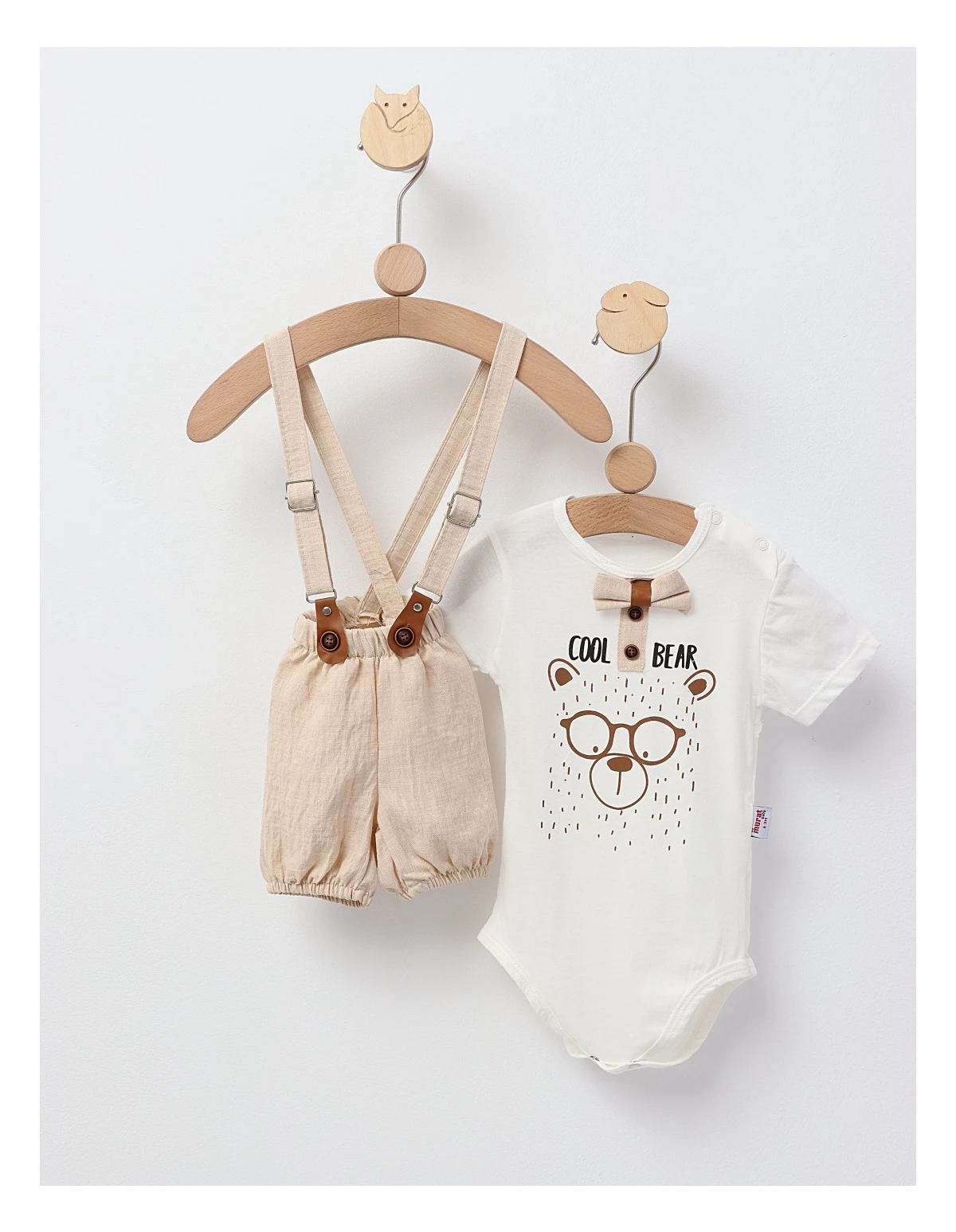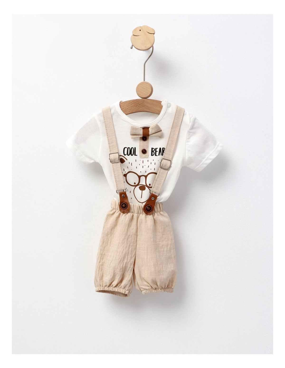 Costumul elegant pentru bebeluși include pantalonași scurți cu bretele reglabile și elastic pentru o potrivire perfectă, un body cu un papion adorabil și deschidere în capse pentru confort și ușurință în schimbare. Decorat cu un imprimeu cu ursuleț cool, toate piesele sunt realizate din 100% bumbac, asigurând confort și blândețe pentru pielea delicată a micuților. Ideal pentru ocazii speciale sau ieșiri elegante!