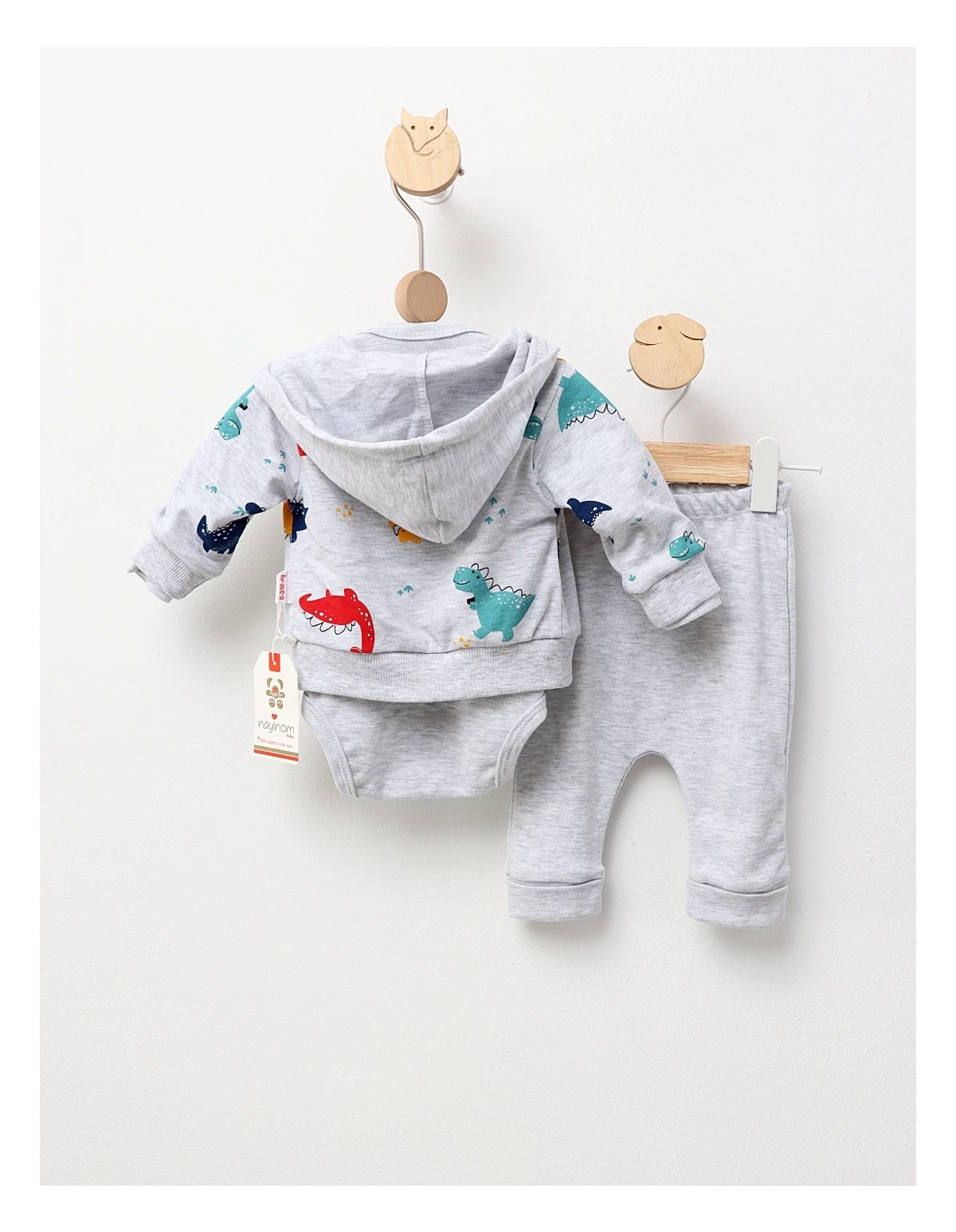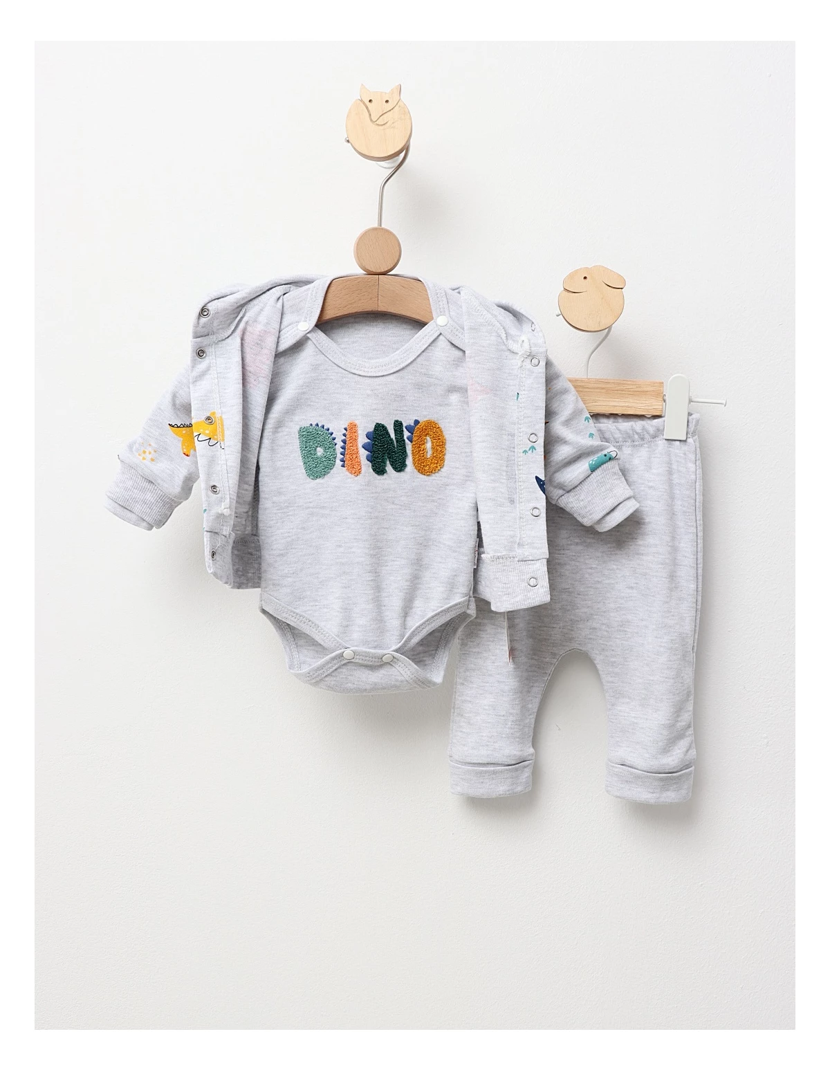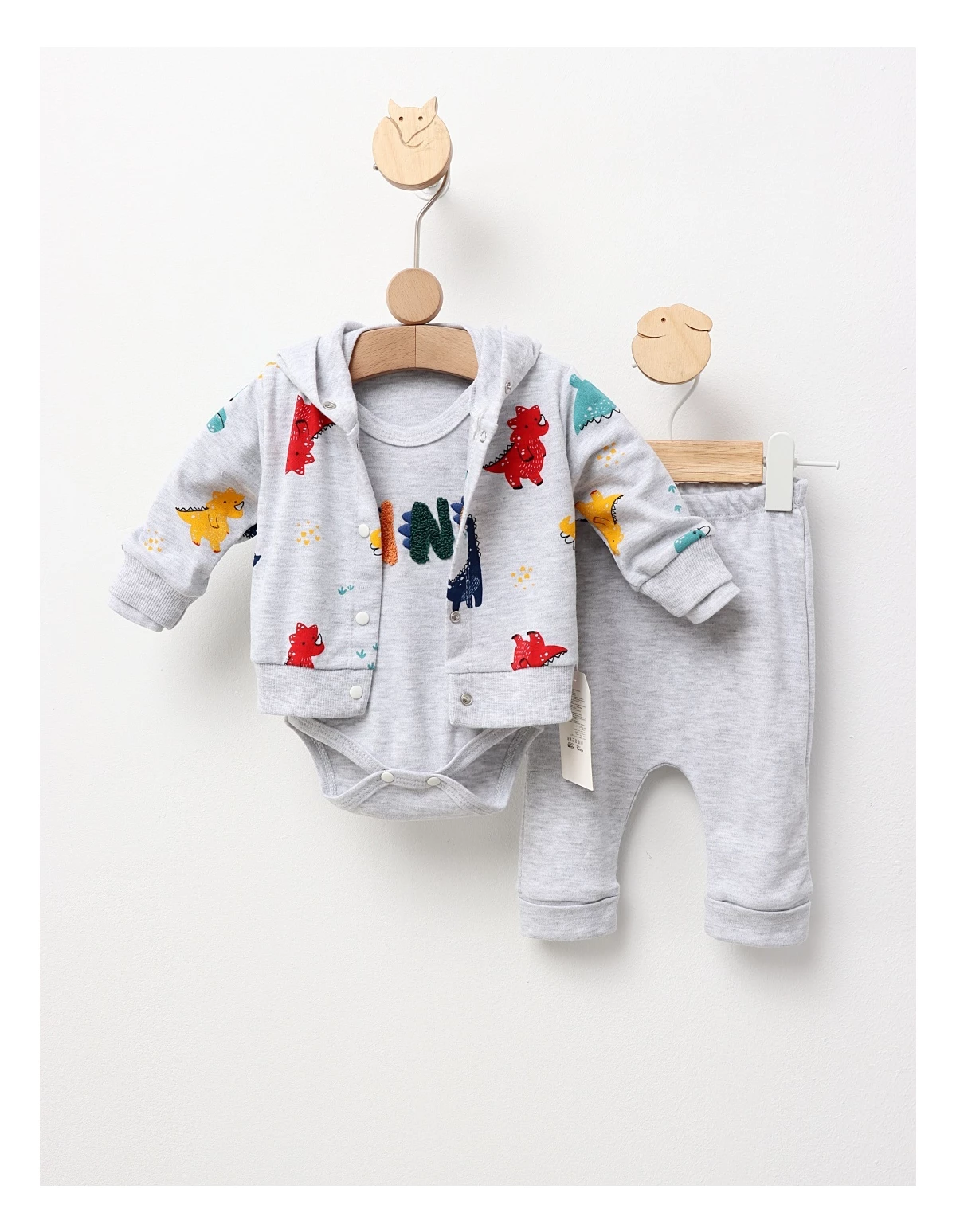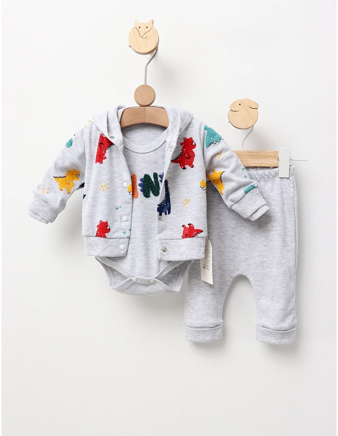 Costumul 3 piese pentru băieței include un body cu mânecă lungă și deschidere în capse, o căciuliță și pantaloni asortați. Decorat cu un imprimeu adorabil cu ursuleț aviator, acest set este fabricat din 100% bumbac, oferind confort și blândețe pentru pielea delicată a micuților.