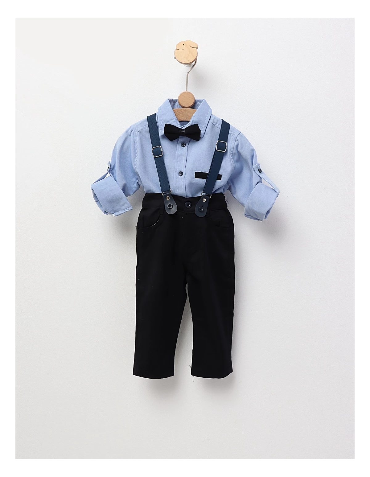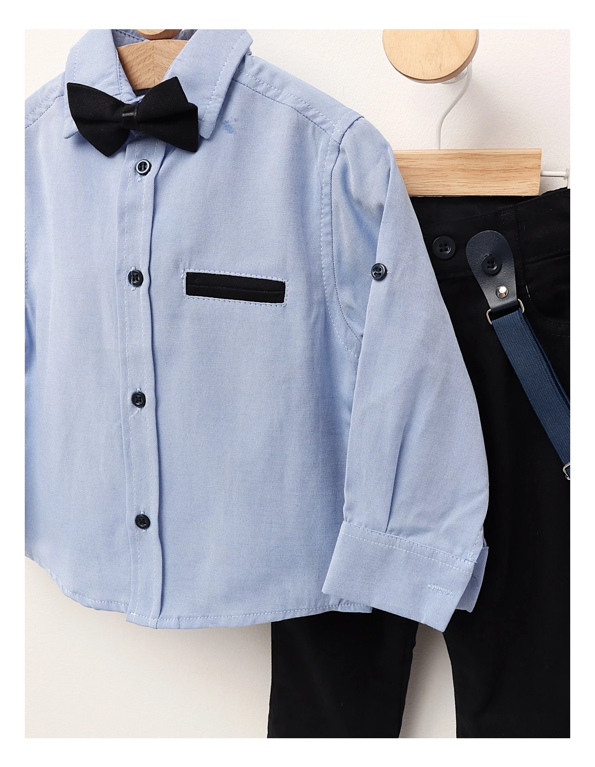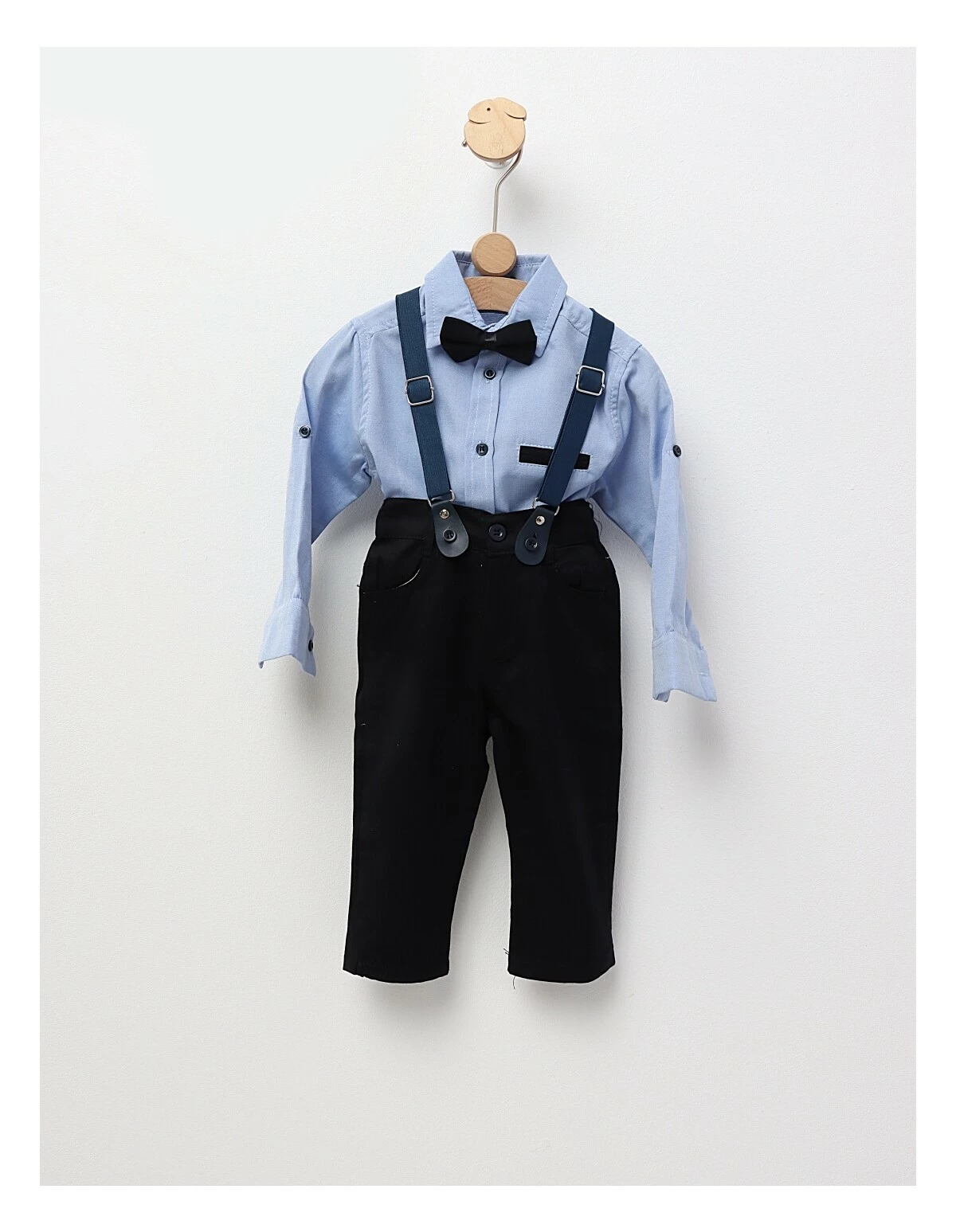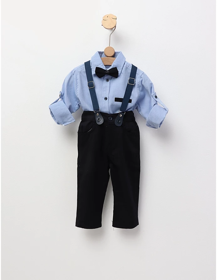 Costumaș elegant pentru băieței, ideal pentru un nou început de an școlar. Setul include o cămașă elegantă cu bretele și papion, și pantalonasi din tercot cu elastic, fermoar și nasture în talie. Fabricat din material de înaltă calitate, 80% bumbac și 20% poliester, acest costumas oferă confort și stil pentru micuțul tău. Uniforma scoalara, costumas elegant scoala, Cămașa Albă, Costumul Școlar.