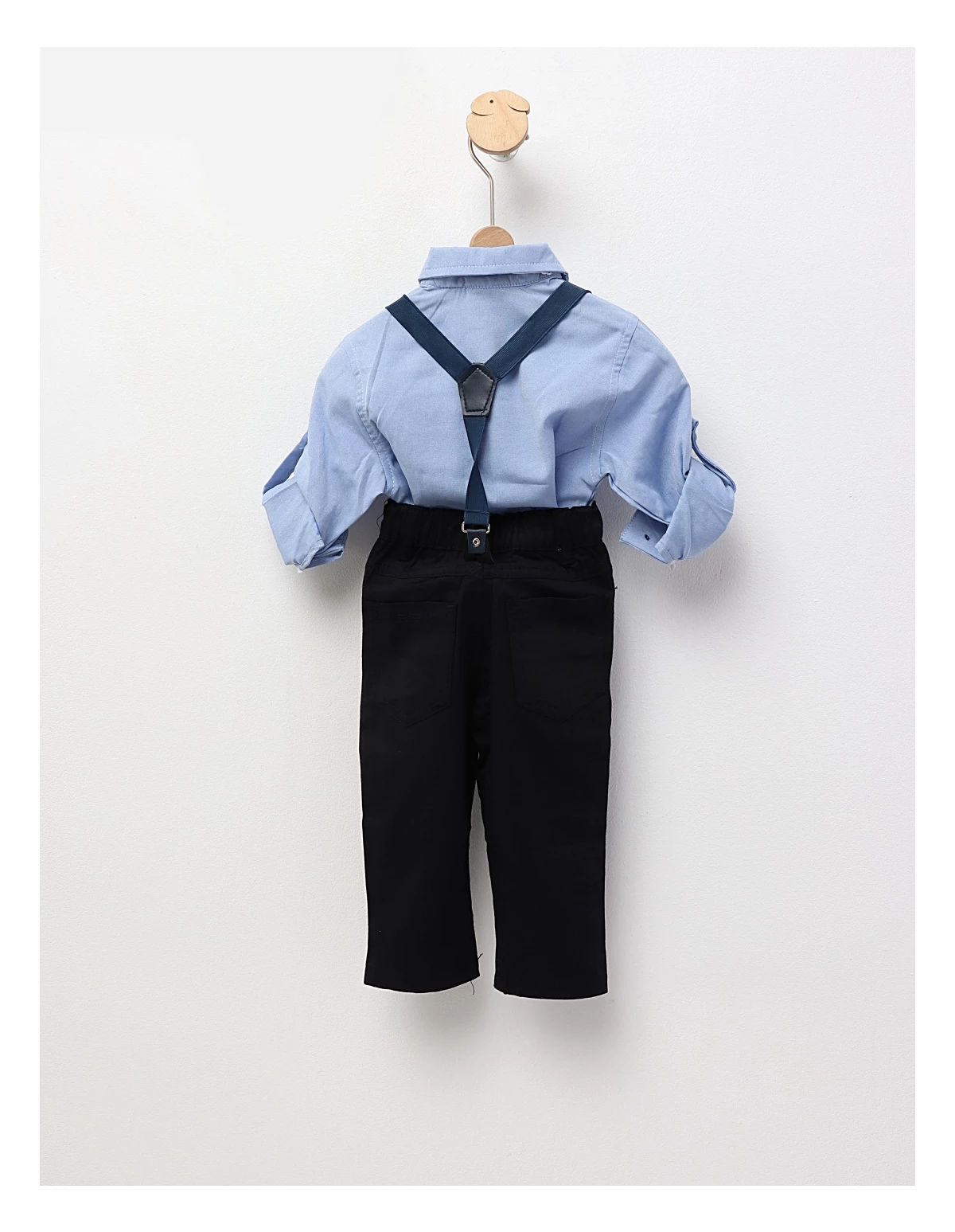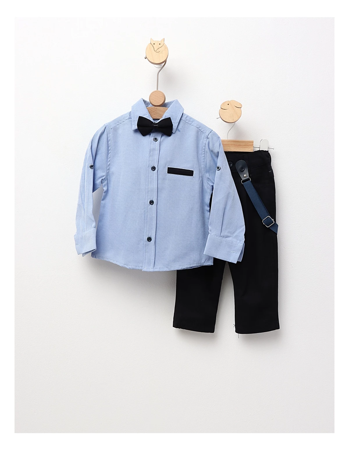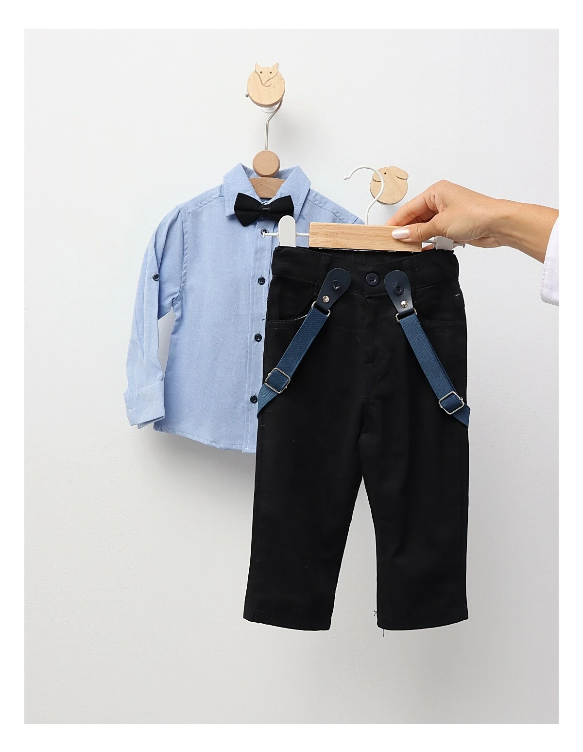 Costumaș elegant pentru băieței, ideal pentru un nou început de an școlar. Setul include o cămașă elegantă cu bretele și papion, și pantalonasi din tercot cu elastic, fermoar și nasture în talie. Fabricat din material de înaltă calitate, 80% bumbac și 20% poliester, acest costumas oferă confort și stil pentru micuțul tău. Uniforma scoalara, costumas elegant scoala, Cămașa Albă, Costumul Școlar.
