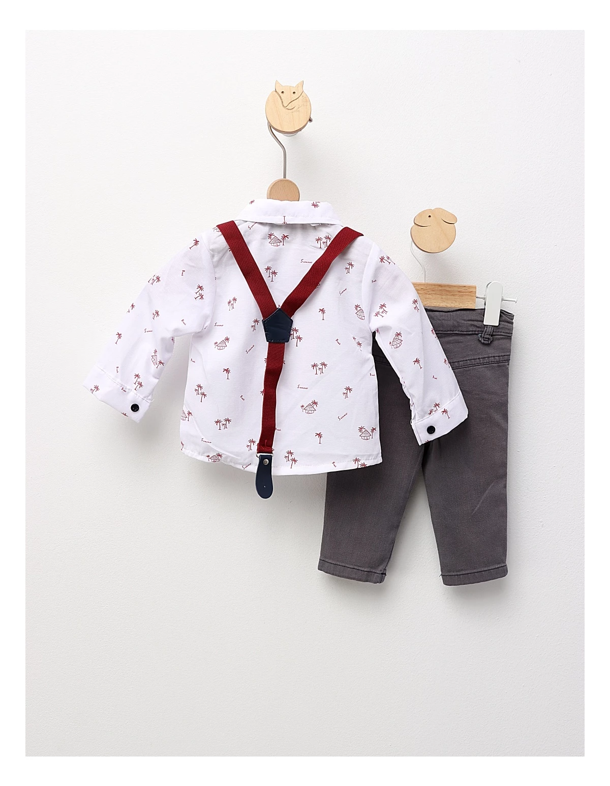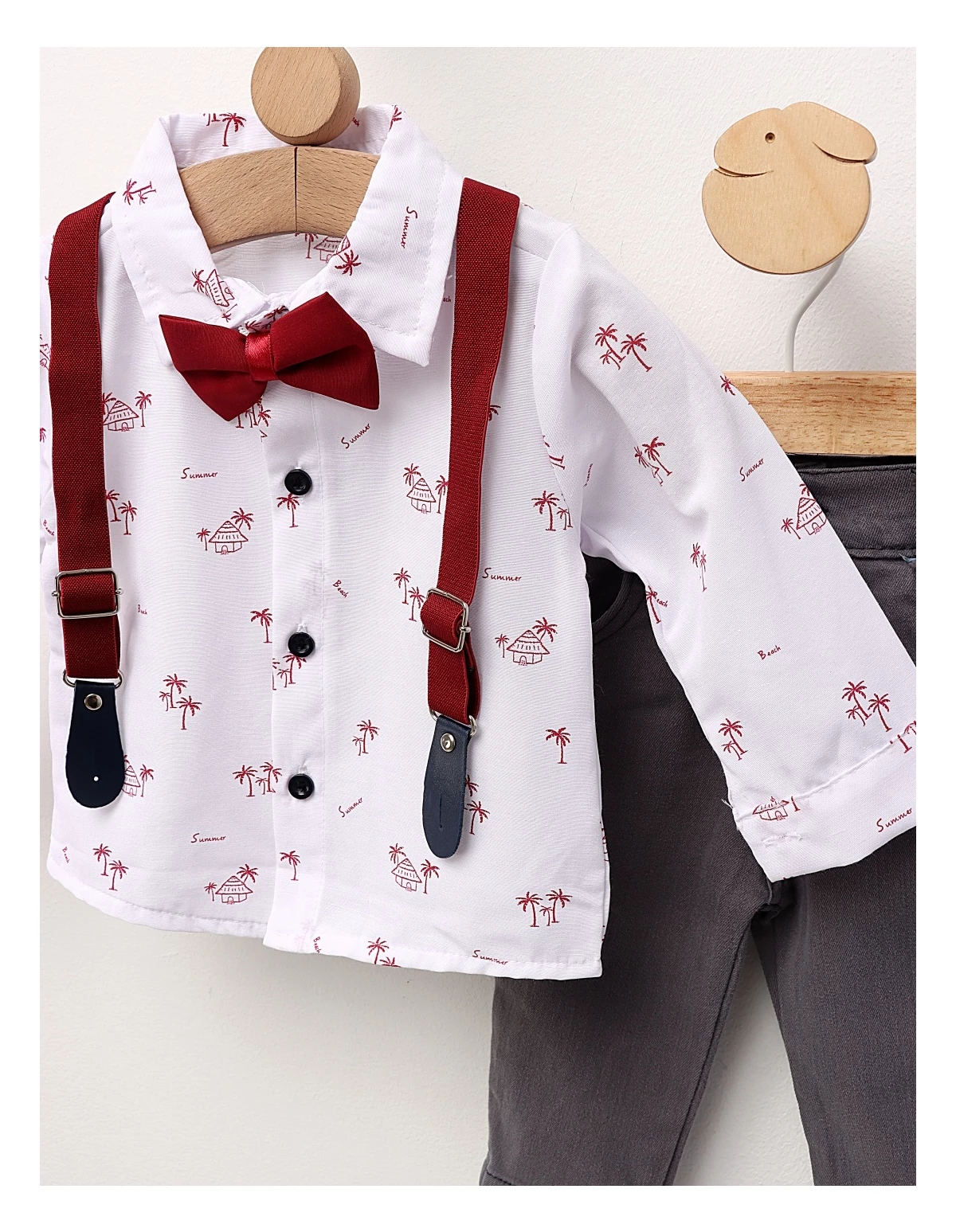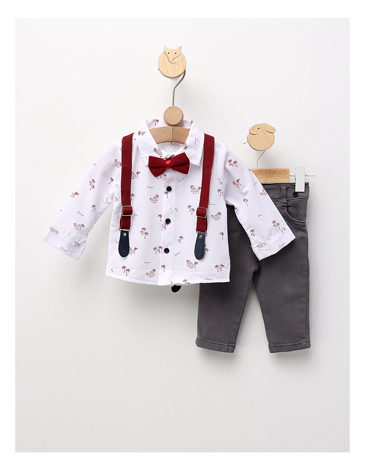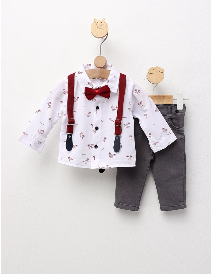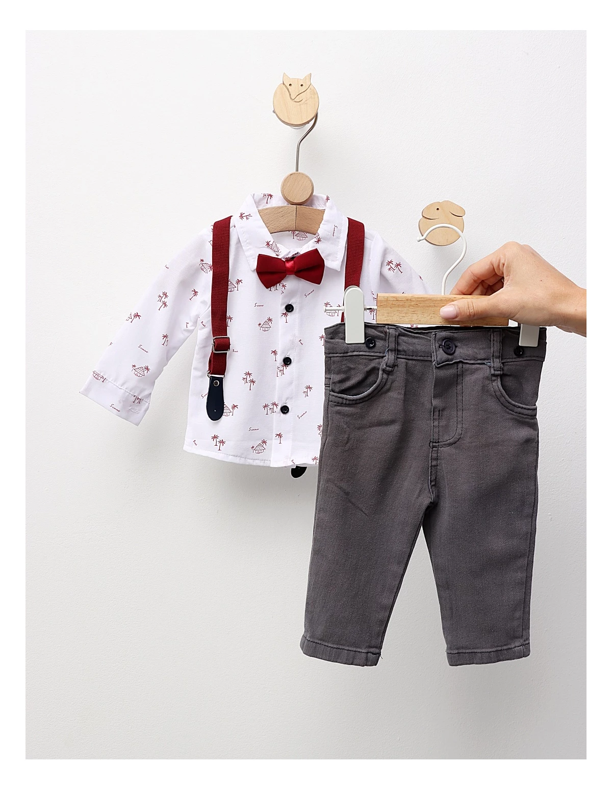 Costum elegant pentru băieți, format din cămașă cu deschidere în nasturi și papion, bretele confortabile și pantaloni de blugi cu nasture și buzunare, confecționat din 100% bumbac. Perfect pentru ocazii speciale, petreceri sau evenimente formale, acest set oferă un look clasic și rafinat, garantând confort și stil micuțului tău.