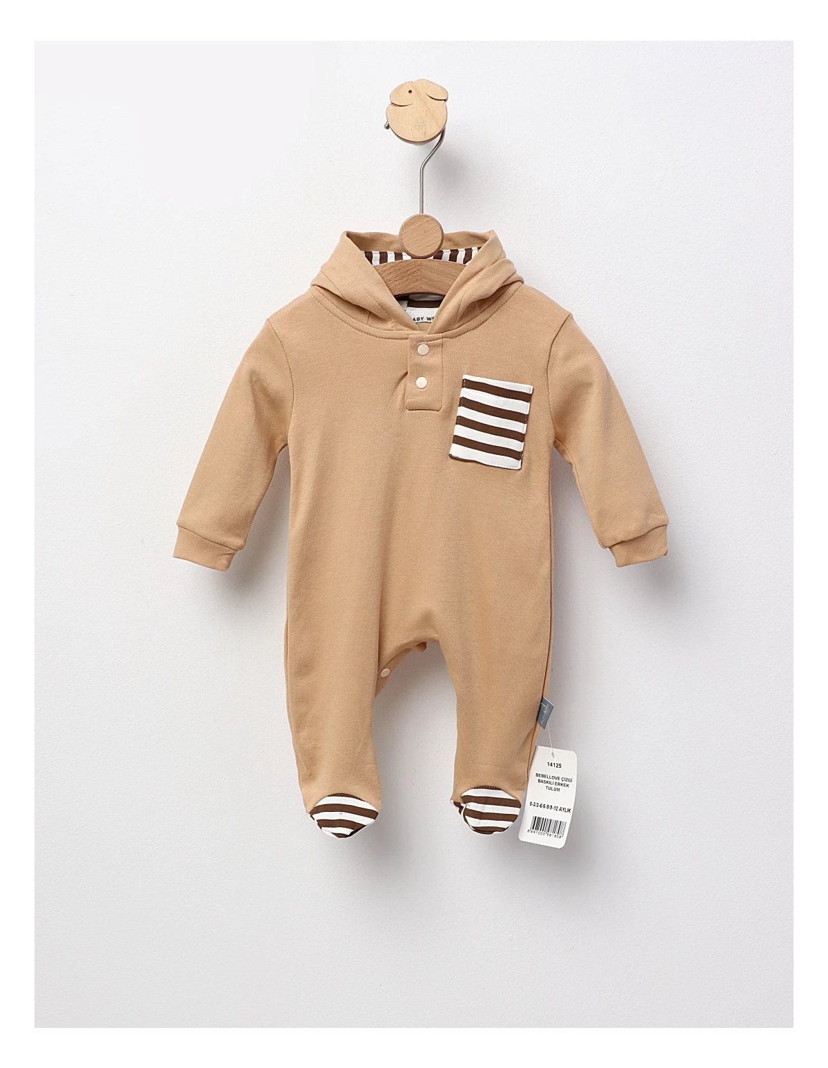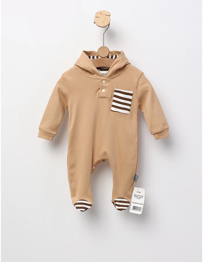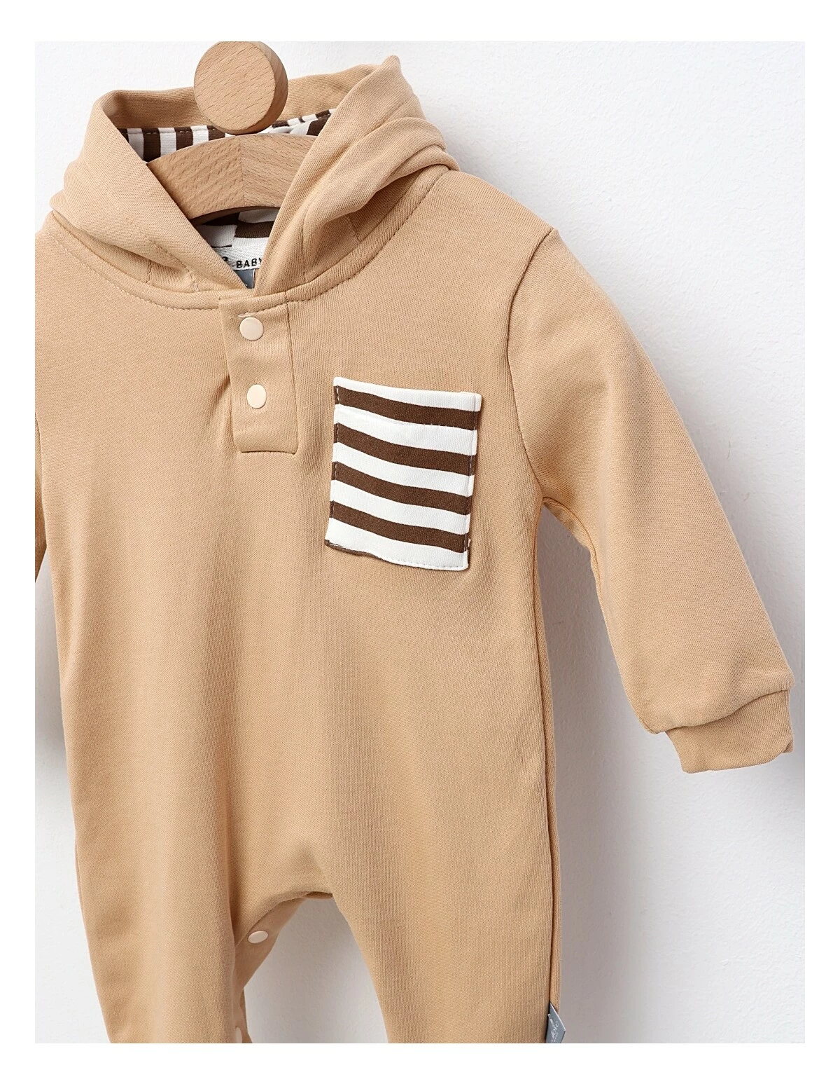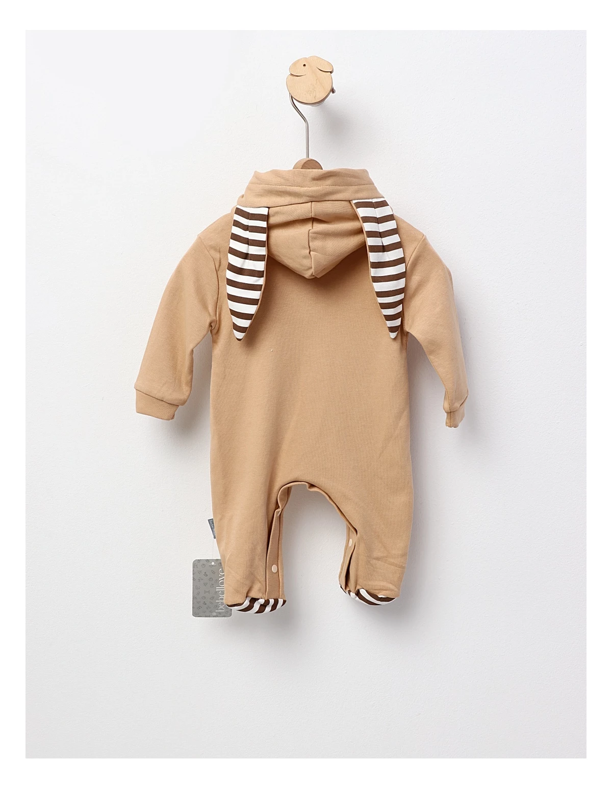 Salopetă pentru bebeluși, cu deschidere în capse pentru schimbare ușoară, glugă cu urechișoare adorabile și botosei integrati, confecționată din materiale premium 100% bumbac. Oferă confort, siguranță și un aspect drăgălaș pentru micuțul tău, fiind ideală pentru zilele răcoroase sau pentru orice moment de relaxare.