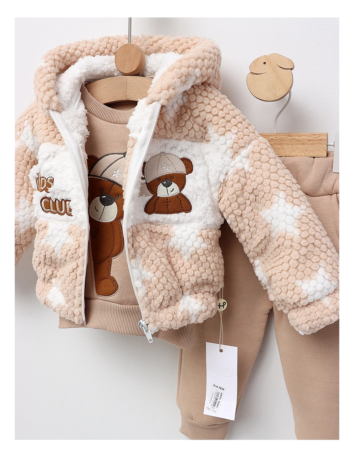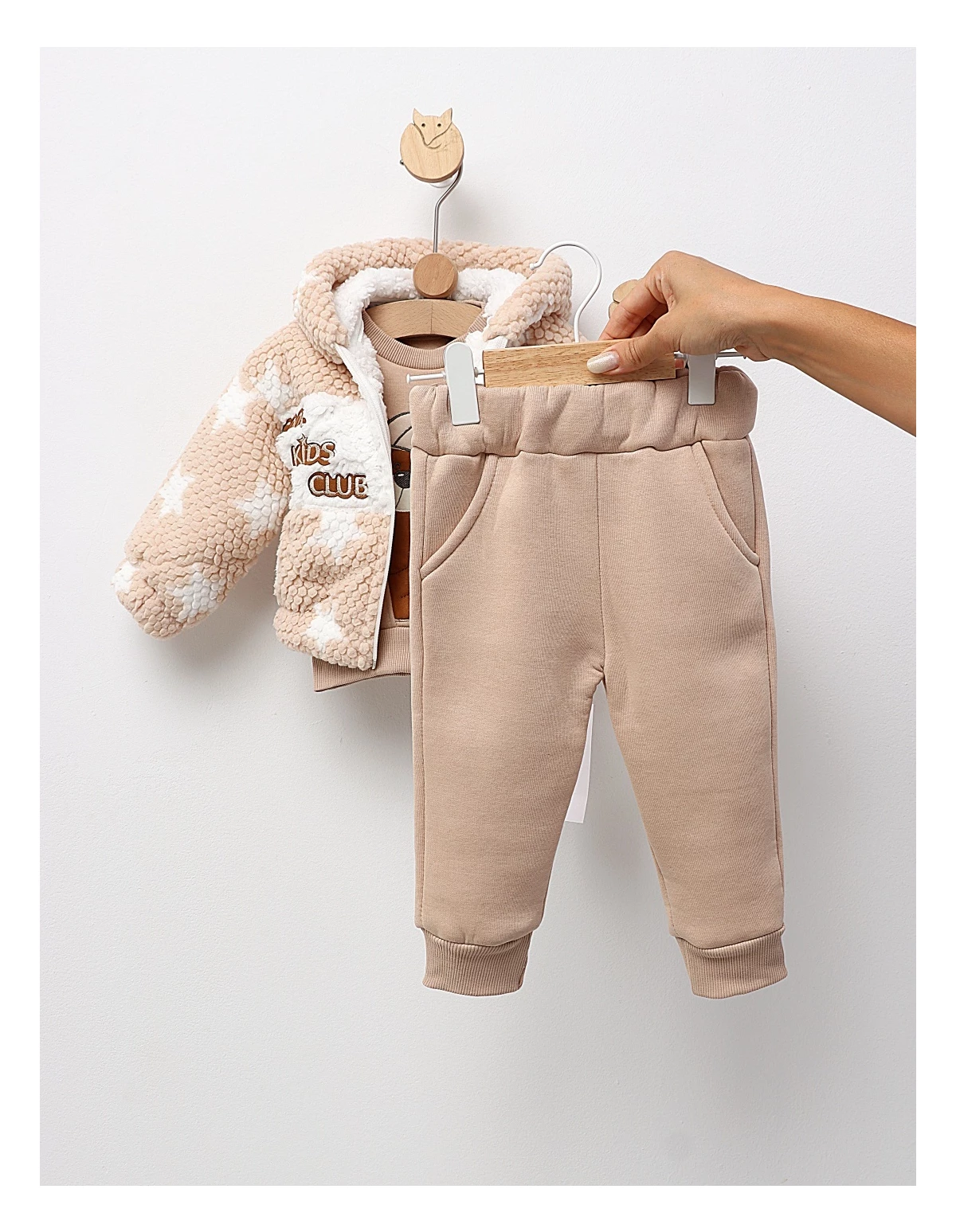 Set de 3 piese pentru băieți, ideal pentru sezonul rece, inclusiv o gecută stil cocolino super pufoasă și călduroasă, cu deschidere în fermoar, glugă și buzunare. Bluză de interior cu deschidere în capse pe umăr și plusată pe interior pentru confort maxim. Pantaloni cu elastic în talie, confecționați din materiale premium gros plusate pe interior, din 50% poliester și 50% bumbac. Acest set oferă protecție, stil și căldură micuțului tău în zilele friguroase, perfect pentru zile de joacă și plimbări în aer liber.