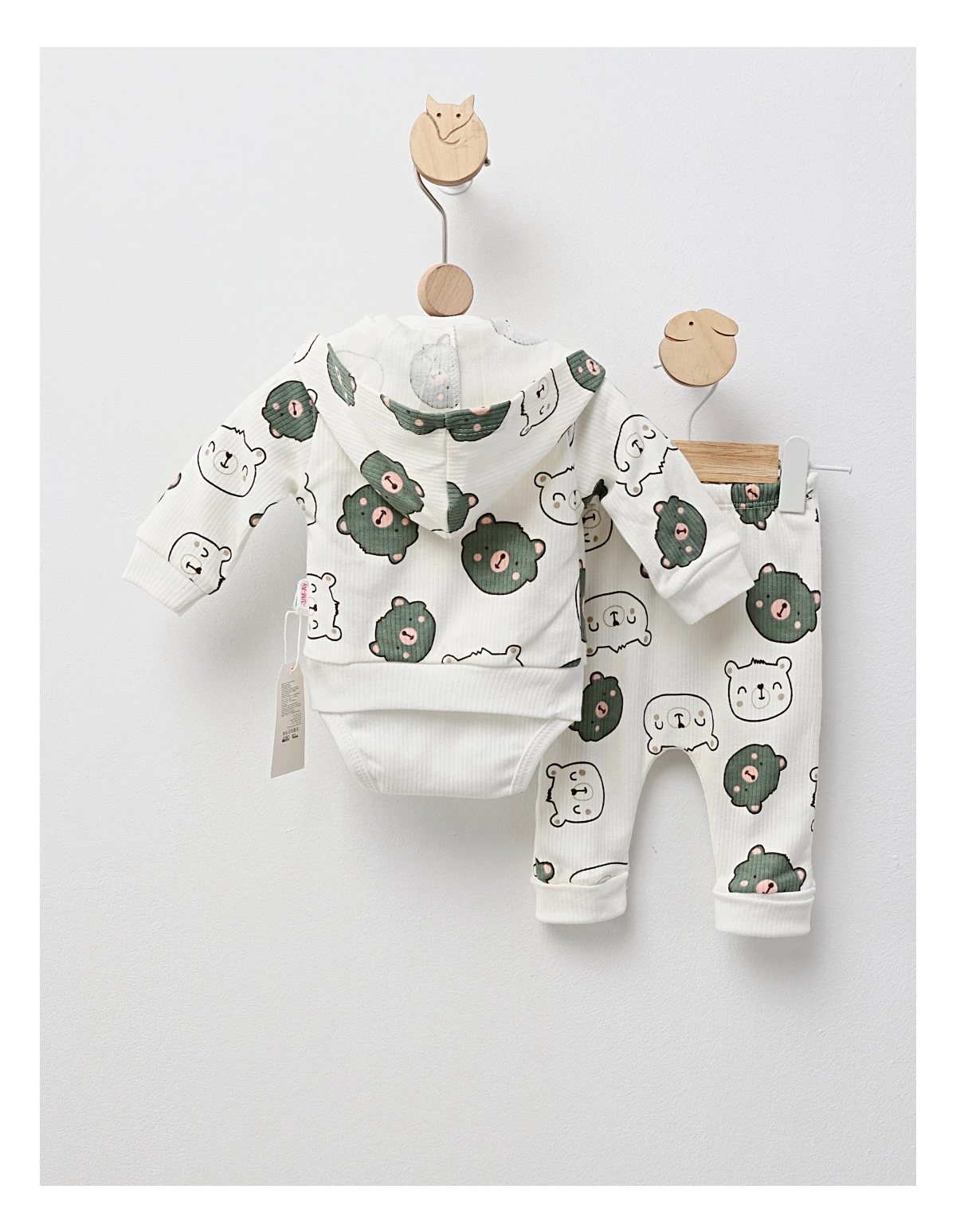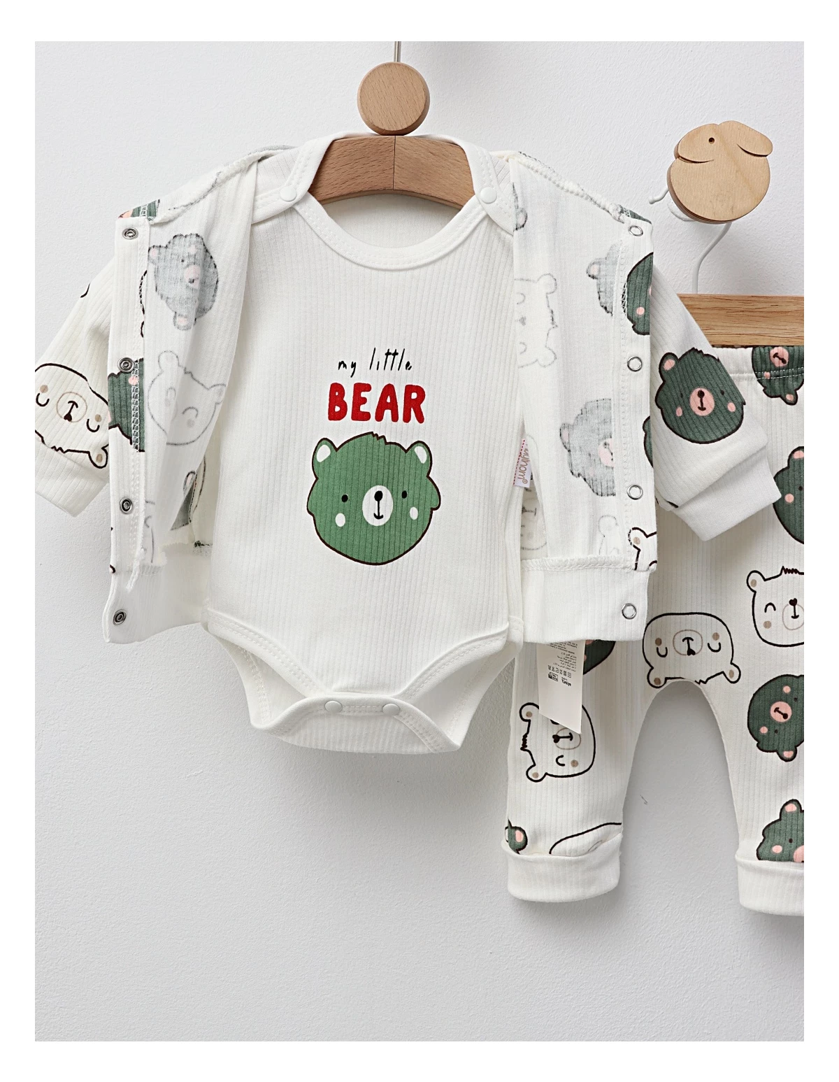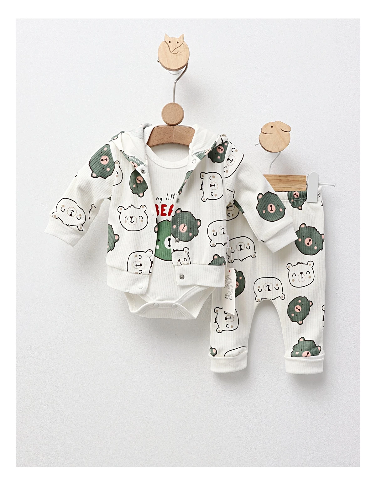 Setul de 3 piese pentru bebeluși este perfect pentru a oferi confort și stil micuțului tău. Acesta include un hanorac cu glugă, care dispune de deschidere în capse, facilitând îmbrăcarea rapidă și ușoară. Hanoracul oferă căldură, ideal pentru zilele mai răcoroase. Setul continuă cu un body imprimeu cu mesajul "My Little Bear", care adaugă un strop de farmec și personalitate ținutei. Pantalonișii sunt dotați cu elastic în talie și sunt decorați cu imprimeuri cu ursuleți, asigurând o potrivire confortabilă și lejeritate în mișcare. Fabricat din 100% bumbac, acest set este blând cu pielea delicată a bebelușilor, oferind o senzație plăcută și respirabilitate optimă. Ideal pentru joacă, plimbări sau momente de relaxare, acest set devine rapid un favorit în garderoba micuțului tău.