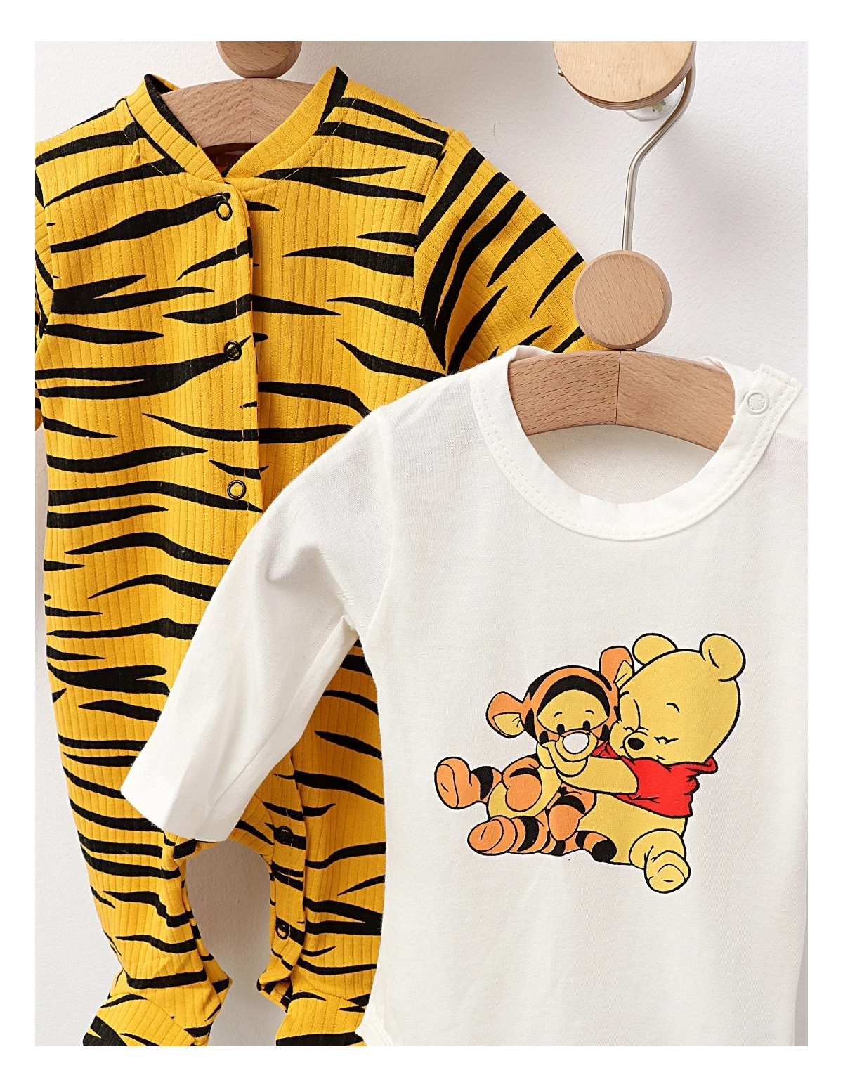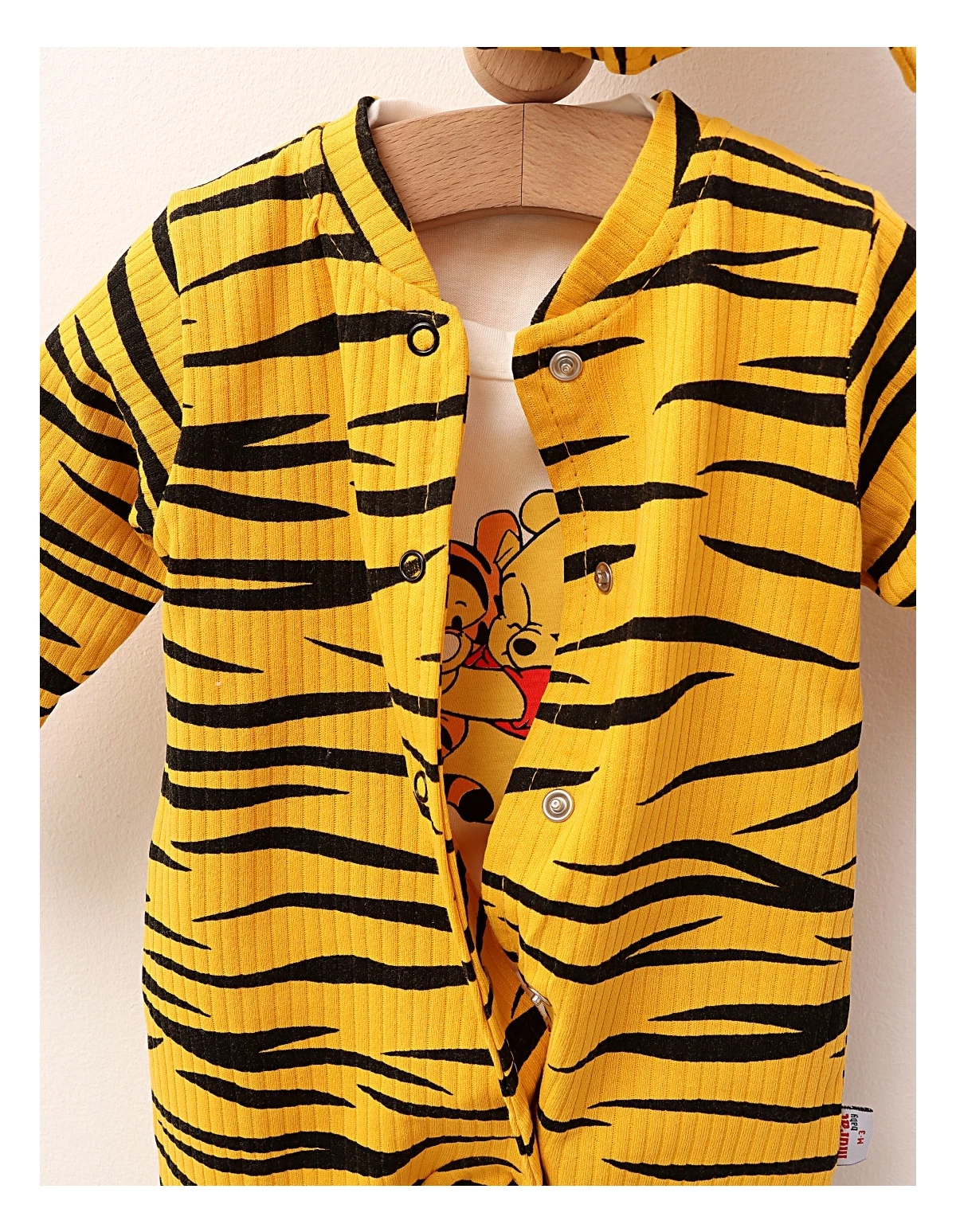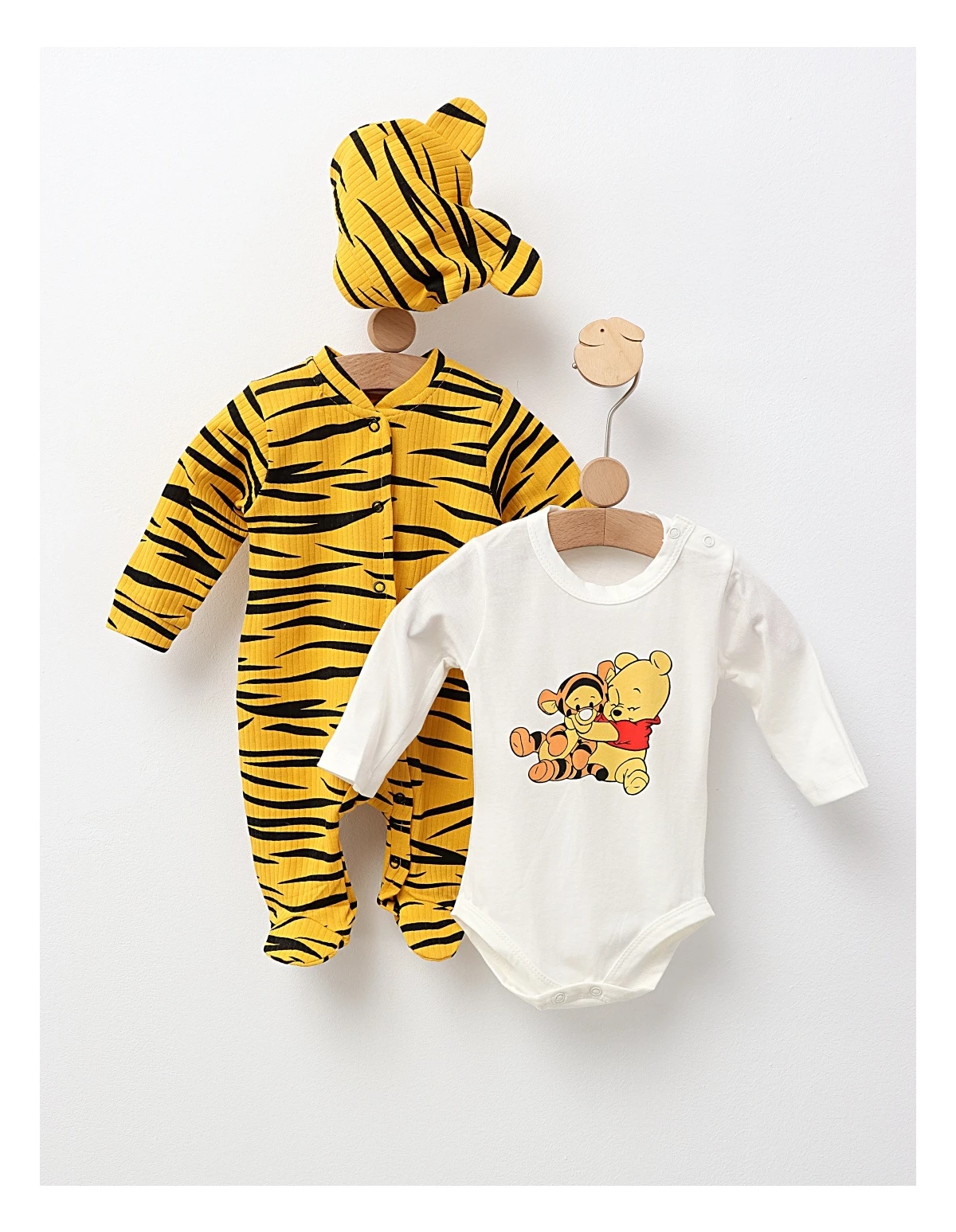 Setul de 3 piese pentru bebeluși include o salopetă cu deschidere în capse, decorată cu un imprimeu stil tigru, o căciuliță cu urechiușe și un body cu imprimeul 'Winnie și Tigger'. Fabricat din 100% bumbac, acest set asigură confort și blândețe pentru pielea delicată a micuților, fiind perfect pentru joacă și momente de relaxare.