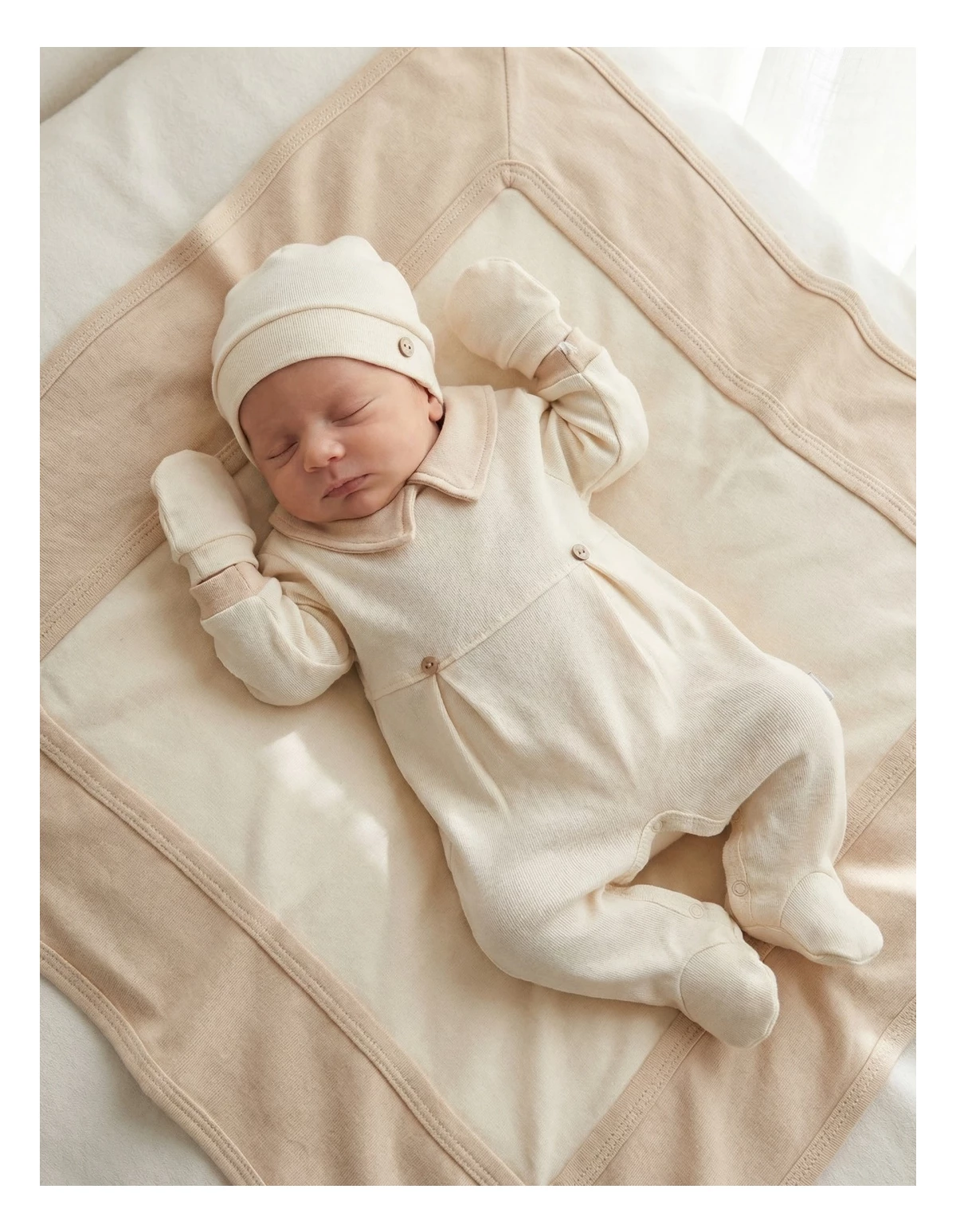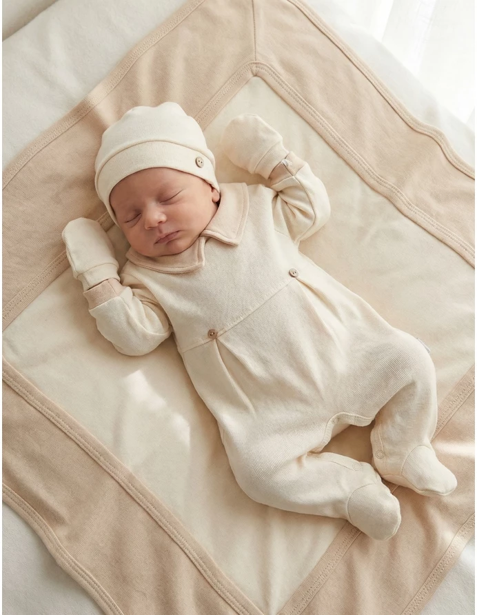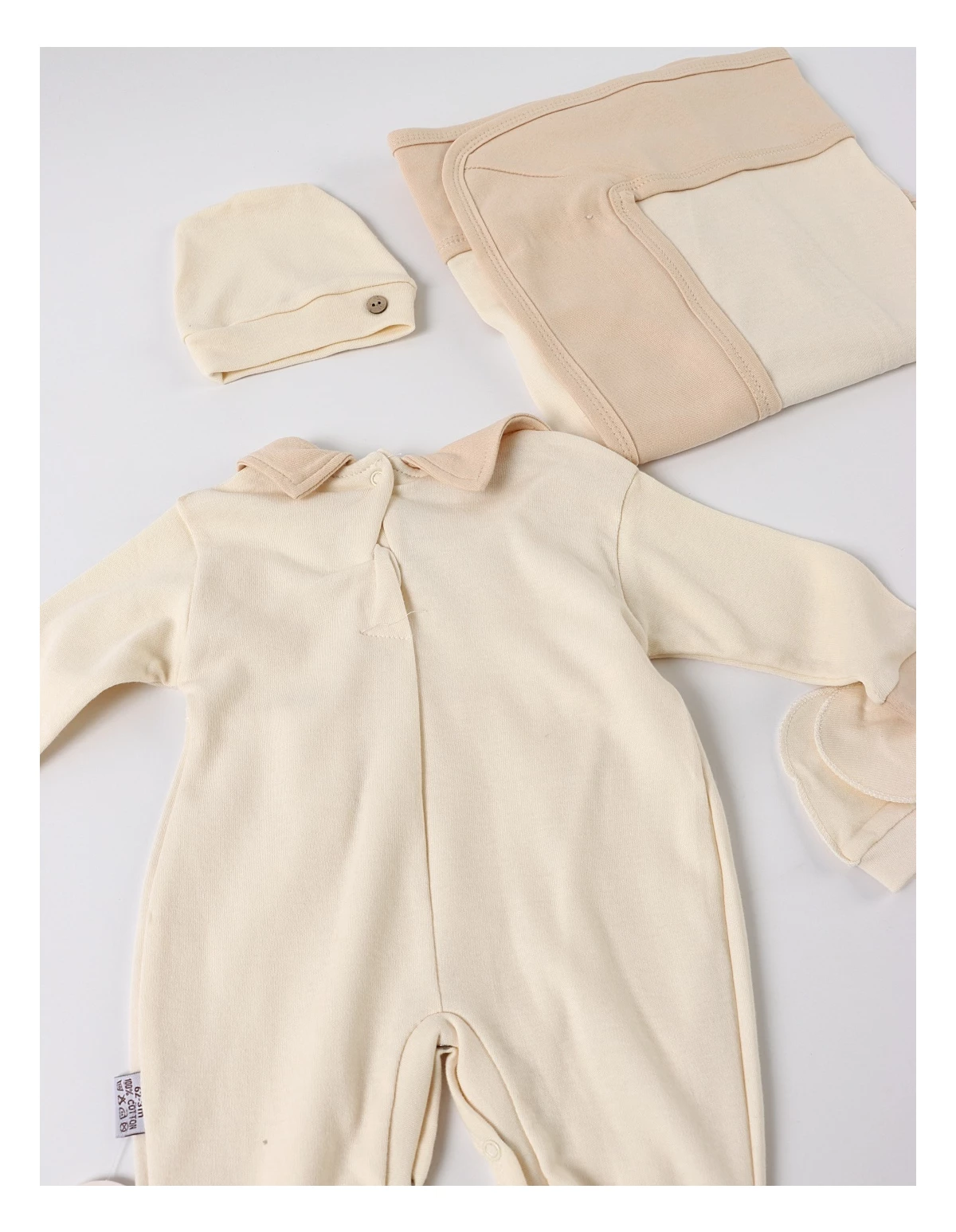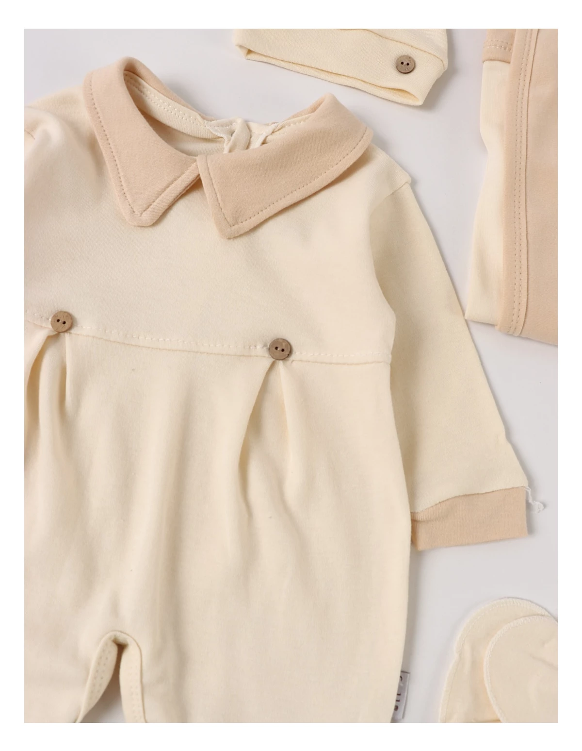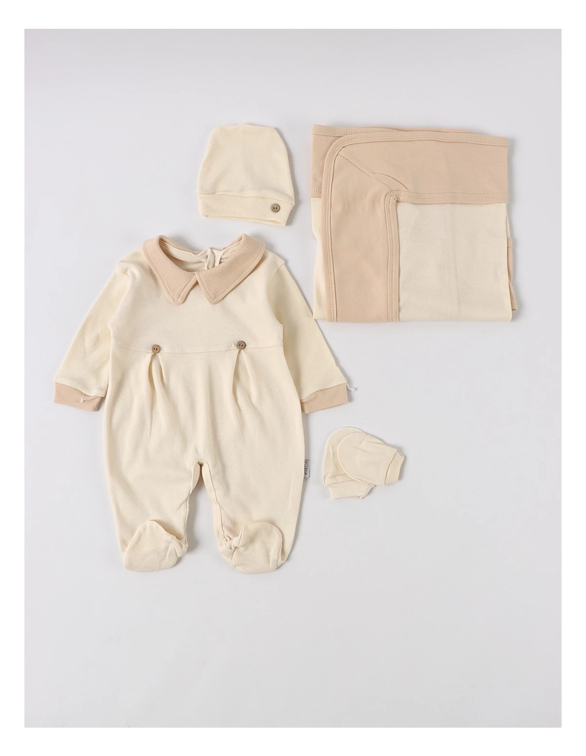 Set bebe 4 piese din bumbac 100% – rafinament și grijă pentru cei mici Un set delicat și elegant, creat special pentru confortul bebelușului tău. Realizat din bumbac 100%, moale și prietenos cu pielea sensibilă, este alegerea ideală pentru primele luni de viață. Setul include salopetă cu guler, cu închidere practică în capse la spate și între piciorușe, fes, mănuși și o păturică fină (75x85 cm), perfectă pentru somn sau plimbări. Un outfit complet, confortabil și stilat, ideal atât pentru zi de zi, cât și pentru ocazii speciale sau cadou.