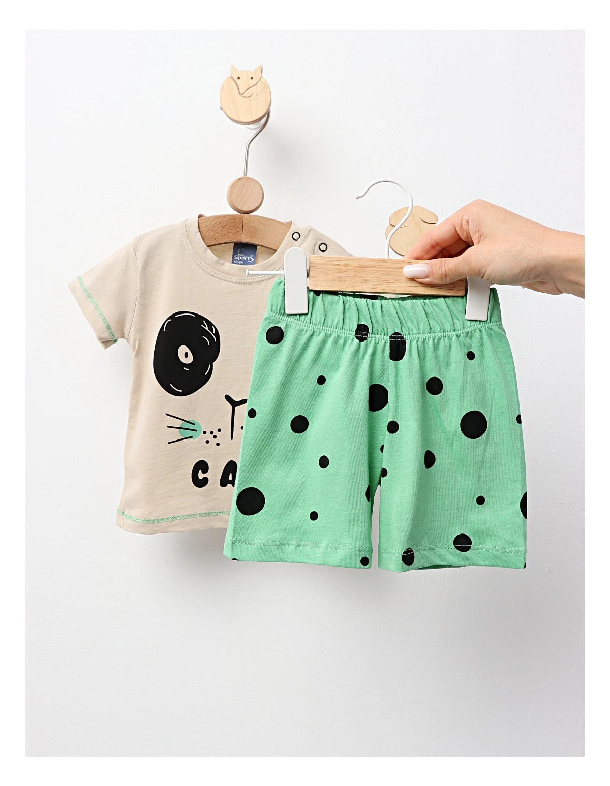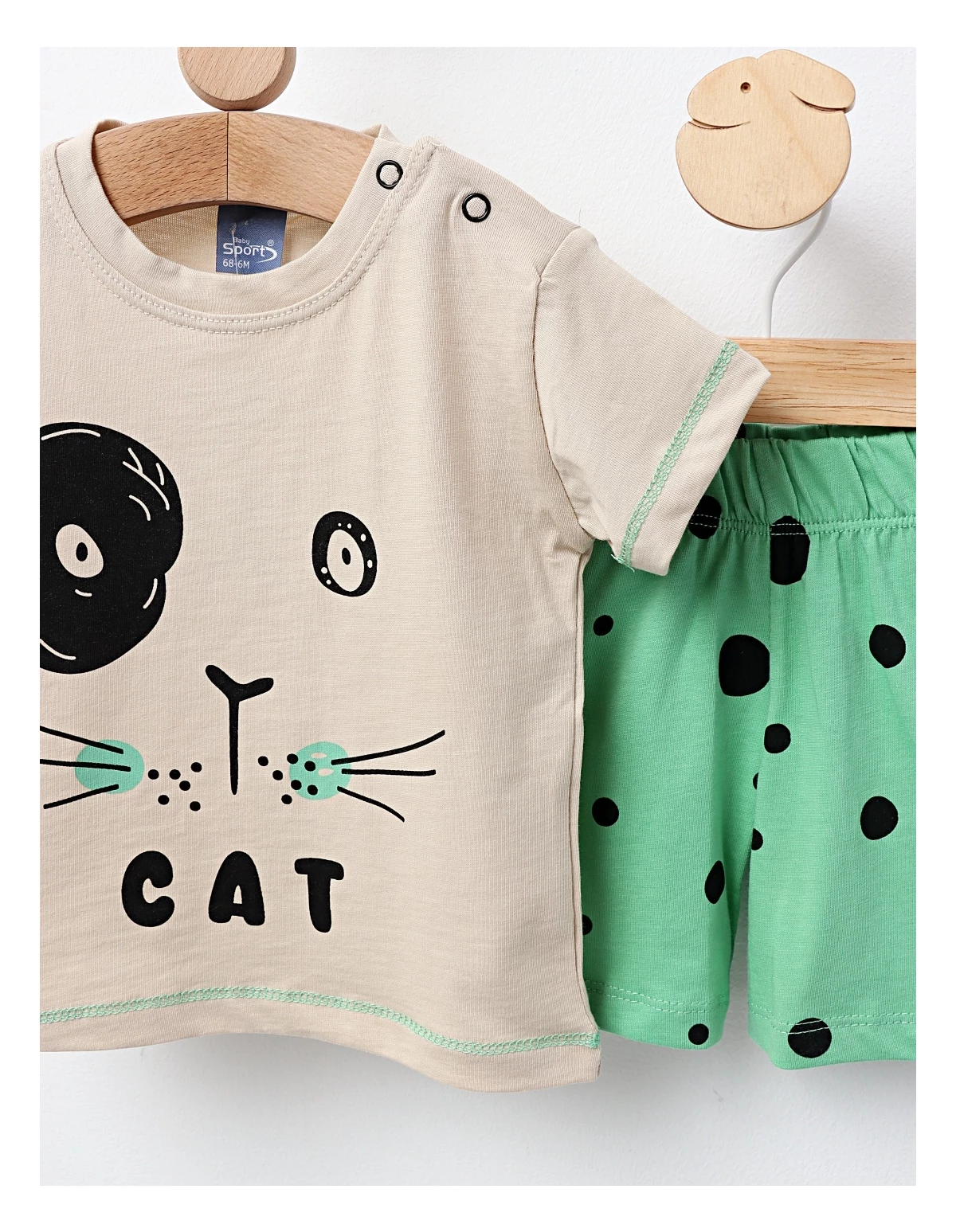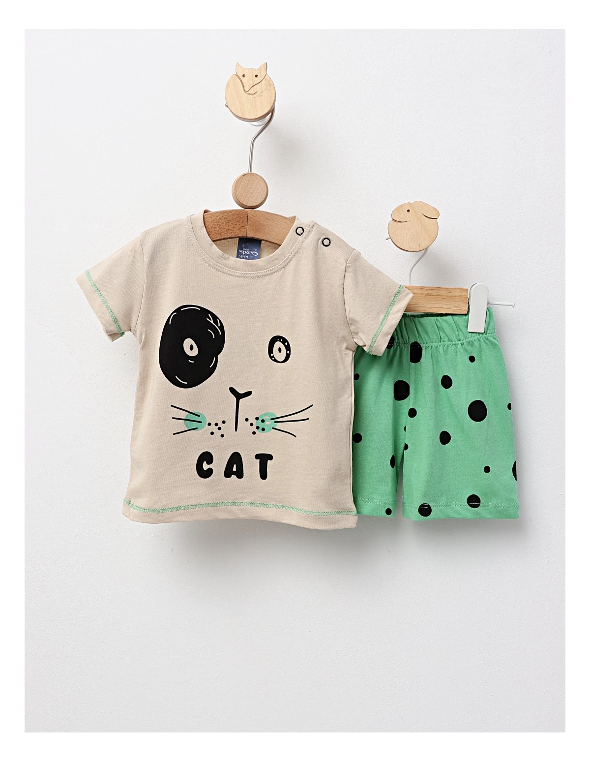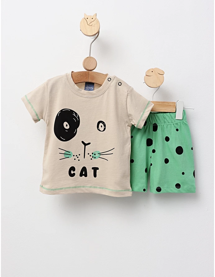 Set de vară pentru băieți, format dintr-un tricou cu imprimeu „Cat” și pantaloni scurți cu elastic în talie. Fabricat din 100% bumbac, acest set asigură confort, lejeritate și un stil casual, perfect pentru zilele calde, plimbări în aer liber sau timpul petrecut în natură.