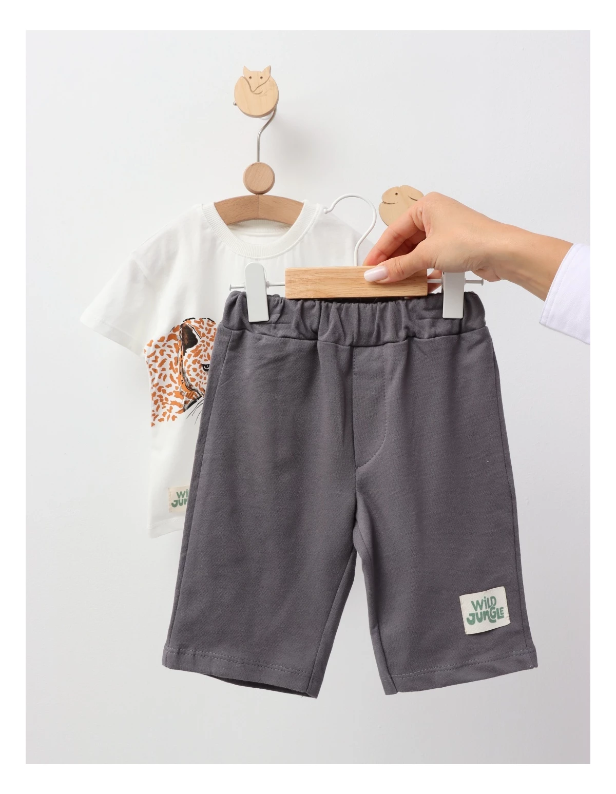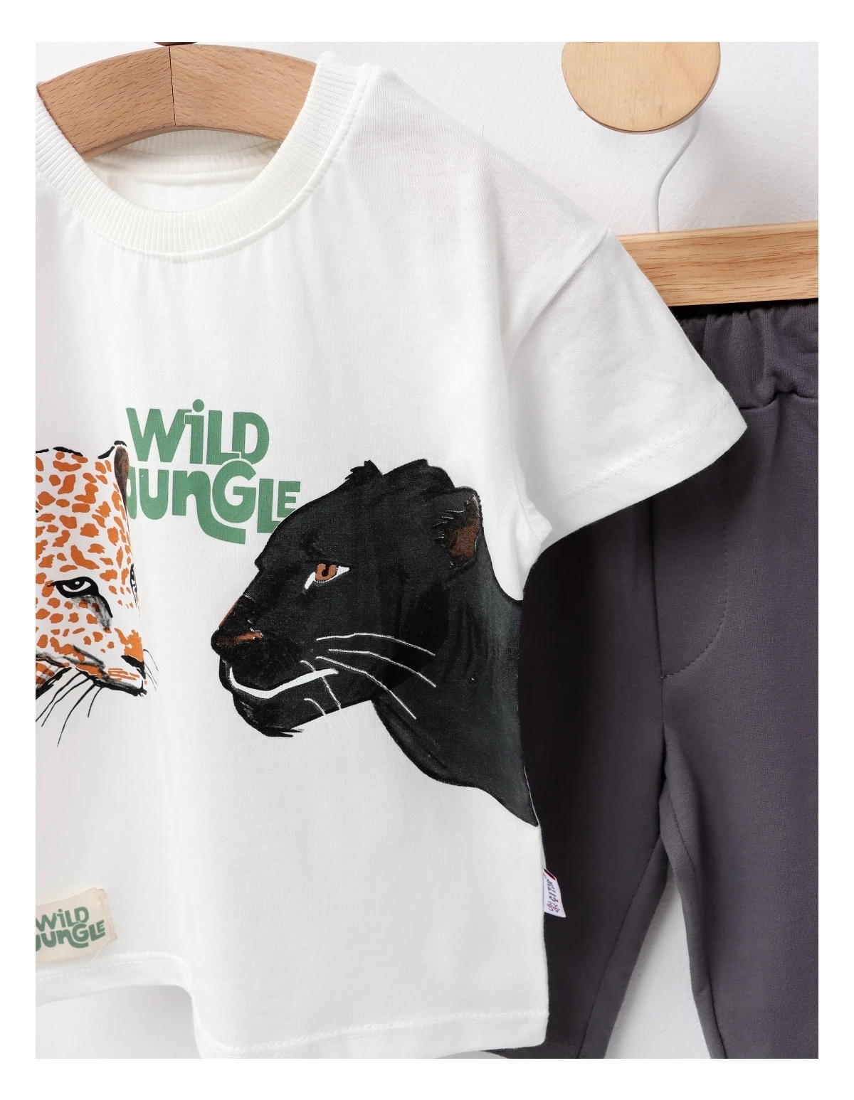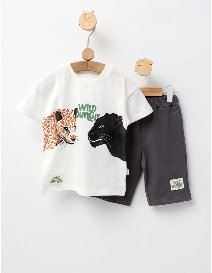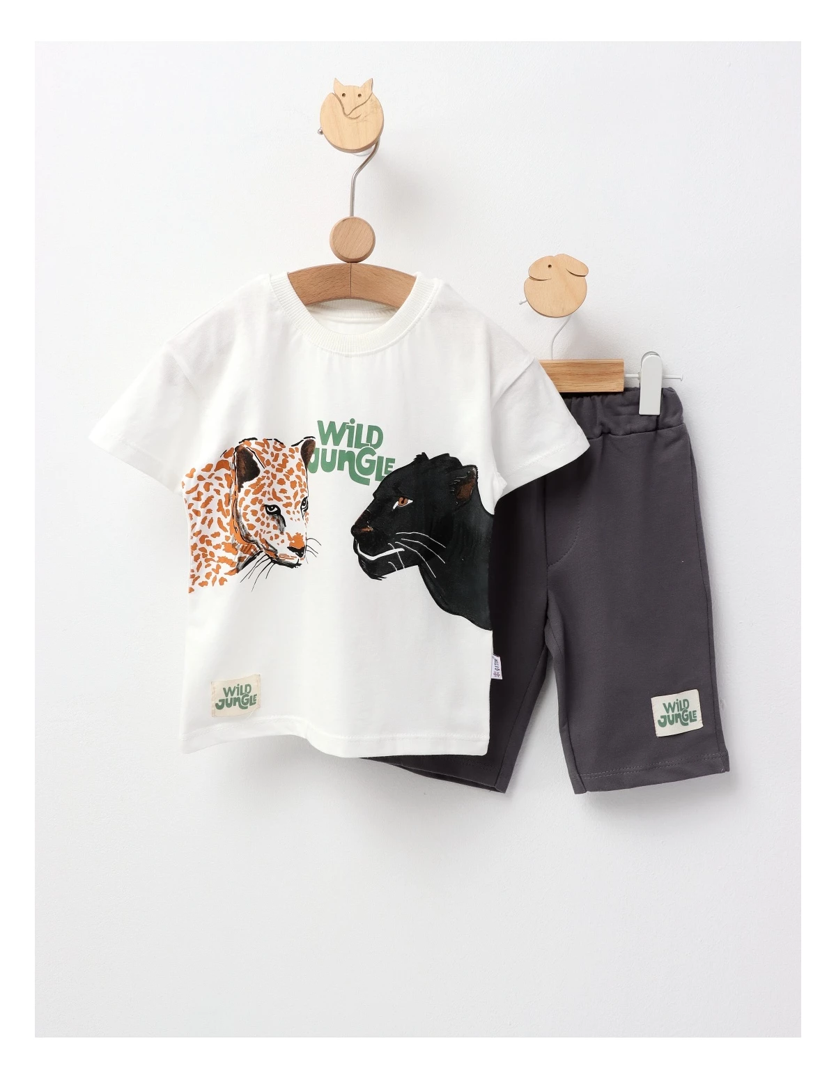 Setul în două piese pentru băieței include un tricou cu mânecă scurtă și imprimeu cu jaguar și tigru din pădurea tropicală, și pantaloni scurți cu elastic în talie. Fabricat din 100% bumbac, acest set asigură confort, respirabilitate și libertate de mișcare, fiind perfect pentru zilele calde și activități în aer liber.