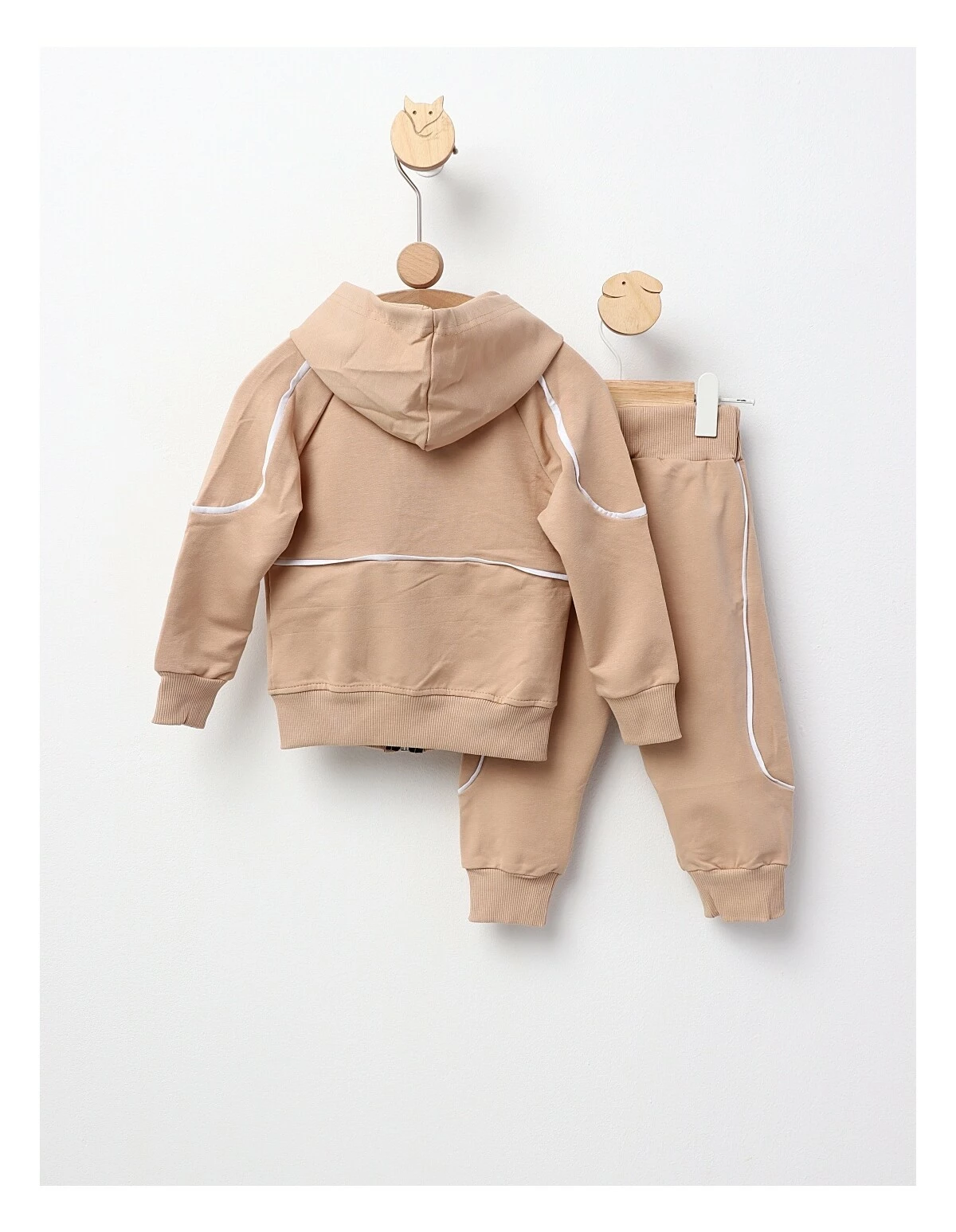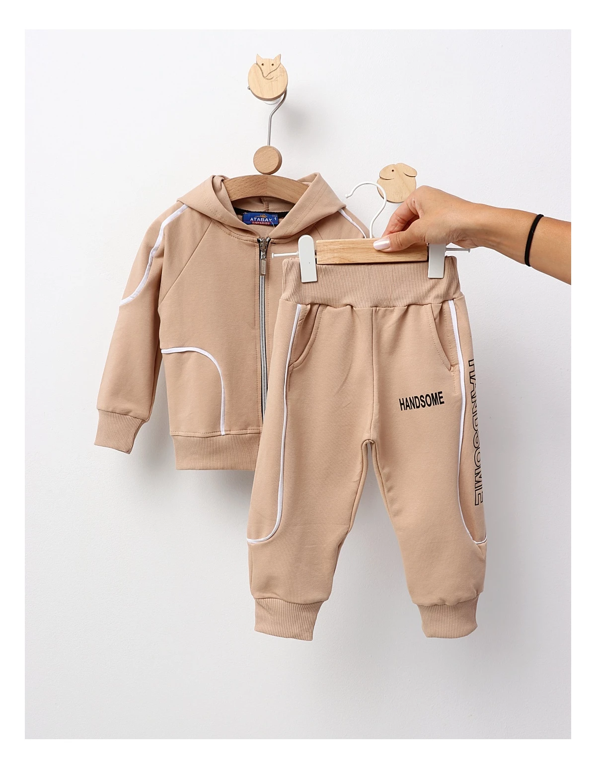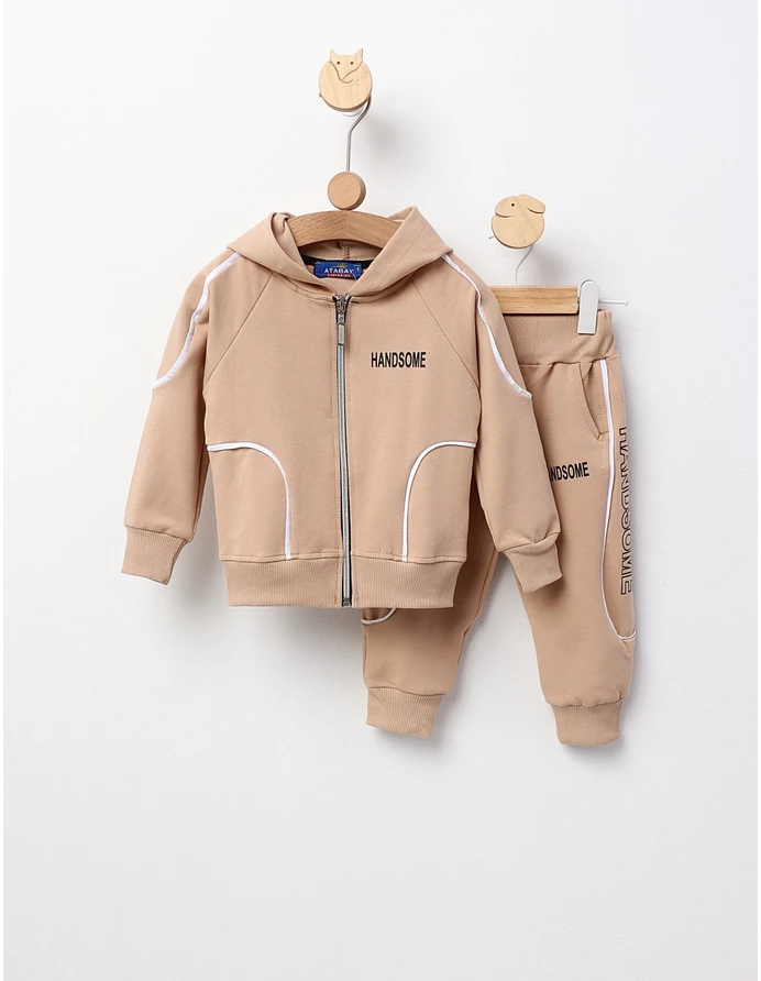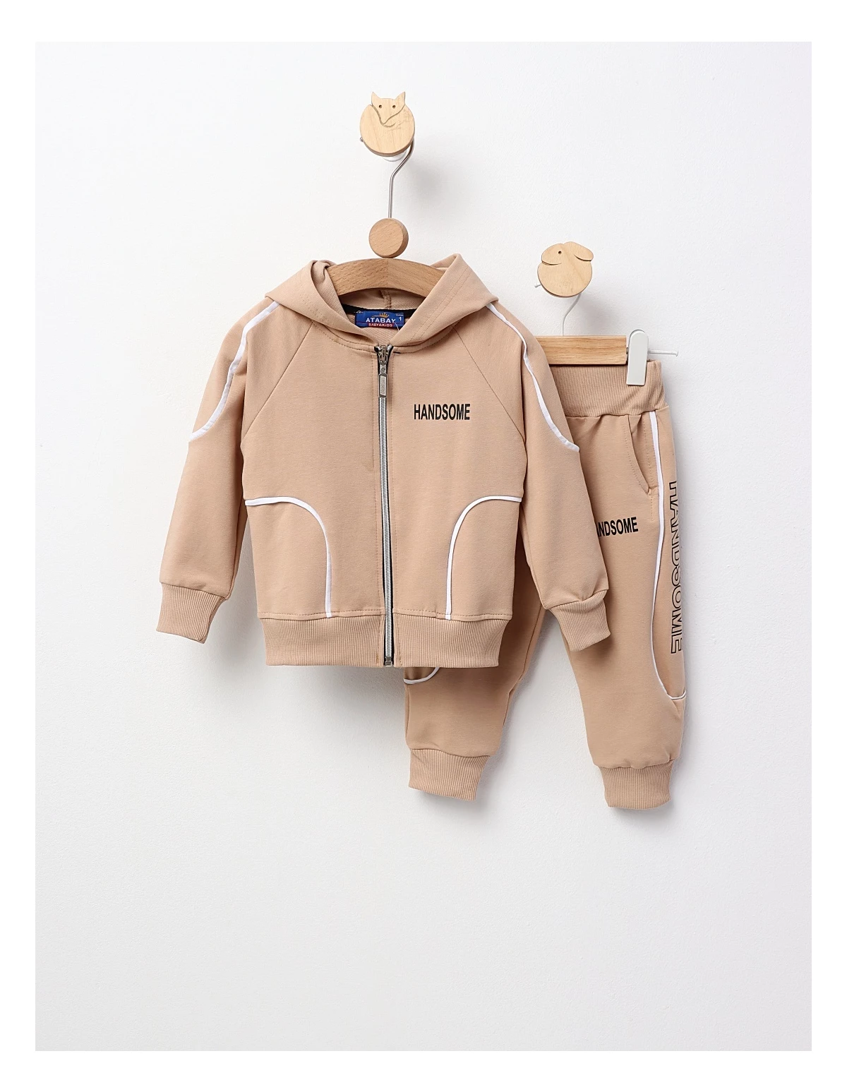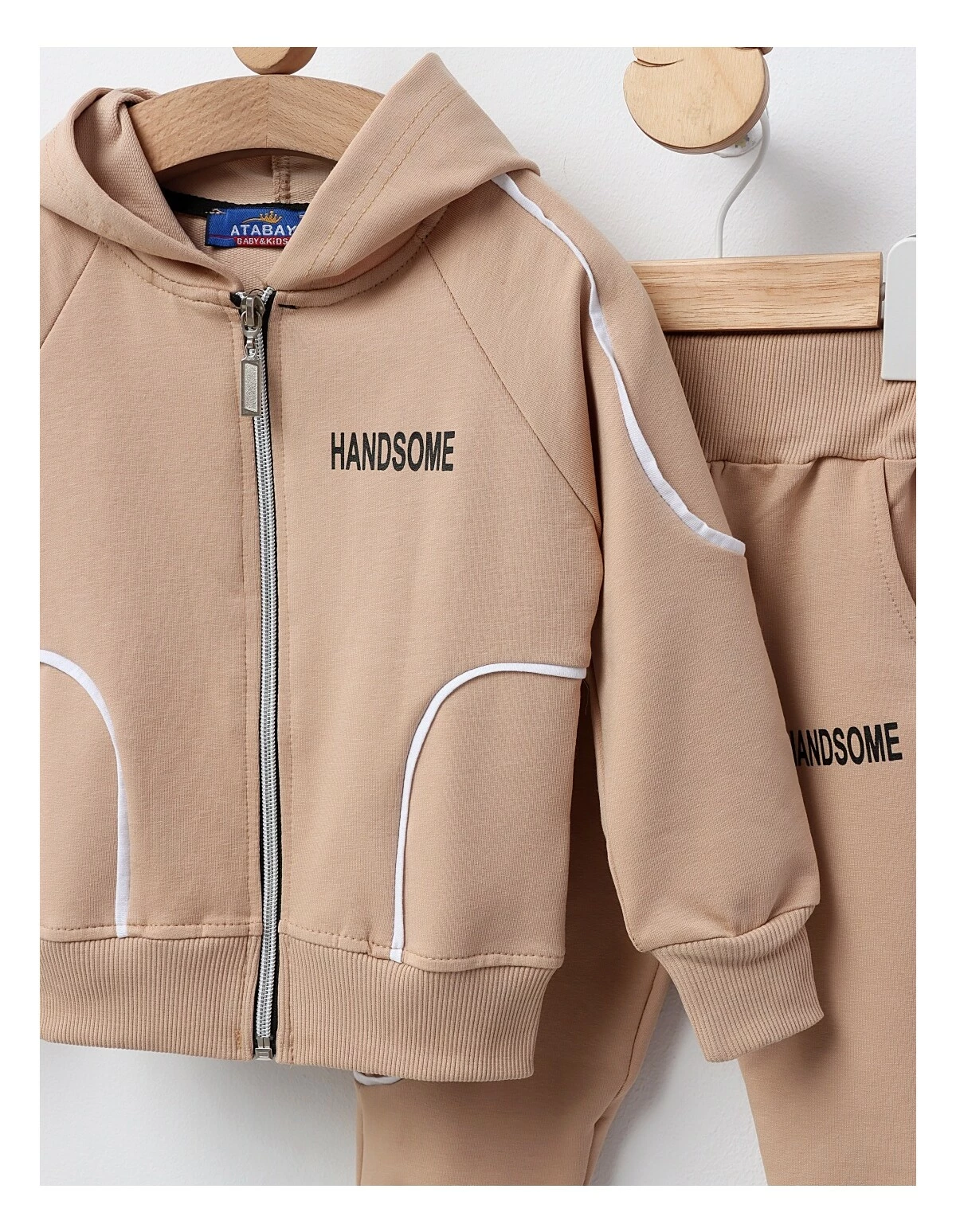 Trening pentru băieți, format dintr-o bluza cu glugă și deschidere în fermoar, decorată cu imprimeu cu mesajul 'Handsome', și pantaloni cu elastic în talie. Confecționat dintr-un material compus din 70% bumbac, 25% poliester și 5% elastan, acest set oferă confort, lejeritate și un stil casual și modern, ideal pentru activități în aer liber, joacă sau momente de relaxare.
