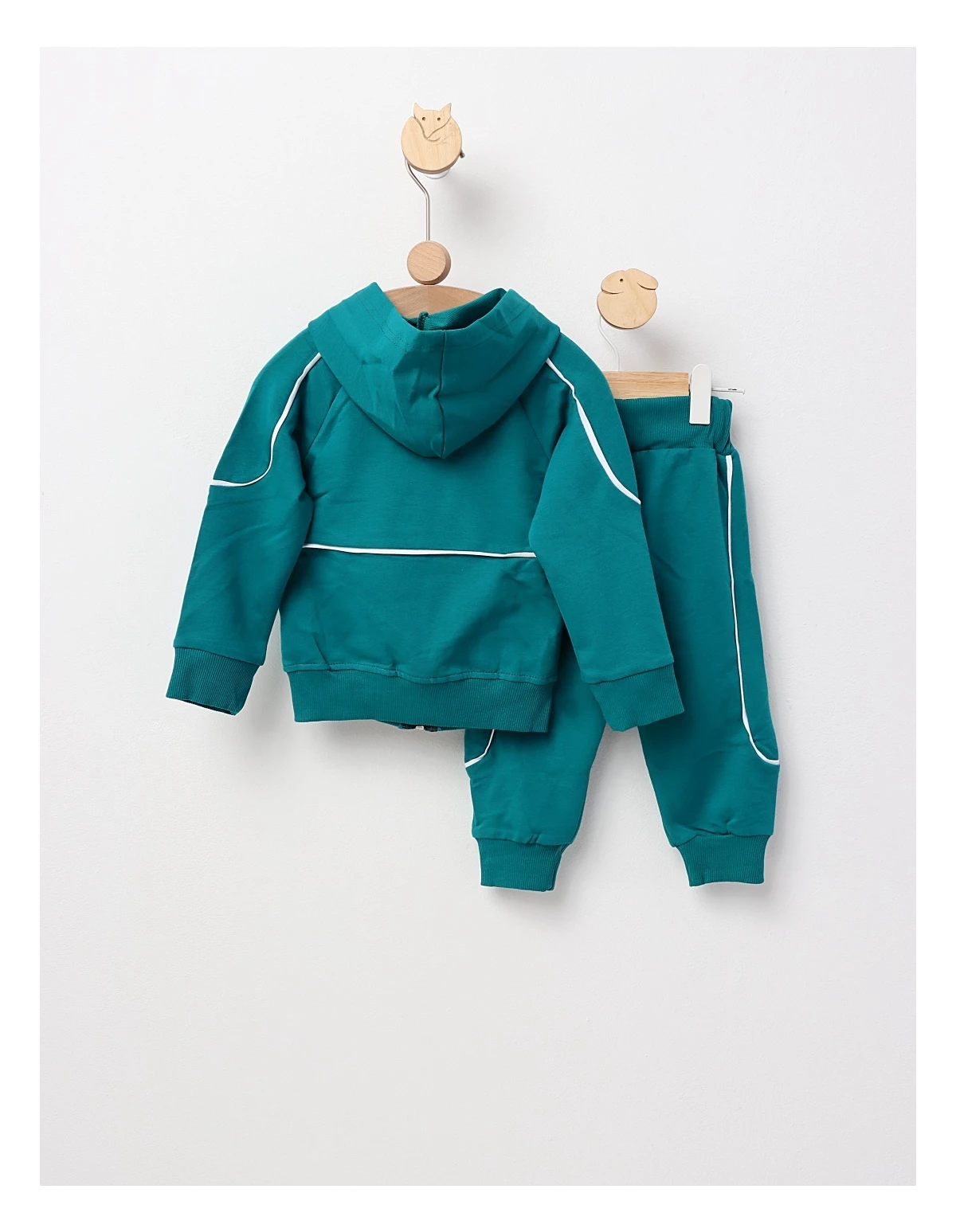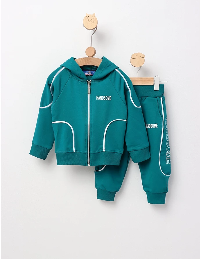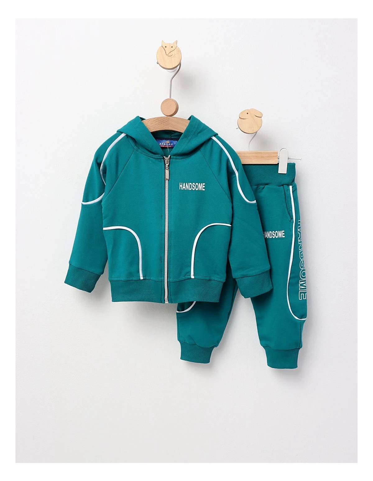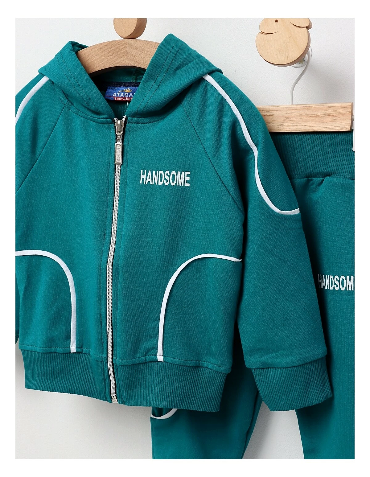 Trening pentru băieți, format dintr-o bluza cu glugă și deschidere în fermoar, decorată cu imprimeu cu mesajul 'Handsome', și pantaloni cu elastic în talie. Confecționat dintr-un material compus din 70% bumbac, 25% poliester și 5% elastan, acest set oferă confort, lejeritate și un stil casual și modern, ideal pentru activități în aer liber, joacă sau momente de relaxare.