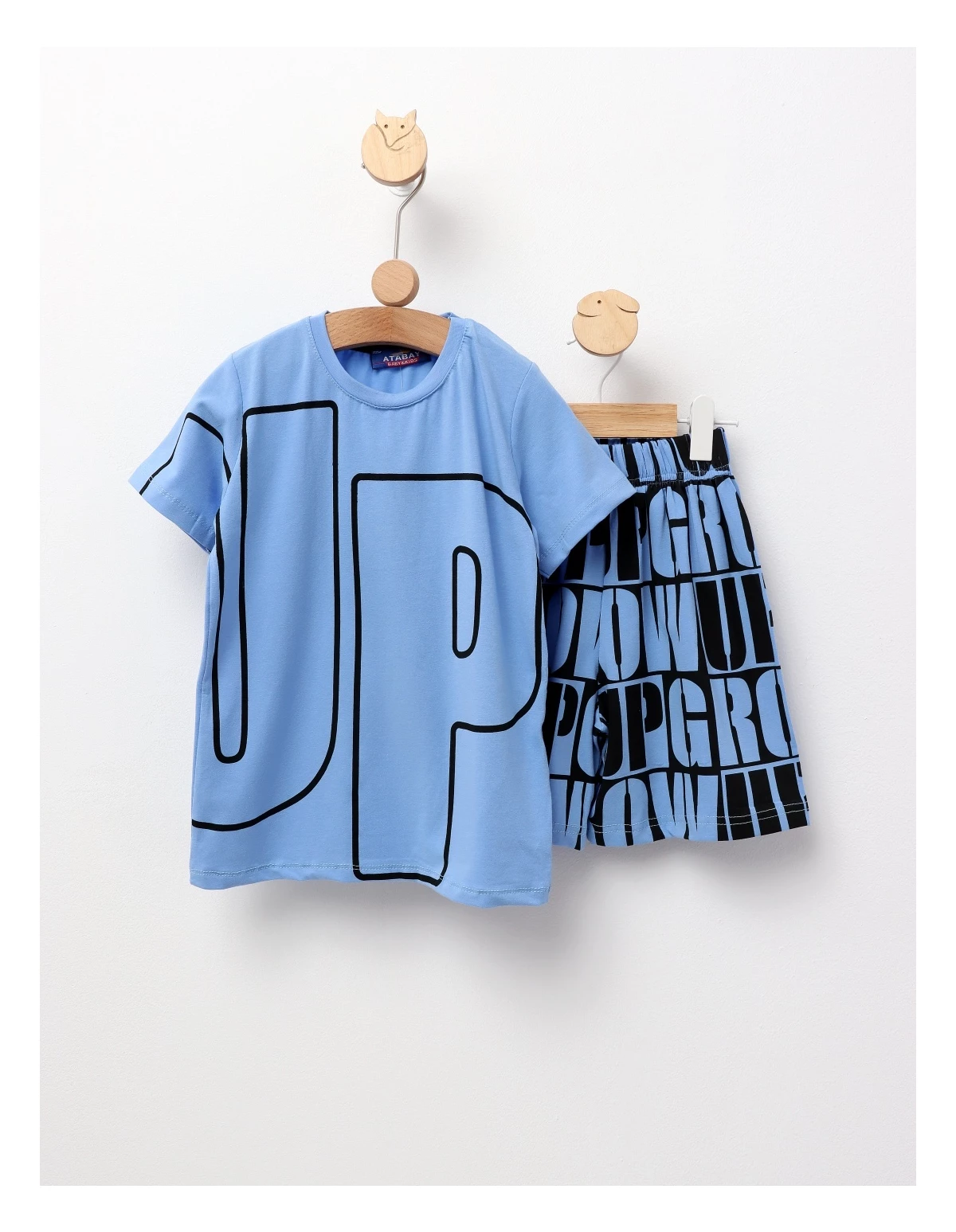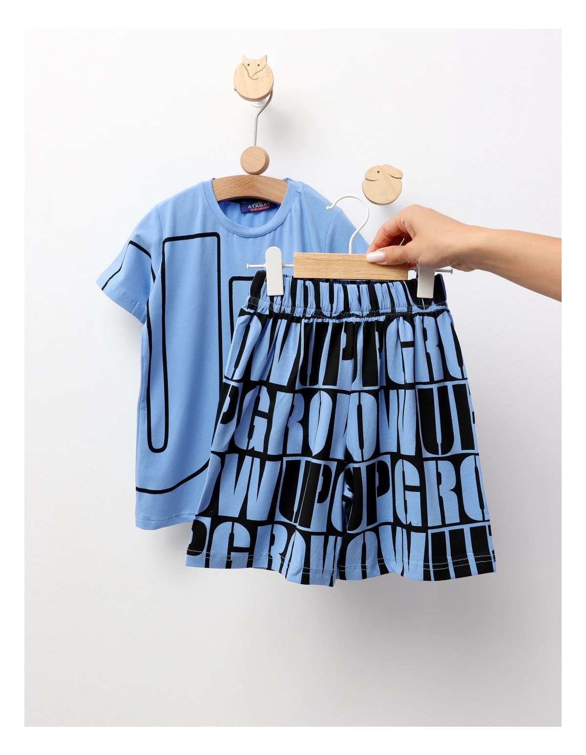 Compleul de vară pentru băieței include un tricou și pantaloni scurți cu elastic în talie, ambele confecționate din 100% bumbac pentru confort maxim. Decorat cu imprimeu cu litere și mesajul 'Grow Up', acest set aduce un stil casual și vesel, perfect pentru zilele calde, plimbări în aer liber sau jocuri în aer liber. O alegere ideală pentru garderoba micuțului tău!