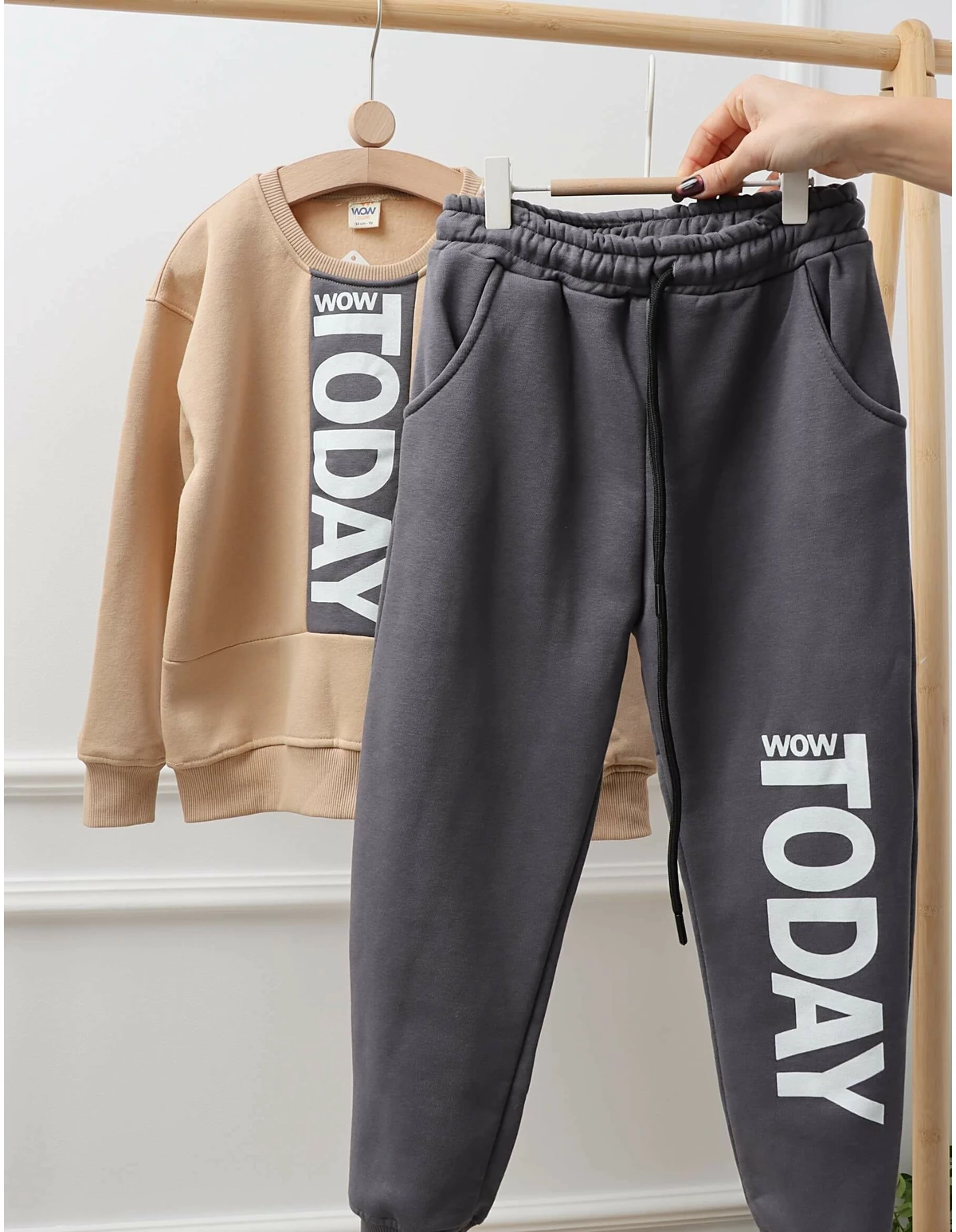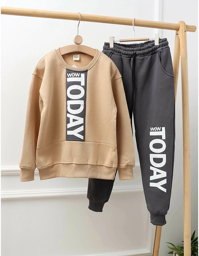 Îmbracă-ți băiețelul în stil și confort cu acest trening ideal pentru zilele răcoroase! Treningul este vatuit pe interior, oferind o senzație călduroasă, confortabilă și pufosă, perfectă pentru joacă. Setul include o bluză cu un imprimeu vesel care spune „Ziua de azi o să fie wow” și pantaloni dotati cu elastic și șnur în talie, plus buzunare pentru un plus de funcționalitate. Fabricat din 100% bumbac de calitate, acest trening asigură respirabilitate și o potrivire excelentă. Ideal pentru plimbări, activități în aer liber sau momente de relaxare acasă, acest outfit va deveni rapid preferatul micuțului tău!