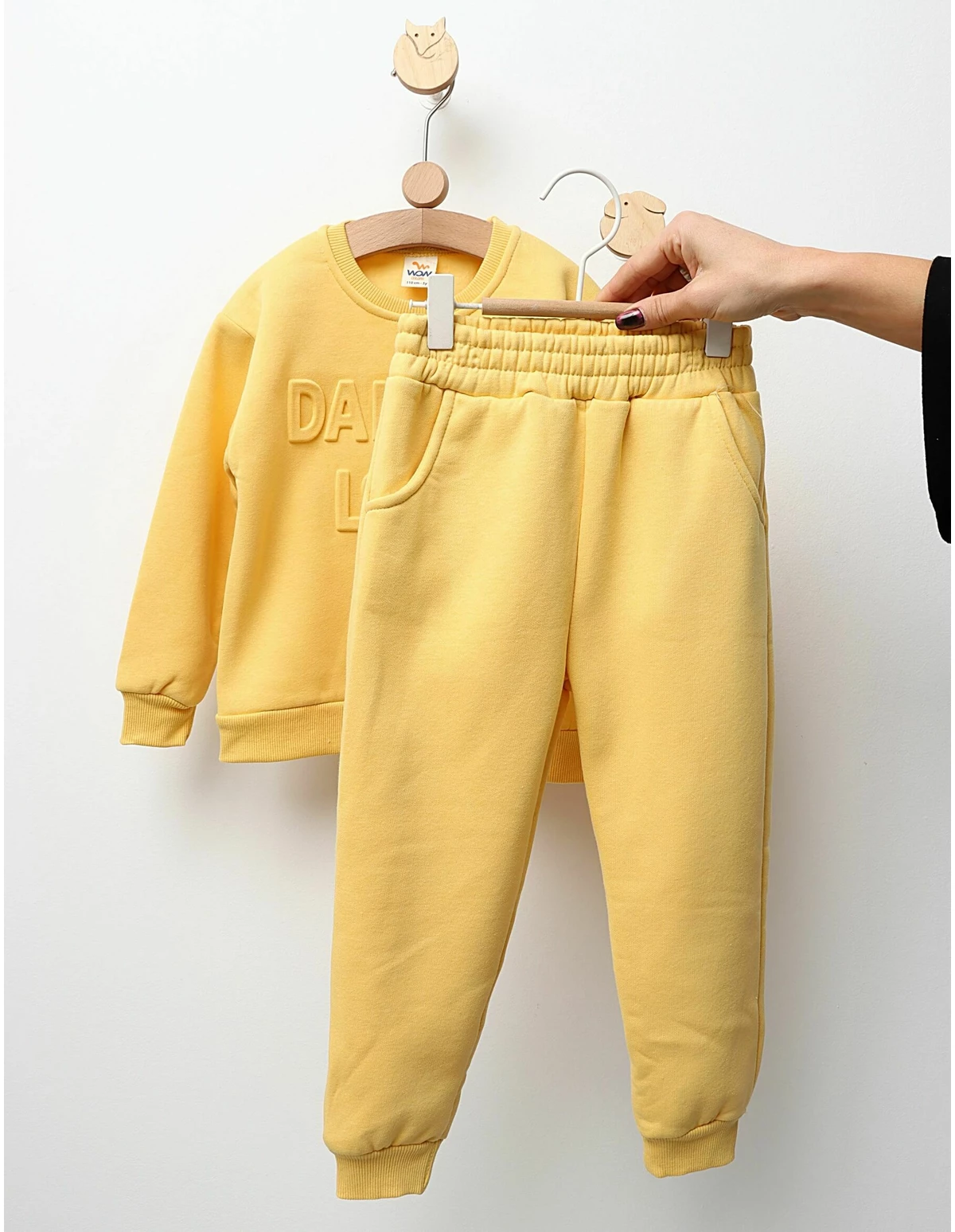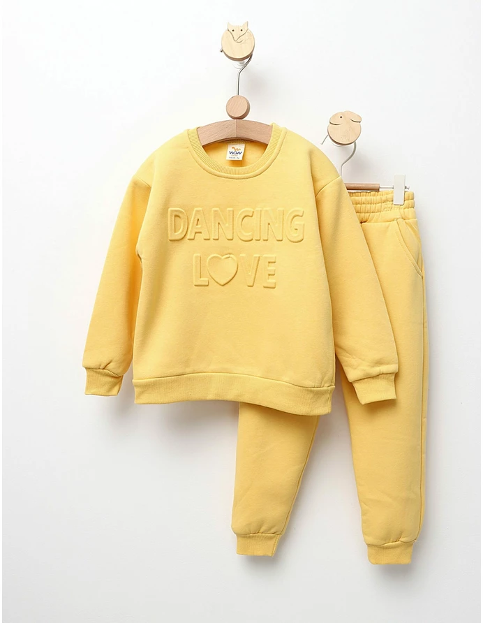 Îmbracă-ți fetița cu acest compleu adorabil, perfect pentru zilele reci! Realizat din material vatuit pe interior, acest set este pufos, călduros și extrem de confortabil. Compleul include o bluză cu un imprimeu 3D jucăuș „Dancing Love”, care adaugă un sentiment de veselie, și pantalonași cu elastic în talie și buzunare pentru o potrivire practică și lejeră. Fabricat din 95% bumbac și 5% poliester, acest material asigură o senzație plăcută pe piele și o libertate de mișcare excelentă. Ideal pentru joacă, plimbări sau momente de relaxare, acest compleu va deveni rapid preferatul micuței tale!