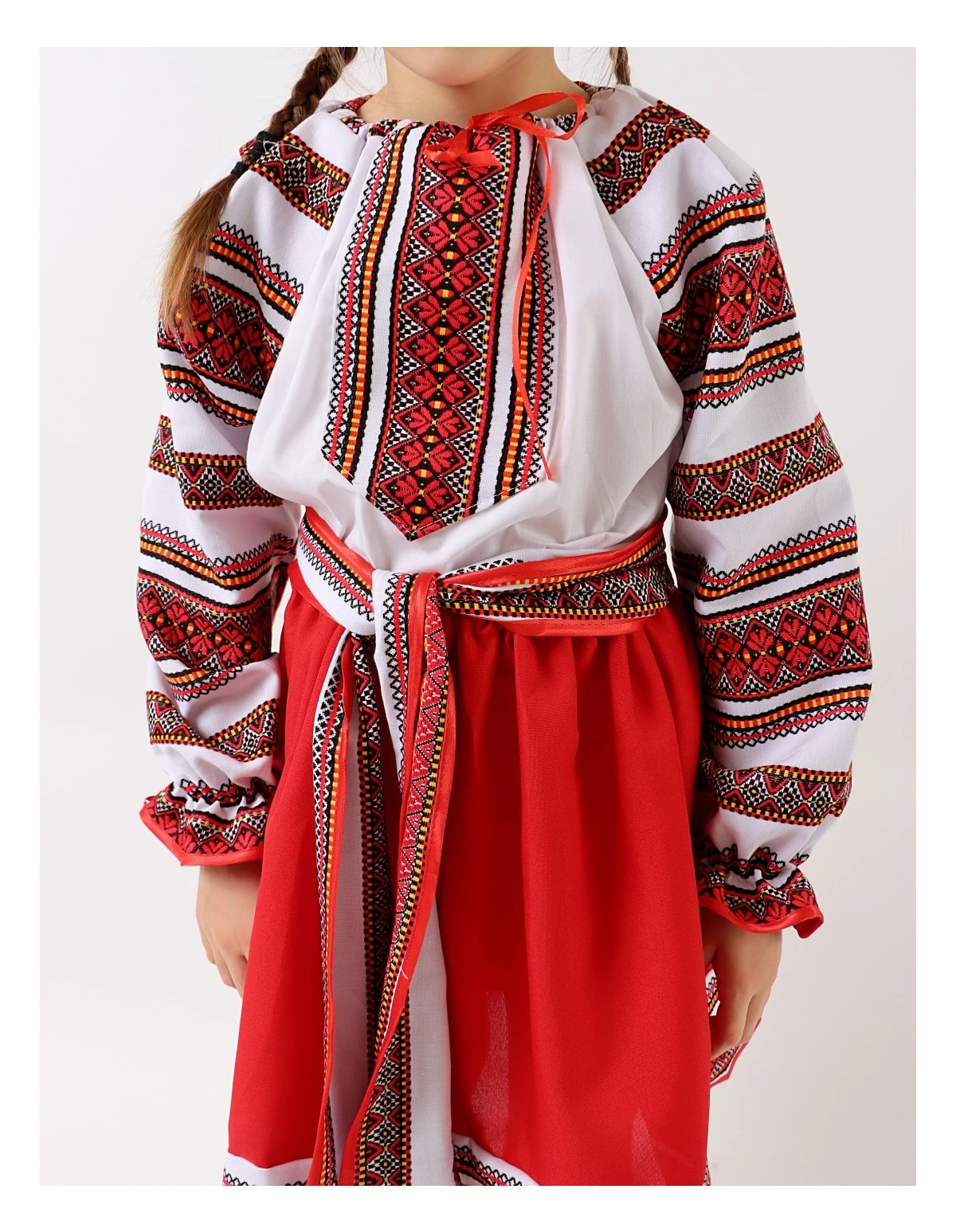 Costum national format din iie cu snur la guler si elastec la maneci; fustita cu elastec in talie; cordon la brau. Material 90% bumbac, 10% poliester.