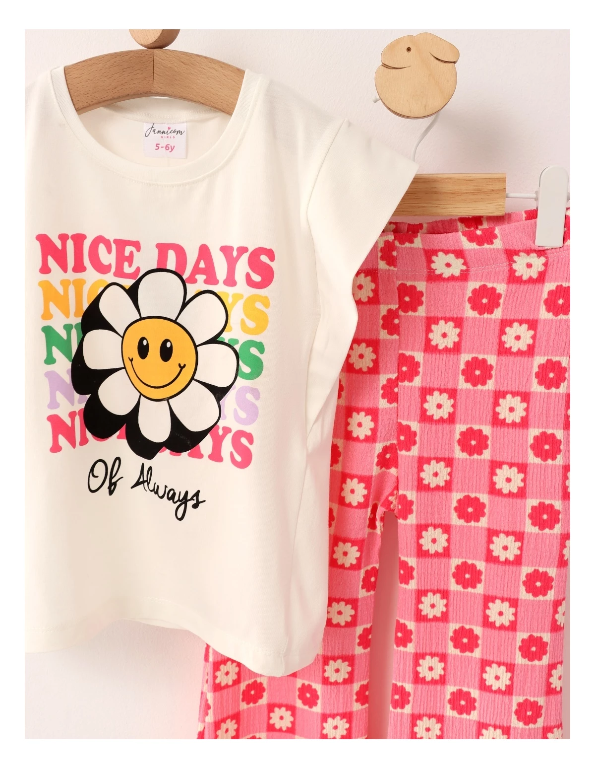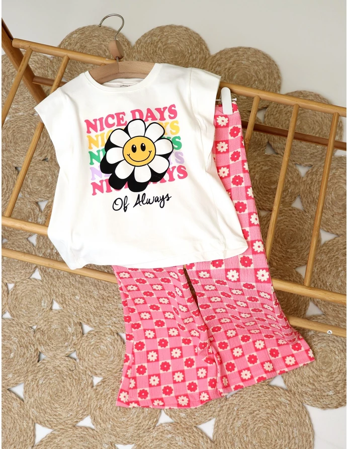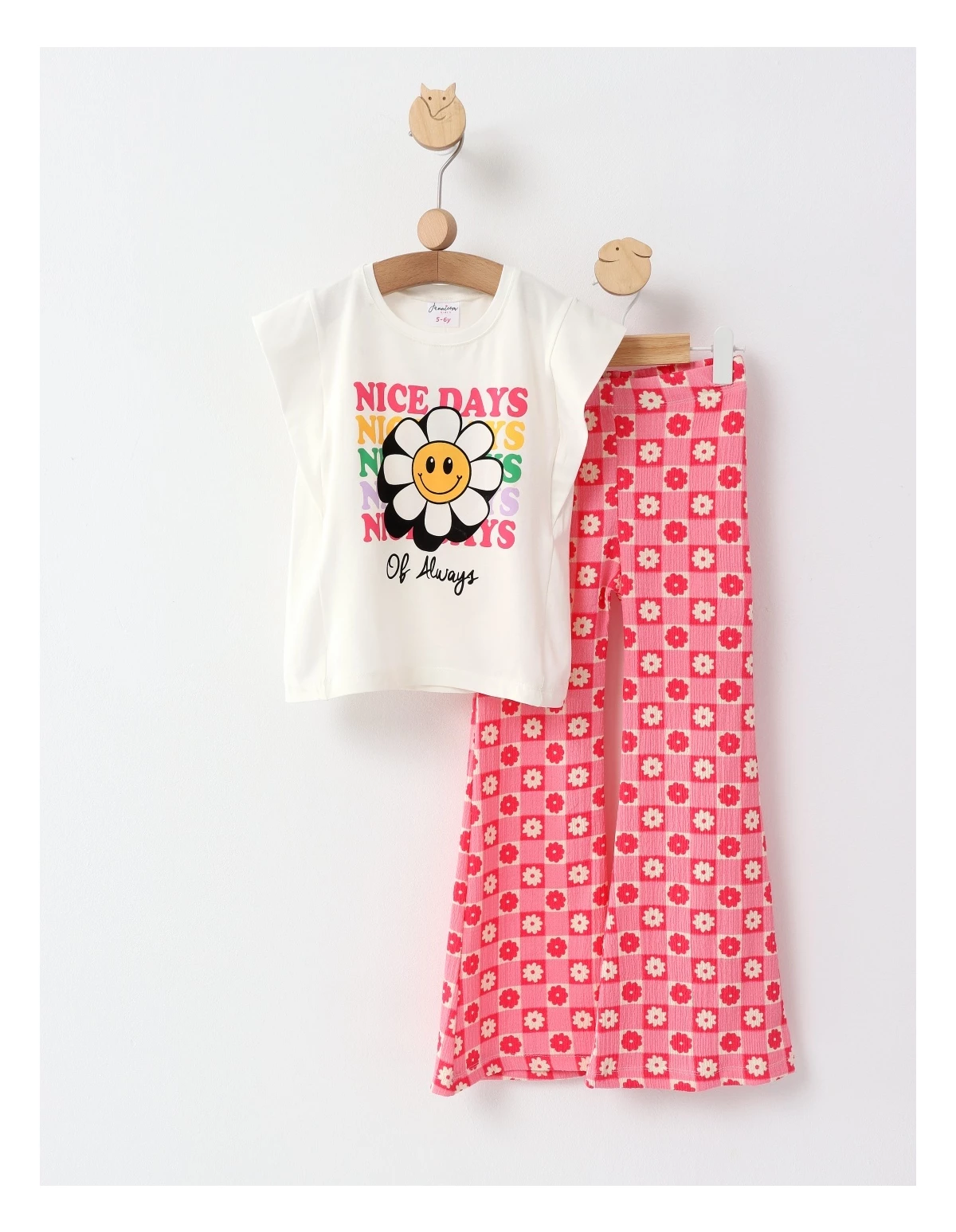 Setul în două piese pentru fetițe include un tricou alb cu mânecă scurtă și imprimeuri jucăușe, și pantaloni evazați colorați cu motive florice. Fabricat din 95% bumbac și 5% licra, acest set oferă confort, libertate de mișcare și un stil vesel, perfect pentru zilele de vară sau activitățile în aer liber.