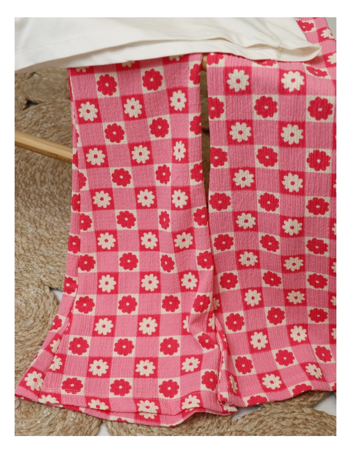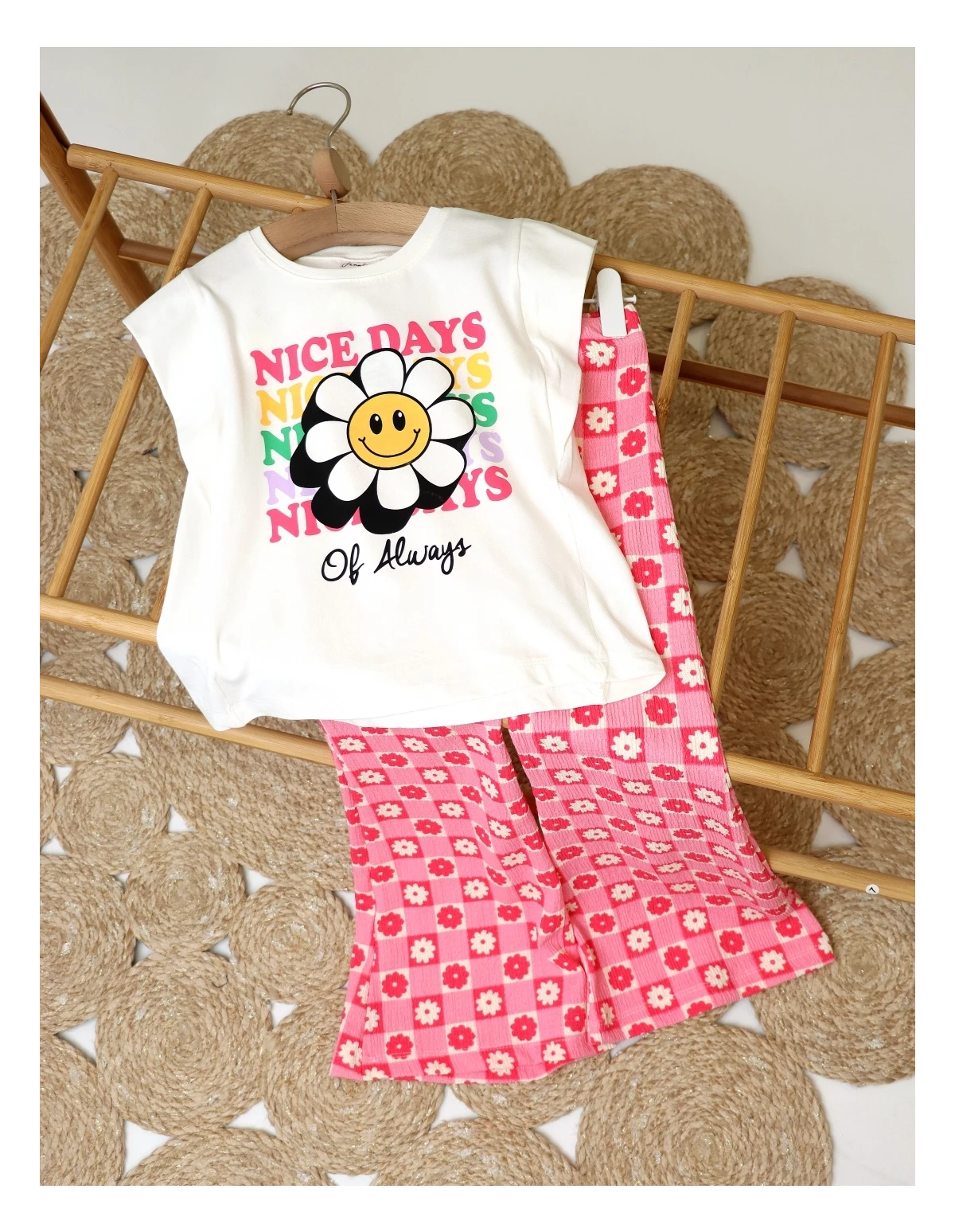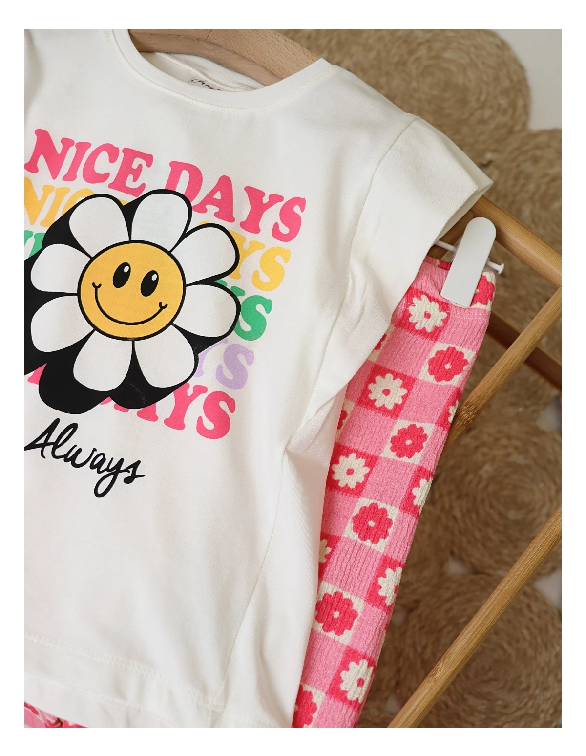 Setul în două piese pentru fetițe include un tricou alb cu mânecă scurtă și imprimeuri jucăușe, și pantaloni evazați colorați cu motive florice. Fabricat din 95% bumbac și 5% licra, acest set oferă confort, libertate de mișcare și un stil vesel, perfect pentru zilele de vară sau activitățile în aer liber.