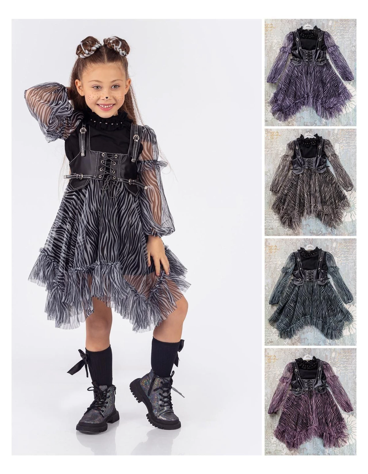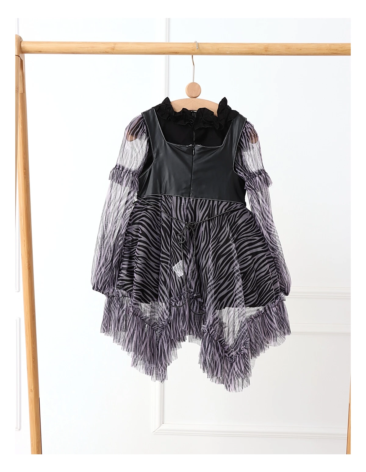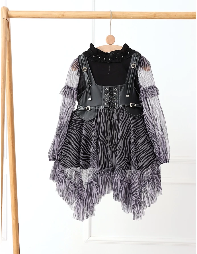 Îmbracă-ți fetița cu acest set elegant și jucăuș, perfect pentru orice ocazie specială! Setul include o rochiță cu bretele stil curea, dotată cu un șnur stil siret și volanase din dantelă, care adaugă un farmec aparte. Rochița are deschidere în fermoar și o jupă pe dedesubt pentru un plus de confort și volum. Bluzita cu mâneci transparente din volanase cu dantelă completează perfect acest outfit, având un nasture pentru o îmbrăcare ușoară. Fabricat din 100% bumbac, acest set asigură confort și respirabilitate, fiind ideal pentru zilele călduroase și petreceri!