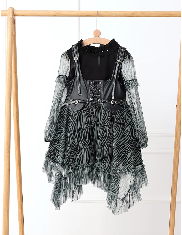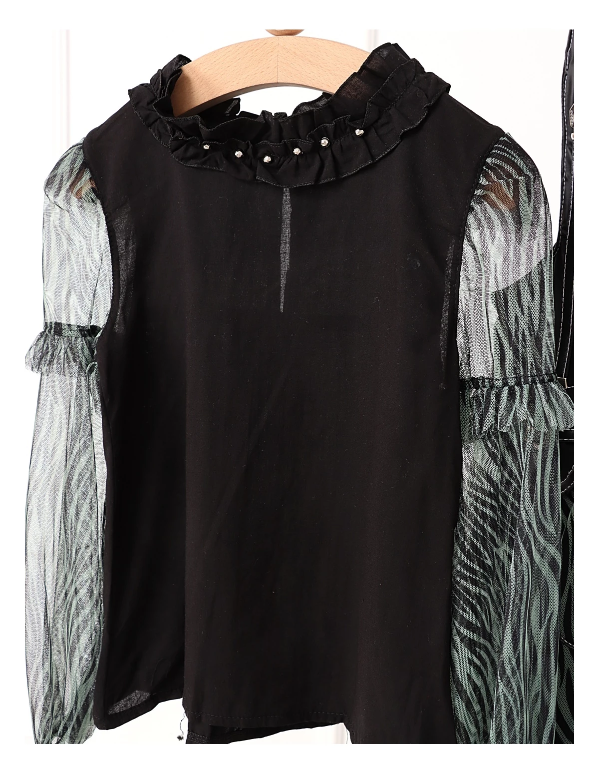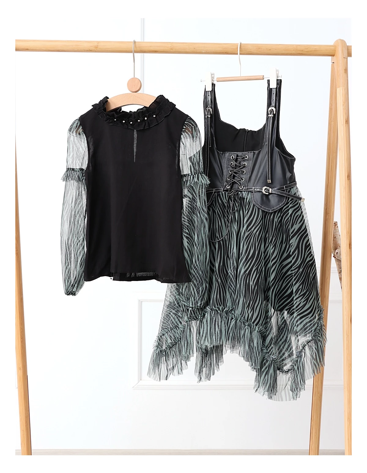 Îmbracă-ți fetița cu acest set elegant și jucăuș, perfect pentru orice ocazie specială! Setul include o rochiță cu bretele stil curea, dotată cu un șnur stil siret și volanase din dantelă, care adaugă un farmec aparte. Rochița are deschidere în fermoar și o jupă pe dedesubt pentru un plus de confort și volum. Bluzita cu mâneci transparente din volanase cu dantelă completează perfect acest outfit, având un nasture pentru o îmbrăcare ușoară. Fabricat din 100% bumbac, acest set asigură confort și respirabilitate, fiind ideal pentru zilele călduroase și petreceri!