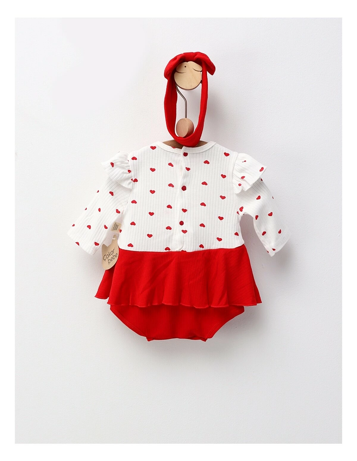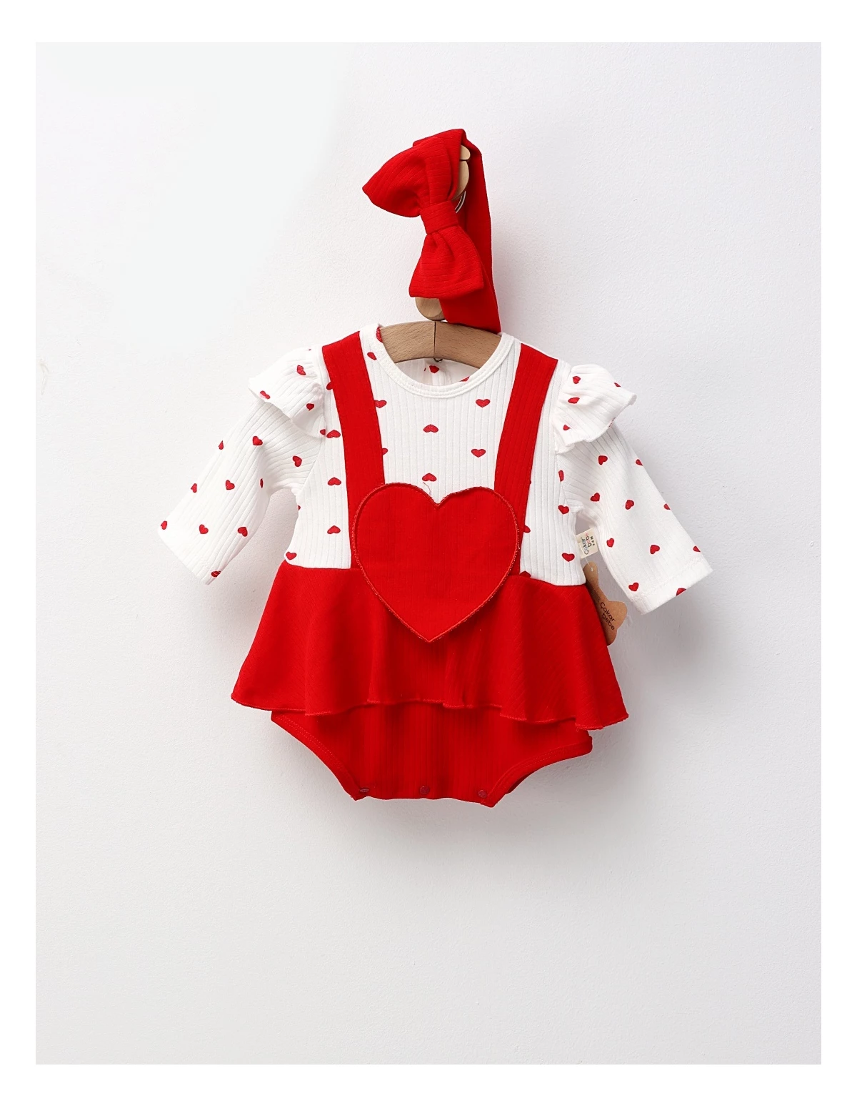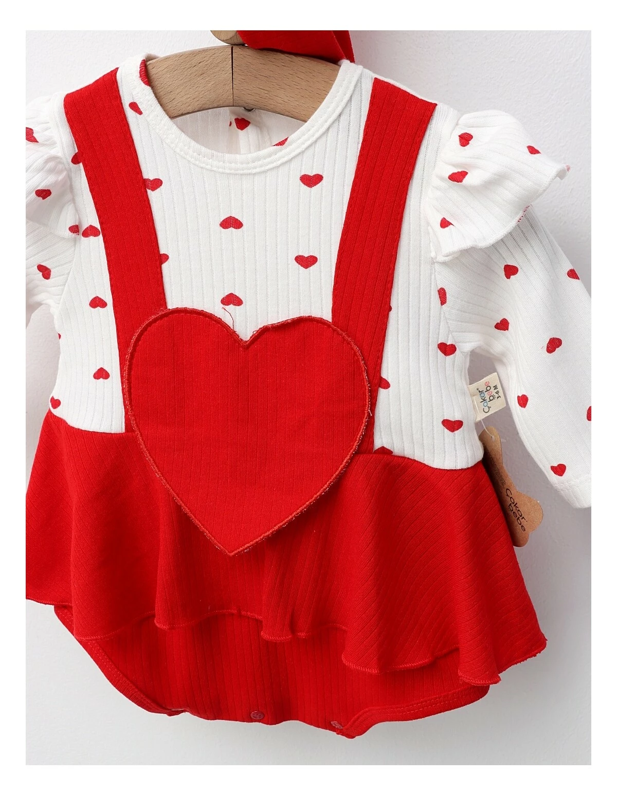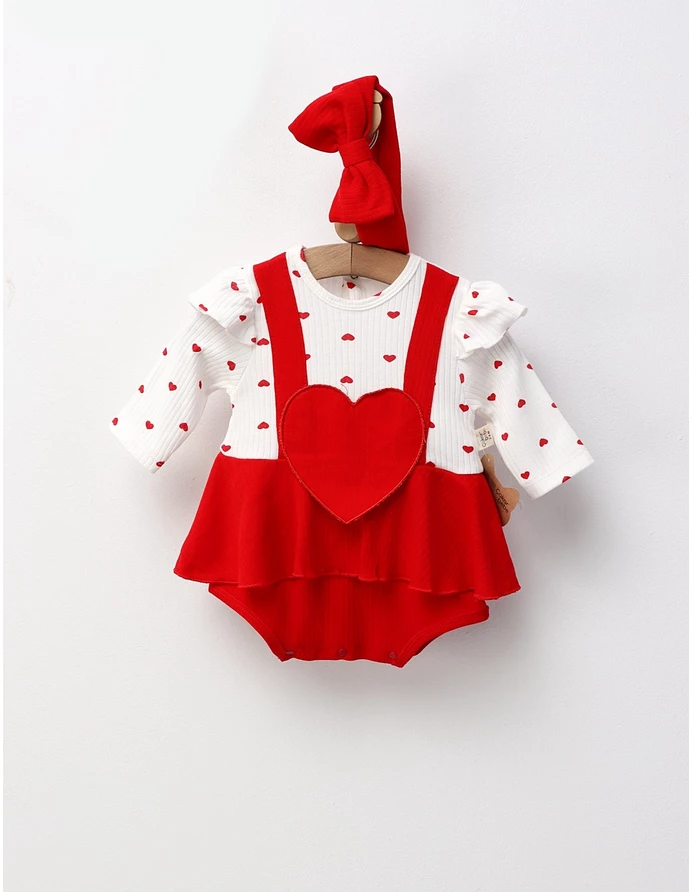 Un model adorabil și delicat, perfect pentru micile prințese! ? Acest body tip rochiță este realizat din 100% bumbac moale, ideal pentru pielea sensibilă a bebelușei. Are închidere cu capse între piciorușe și la spate pentru o îmbrăcare ușoară, volănaș în talie care îi oferă aspectul drăgălaș al unei rochițe și imitație de bretele brodate în material. În partea din față, este decorat cu o inimioară roșie brodată, iar setul este completat de o bentiță cu fundiță asortată, pentru un look perfect și confortabil în același timp.