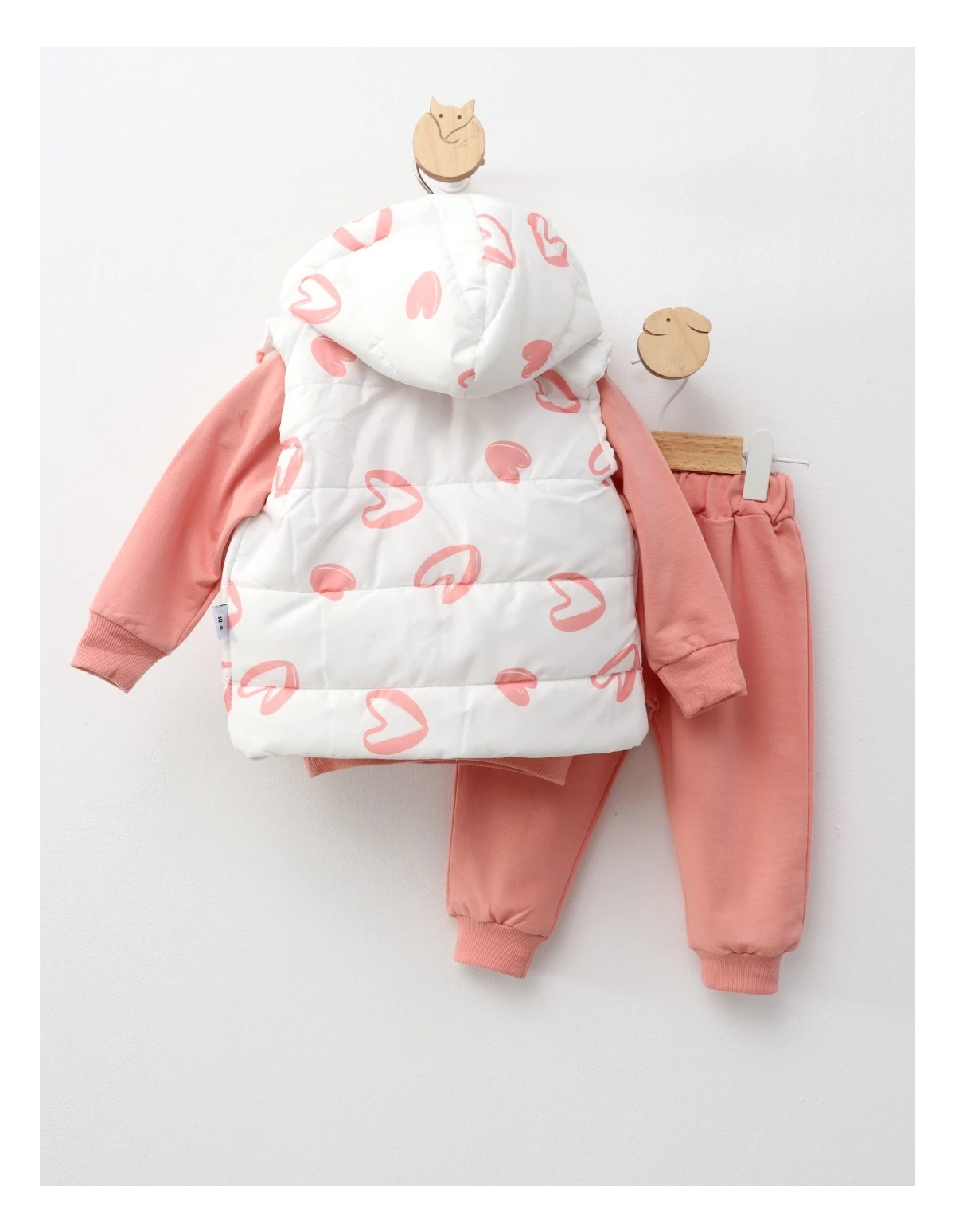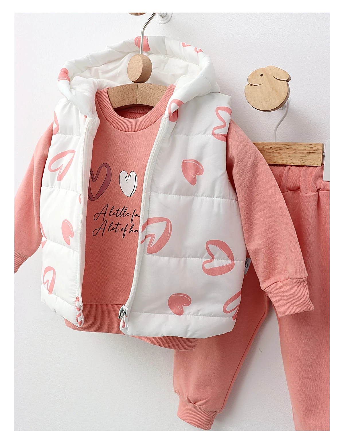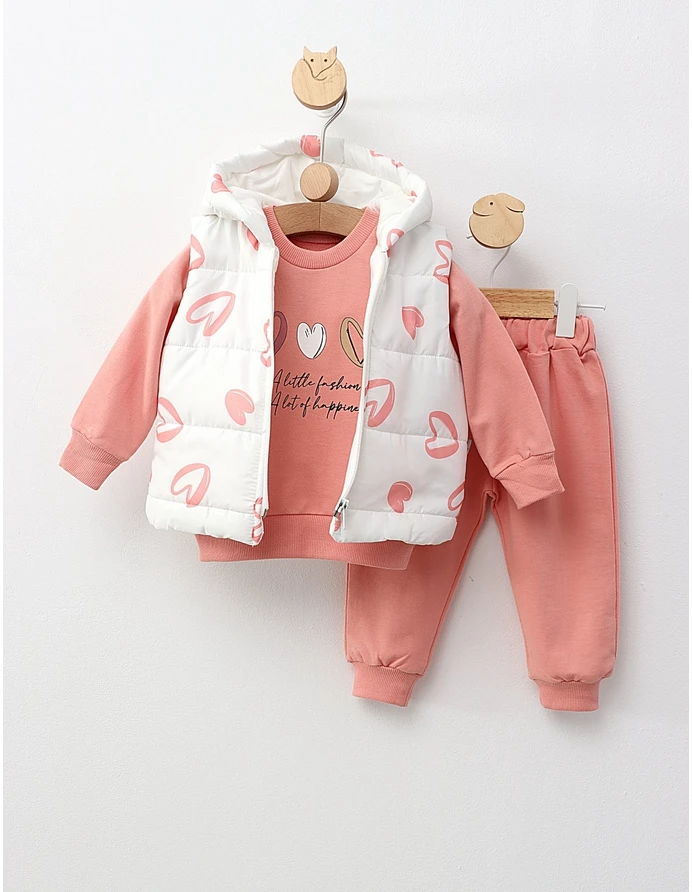 Setul de 3 piese pentru fetițe este ideal pentru primăvară și toamnă, oferind atât stil, cât și confort. Acesta include o vestă cu glugă și deschidere cu fermoar, realizată din fâș pe exterior și bumbac pe interior, asigurând protecție și căldură în zilele răcoroase. Vestă este împodobită cu un imprimeu jucăuș cu 'inimioare', adăugând un strop de farmec. Setul mai conține o bluză și pantaloni asortați, toate fabricate din 100% bumbac, pentru o senzație plăcută pe pielea delicată a fetițelor. Acest set versatil este perfect pentru joacă, ieșiri și momente speciale, fiind o alegere excelentă pentru garderoba micuței tale. Copy Regenerate