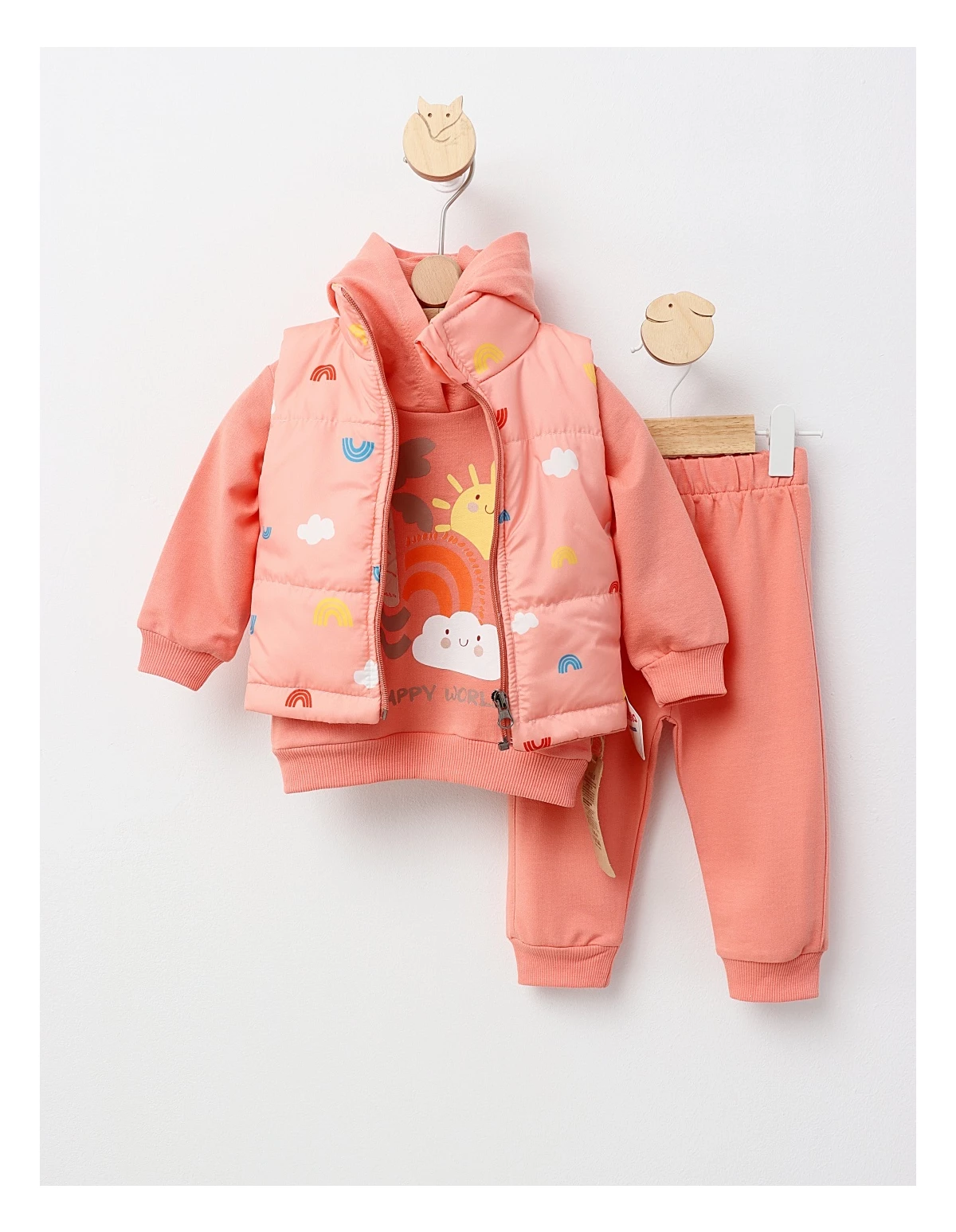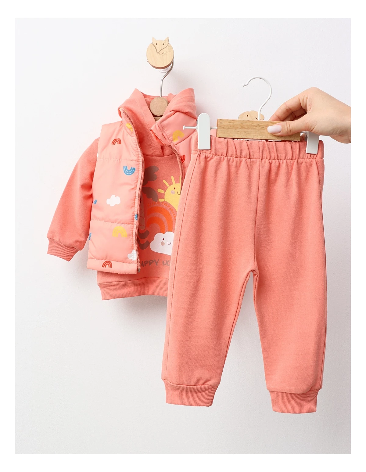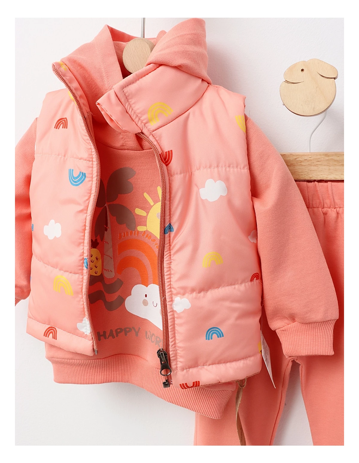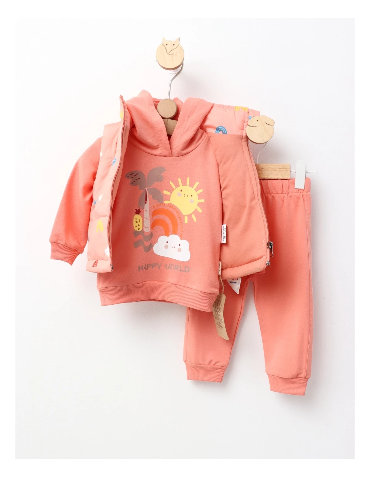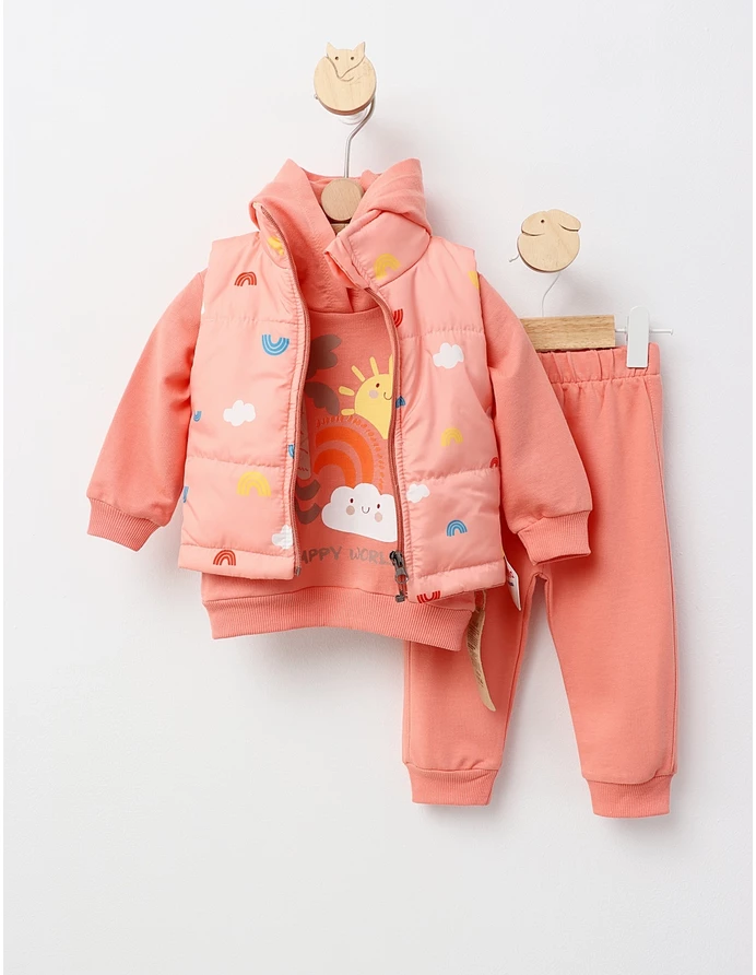 Setul de 3 piese pentru copii include o vestă din fâș cu bumbac pe interior, un hanorac cu glugă și pantaloni cu elastic în talie. Vesta are deschidere cu fermoar, iar imprimeul "happy world" aduce un strop de bucurie. Confectionat din 100% bumbac, acest set oferă confort și stil, fiind ideal pentru joacă sau ieșiri în aer liber.