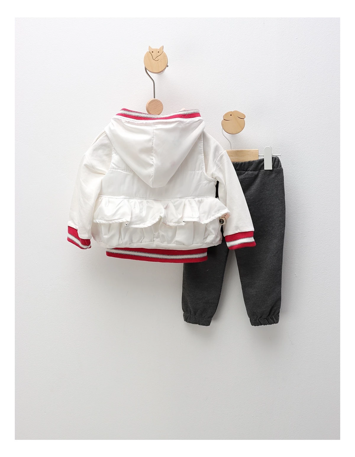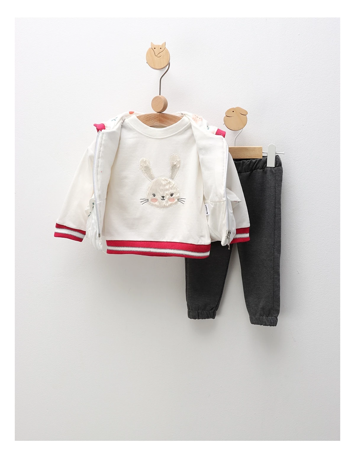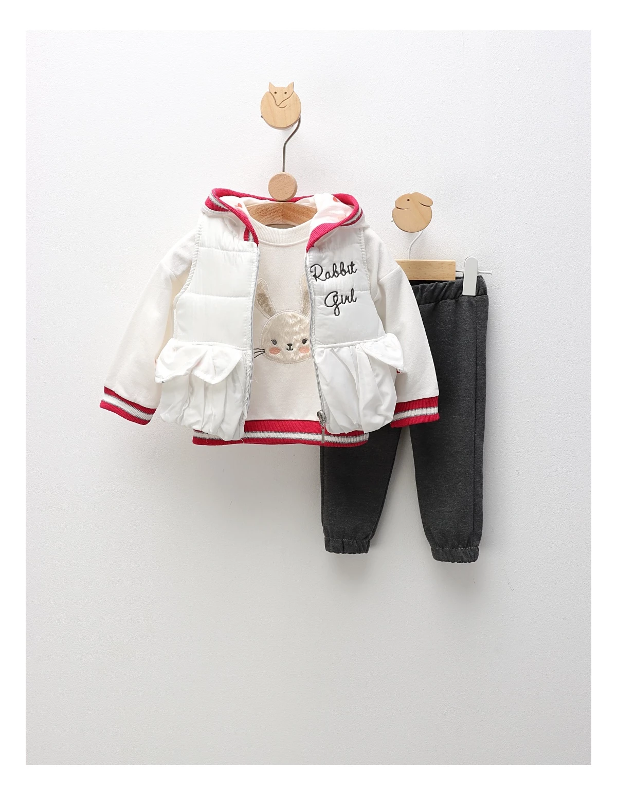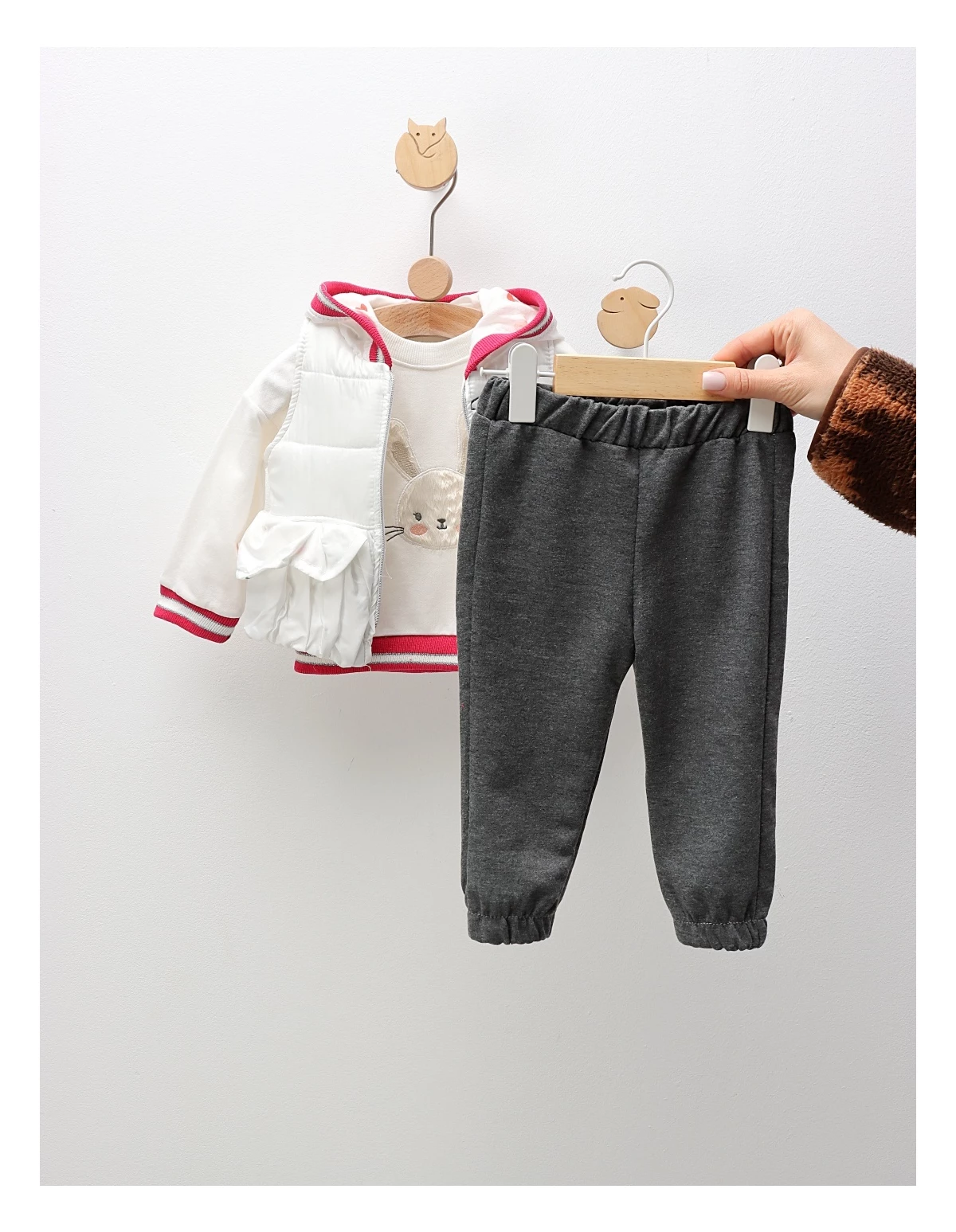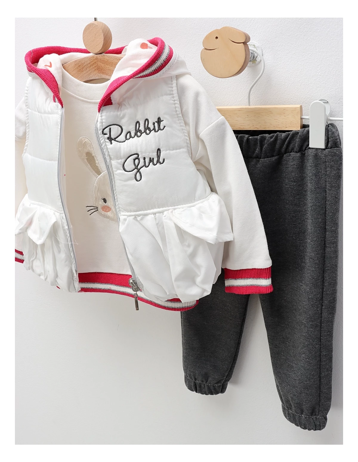 Îmbracă-ți copilul în acest compleu adorabil, perfect pentru zilele răcoroase! Setul este format dintr-o vestă cu deschidere în fermoar și glugă, decorată cu un imprimeu drăgălaș cu 'Rabbit Girl', având o căptușeală din fâș pe exterior și bumbac pe interior pentru un plus de confort. Bluza cu mânecă lungă prezintă deschidere în capse pe umăr, împodobită cu un imprimeu cu iepuraș, care oferă un aspect jucăuș și vesel. Pantalonașii sunt prevăzuți cu elastic în talie, asigurând o potrivire lejeră și confortabilă. Fabricat din 100% bumbac de calitate, acest compleu este disponibil în mărimile de la 9 la 18 luni, fiind alegerea ideală pentru micuțul tău în fiecare zi!