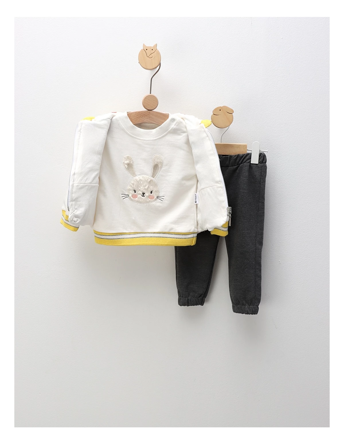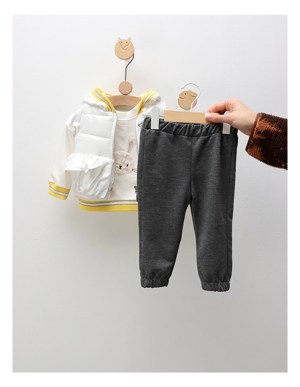 Îmbracă-ți copilul în acest compleu adorabil, perfect pentru zilele răcoroase! Setul este format dintr-o vestă cu deschidere în fermoar și glugă, decorată cu un imprimeu drăgălaș cu 'Rabbit Girl', având o căptușeală din fâș pe exterior și bumbac pe interior pentru un plus de confort. Bluza cu mânecă lungă prezintă deschidere în capse pe umăr, împodobită cu un imprimeu cu iepuraș, care oferă un aspect jucăuș și vesel. Pantalonașii sunt prevăzuți cu elastic în talie, asigurând o potrivire lejeră și confortabilă. Fabricat din 100% bumbac de calitate, acest compleu este disponibil în mărimile de la 9 la 18 luni, fiind alegerea ideală pentru micuțul tău în fiecare zi!
