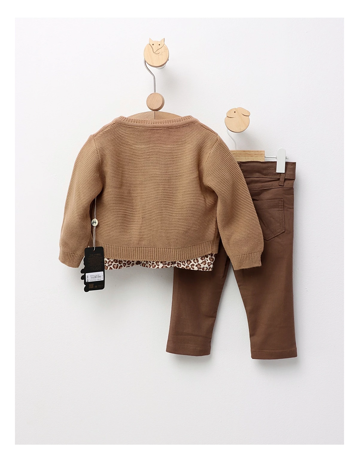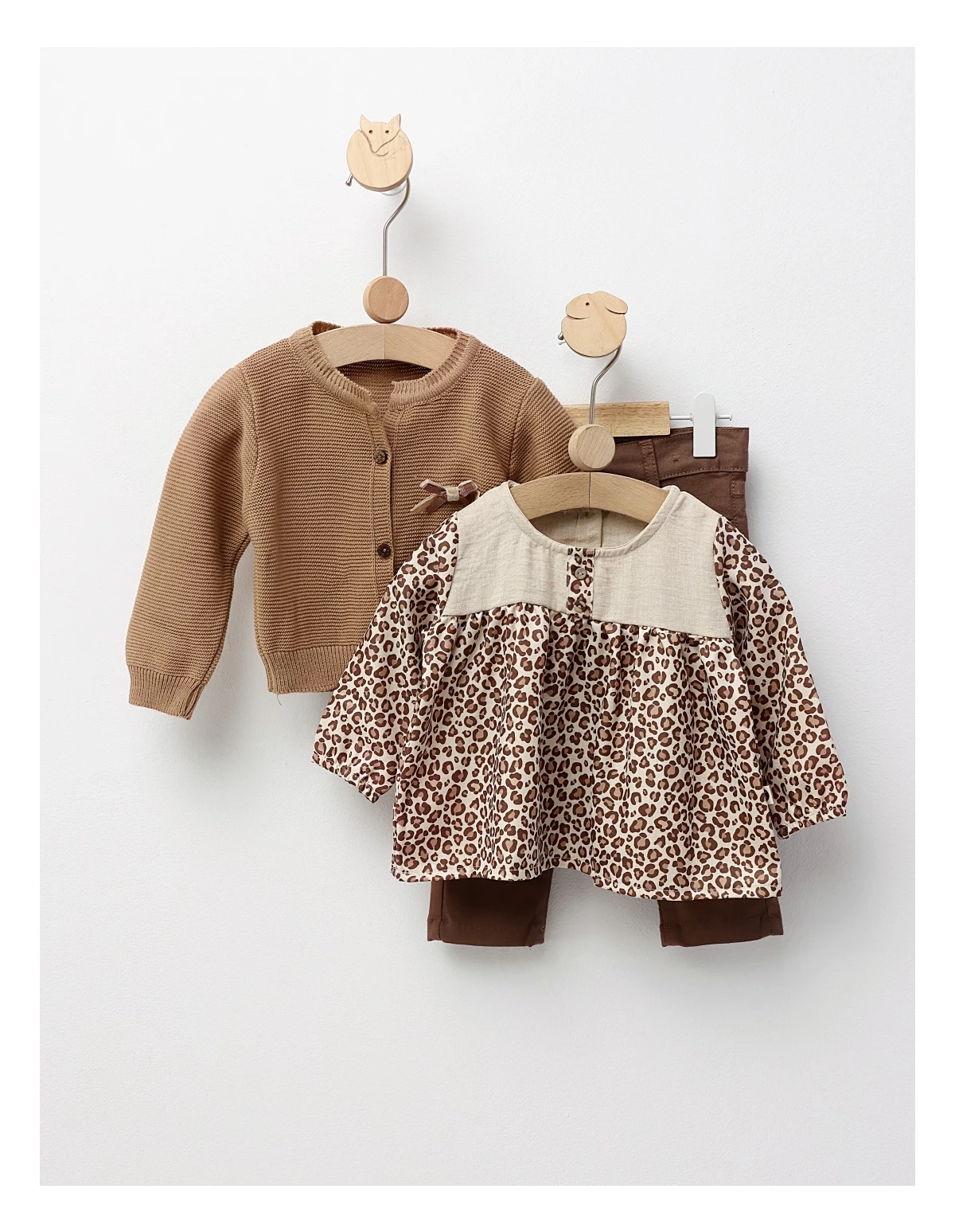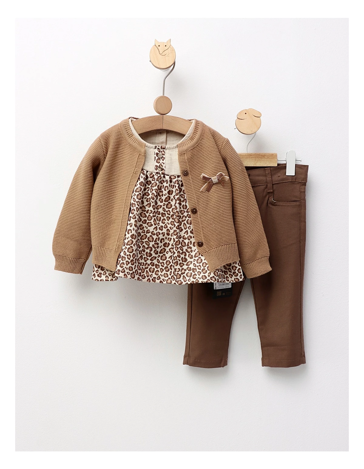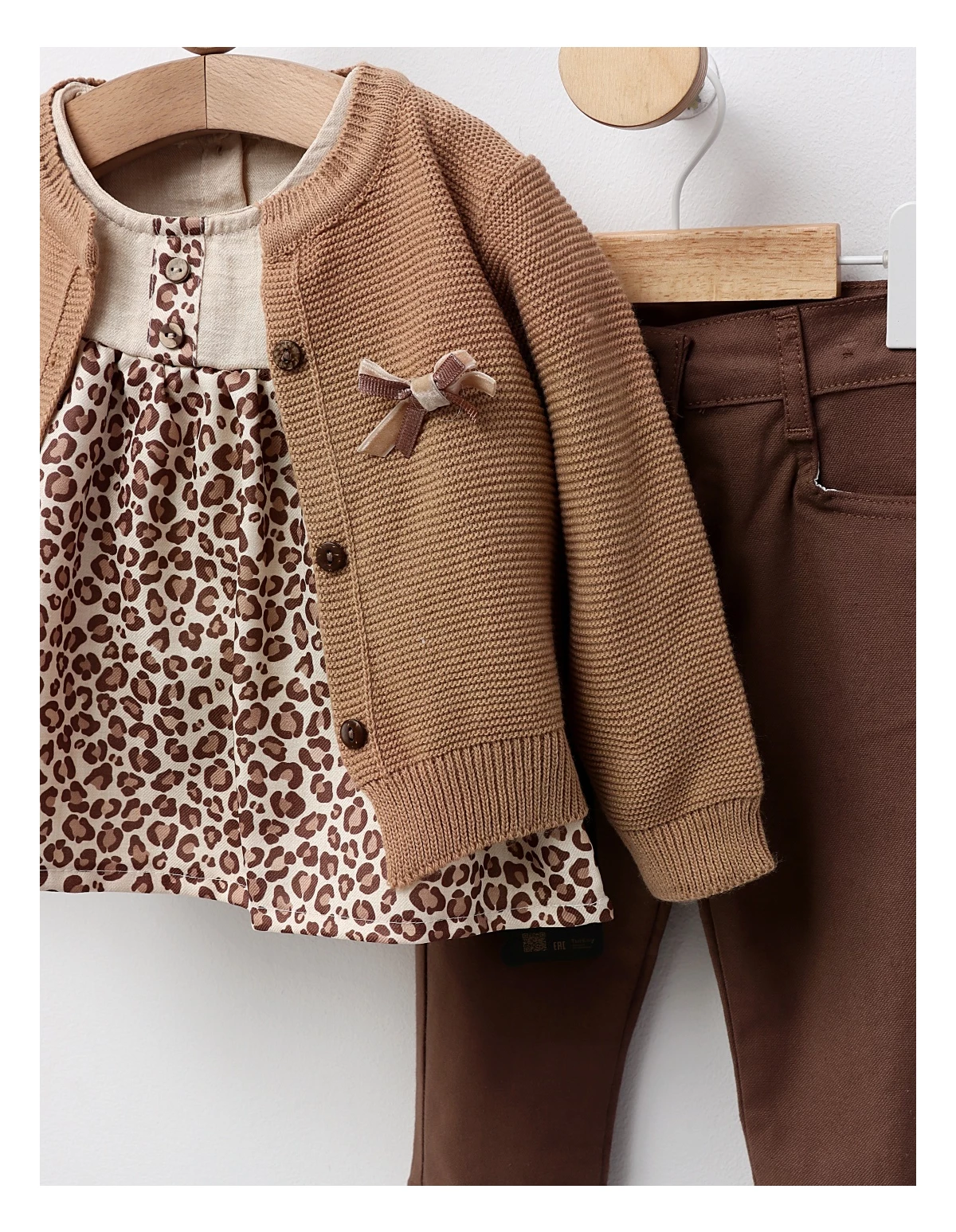 Compleu premium și elegant pentru fetițe, format dintr-un puloveras cu deschidere în nasturi și design croșetat rafinat, o bluză cu un stil unic în leopard print și pantaloni din tercot, eleganți și confortabili. Confecționat din 100% bumbac, acest set adaugă stil și rafinament oricărei ținute, perfect pentru ocazii speciale, zile festive sau evenimente importante.