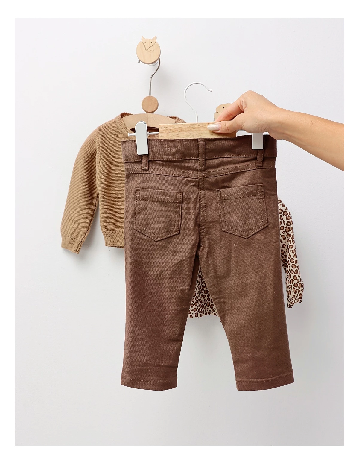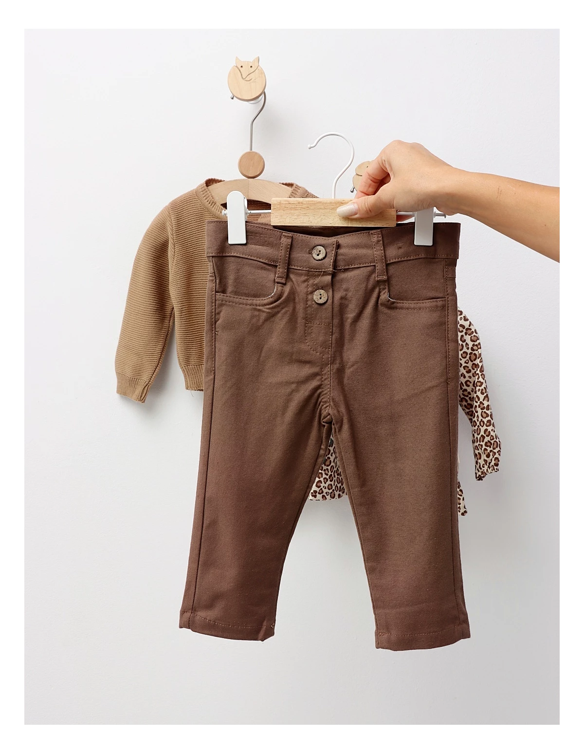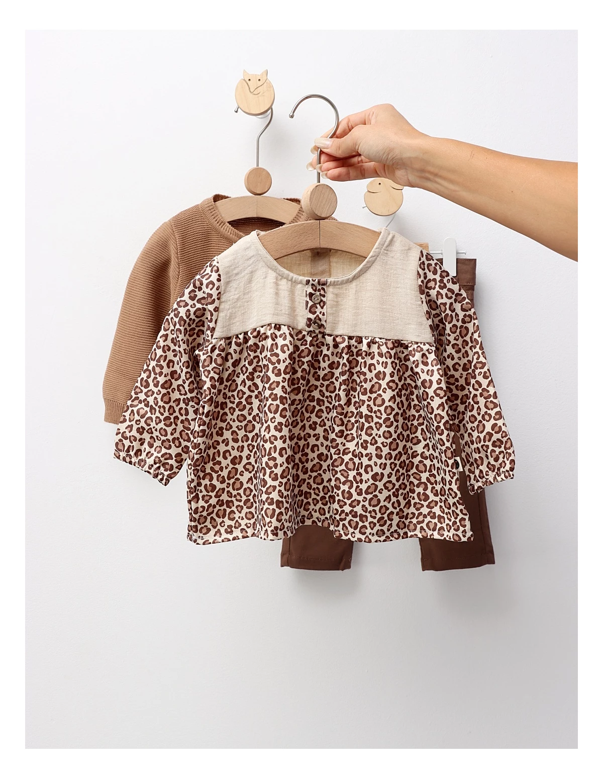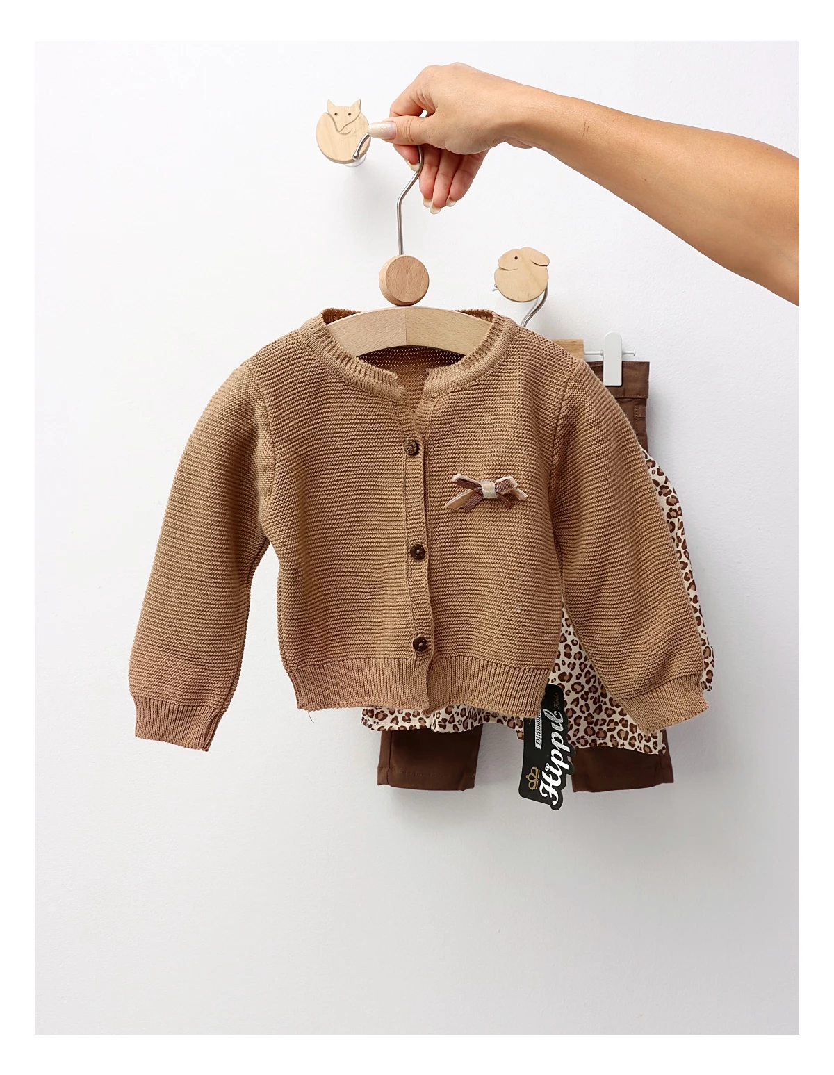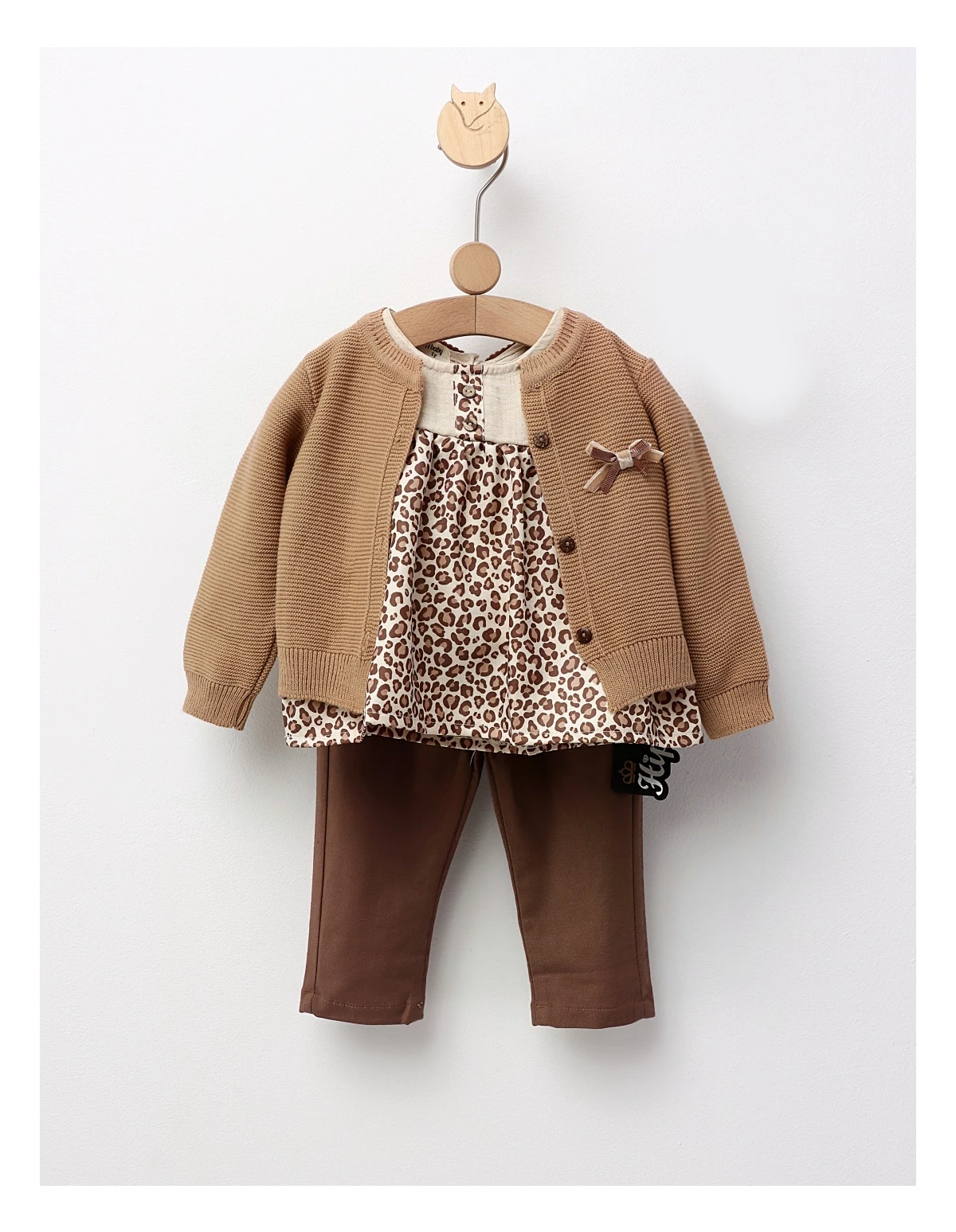 Compleu premium și elegant pentru fetițe, format dintr-un puloveras cu deschidere în nasturi și design croșetat rafinat, o bluză cu un stil unic în leopard print și pantaloni din tercot, eleganți și confortabili. Confecționat din 100% bumbac, acest set adaugă stil și rafinament oricărei ținute, perfect pentru ocazii speciale, zile festive sau evenimente importante.