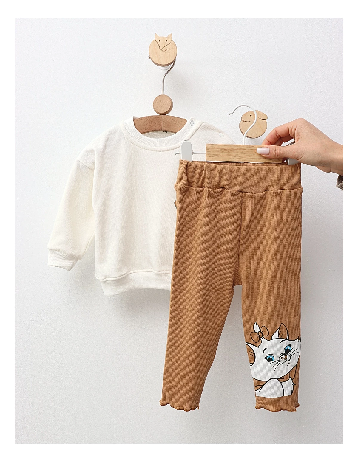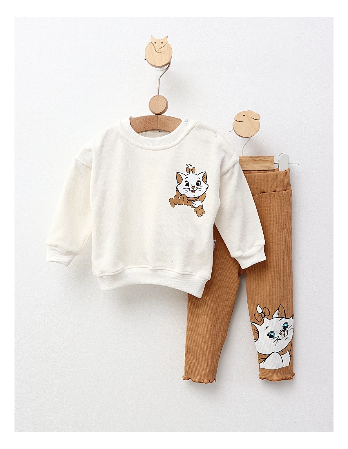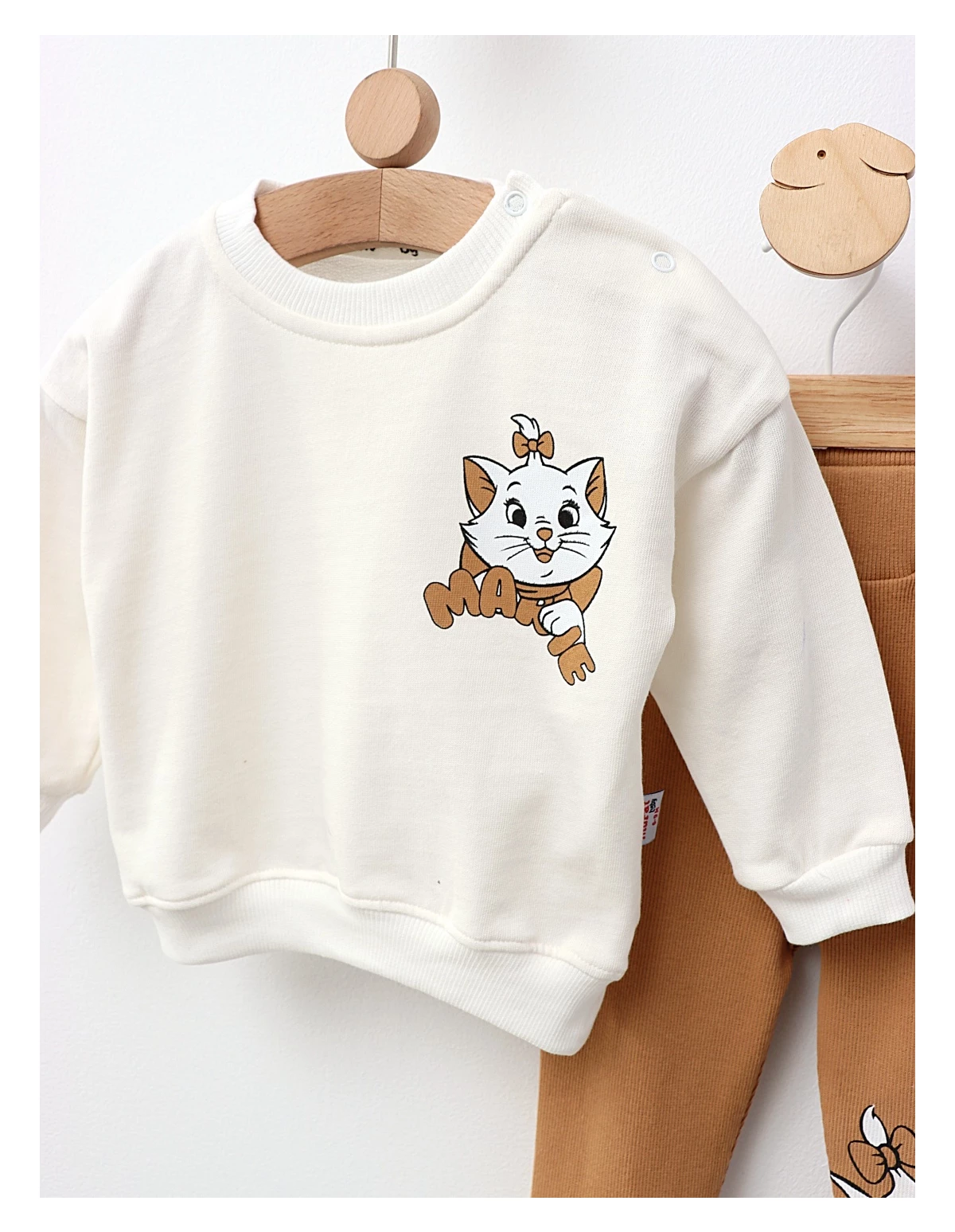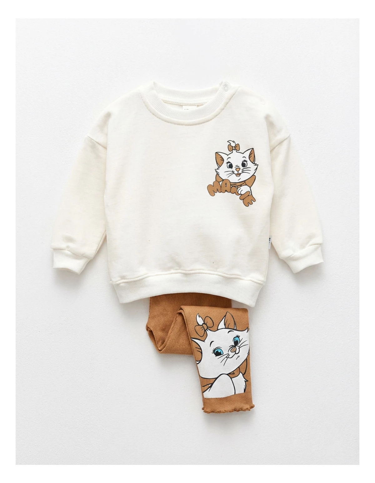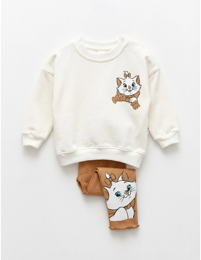 Compleul pentru fetițe, de calitate premium și design modern, include o bluză cu deschidere în capse pe umăr, decorată cu un imprimeu cu Marie din 'Pisicile Aristocrate', și pantaloni stil colanți cu un imprimeu mare al pisicuței Marie. Fabricat din 100% bumbac, acest set oferă confort și stil, fiind perfect pentru micile stiliste!